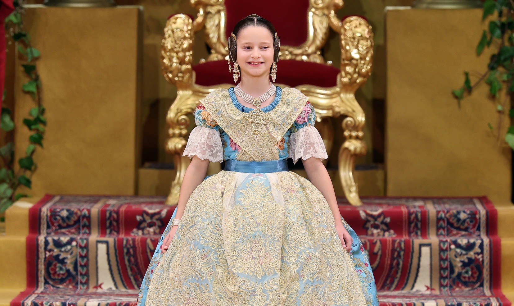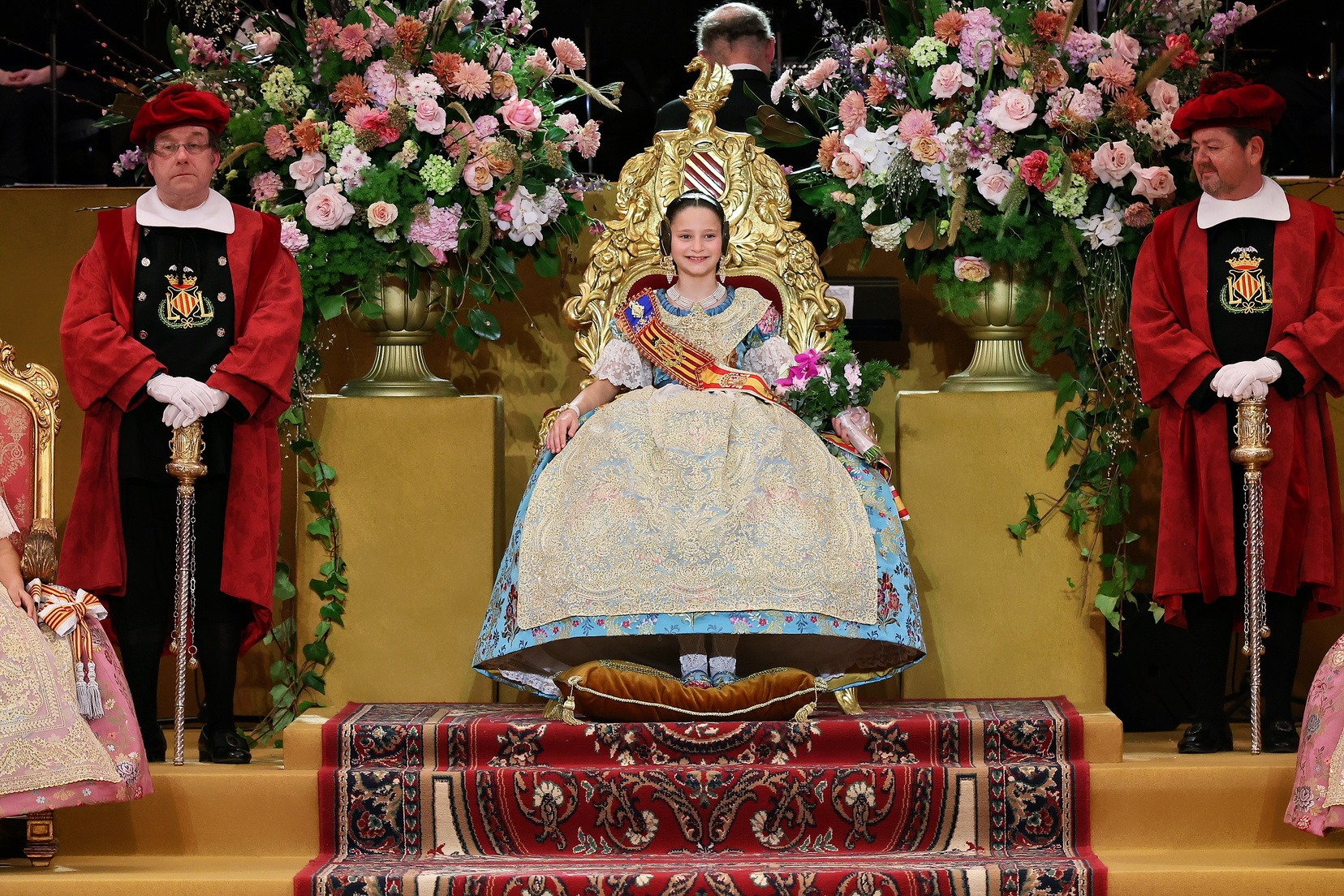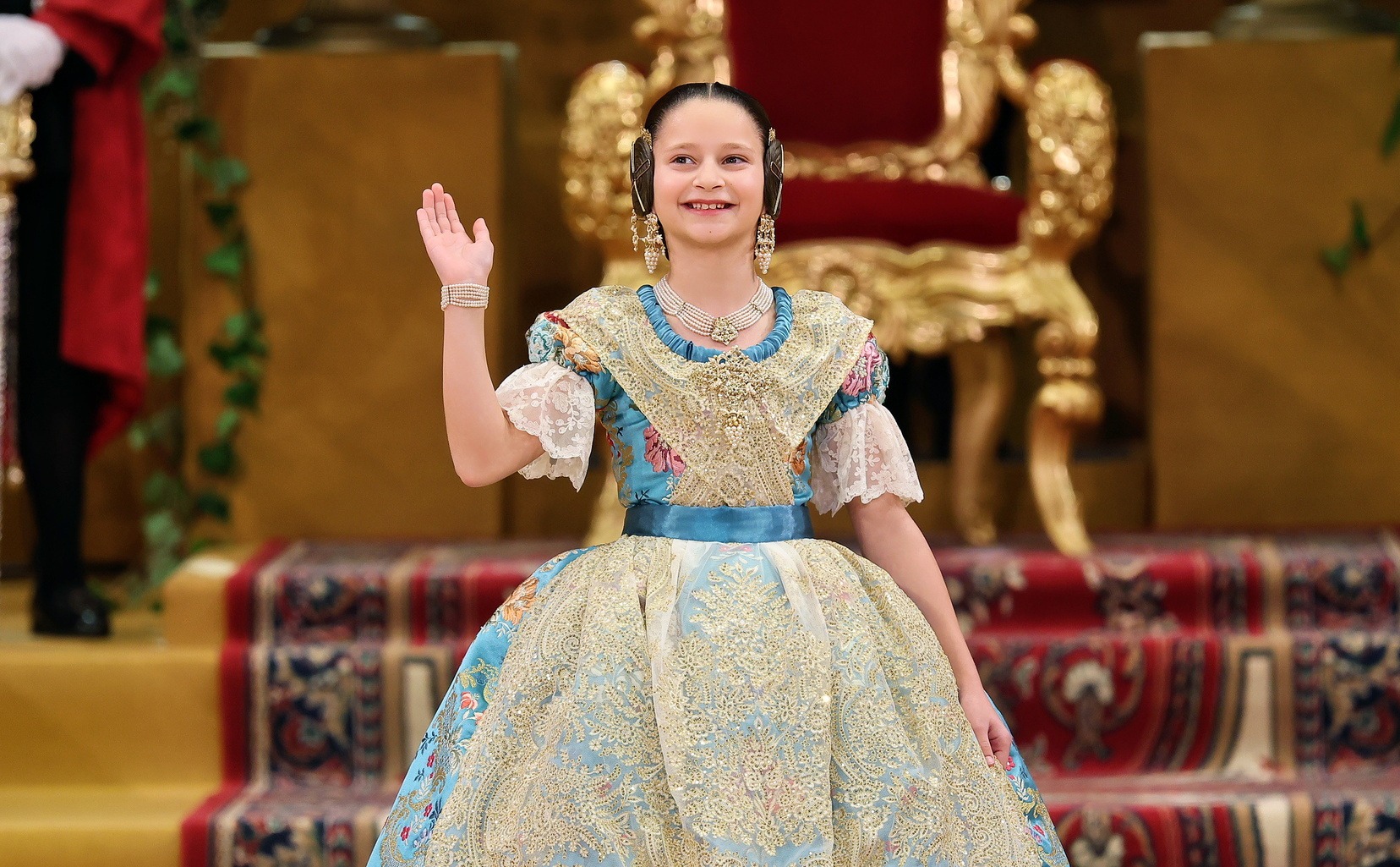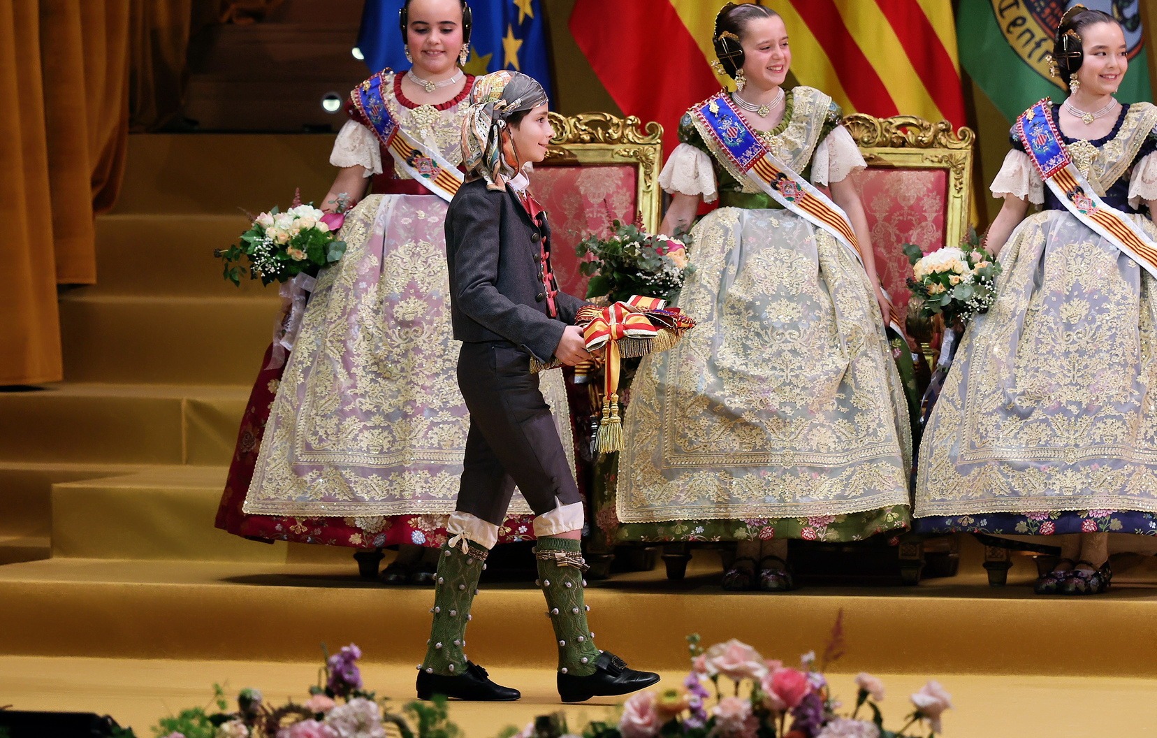 Després de la imposició de bandes a la Cort d’Honor Infantil, la veu de Reis Juan ha recitat les paraules que precedien al moment més esperat de tota la vesprada, «..pel conjunt de virtuts que atesora i que la fan dignísima portadora de nostra més alta representació, rindam homenatge d’amor i pleitesia a la Fallera Major Infantil de València (…)”