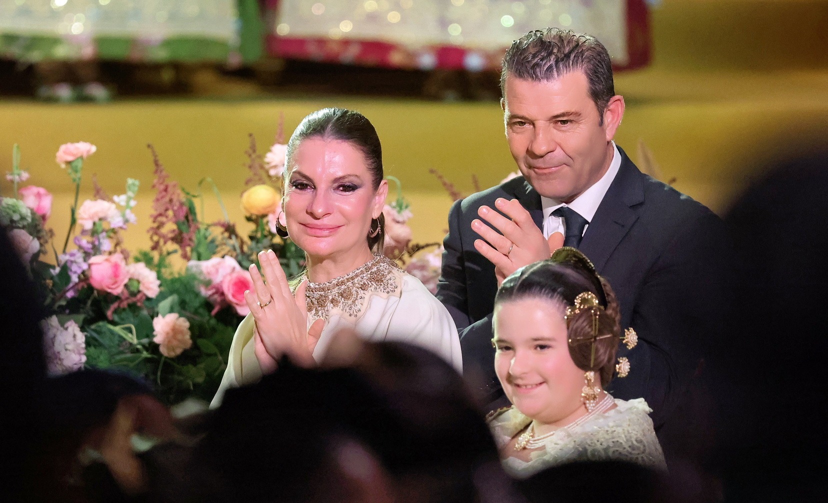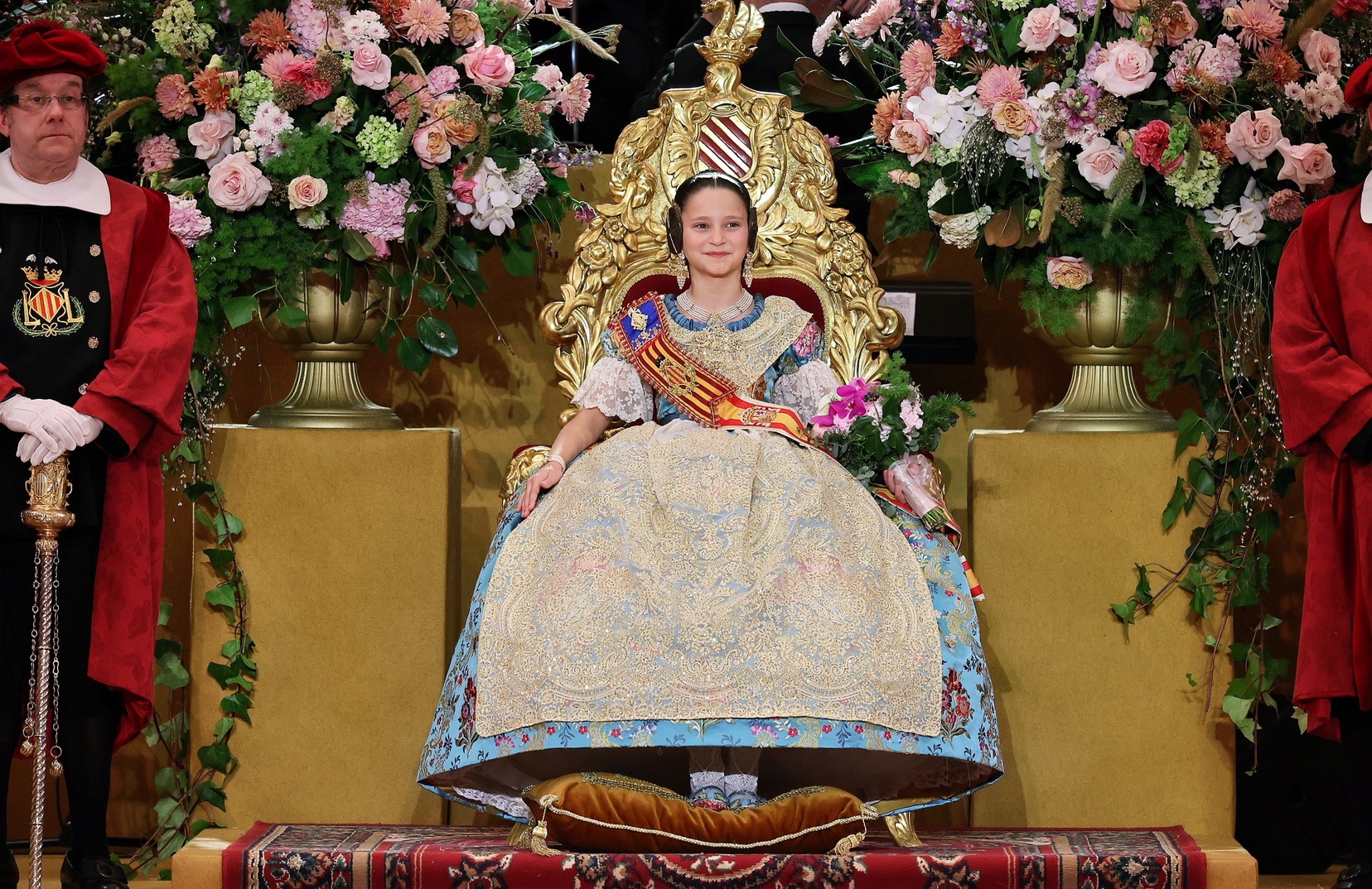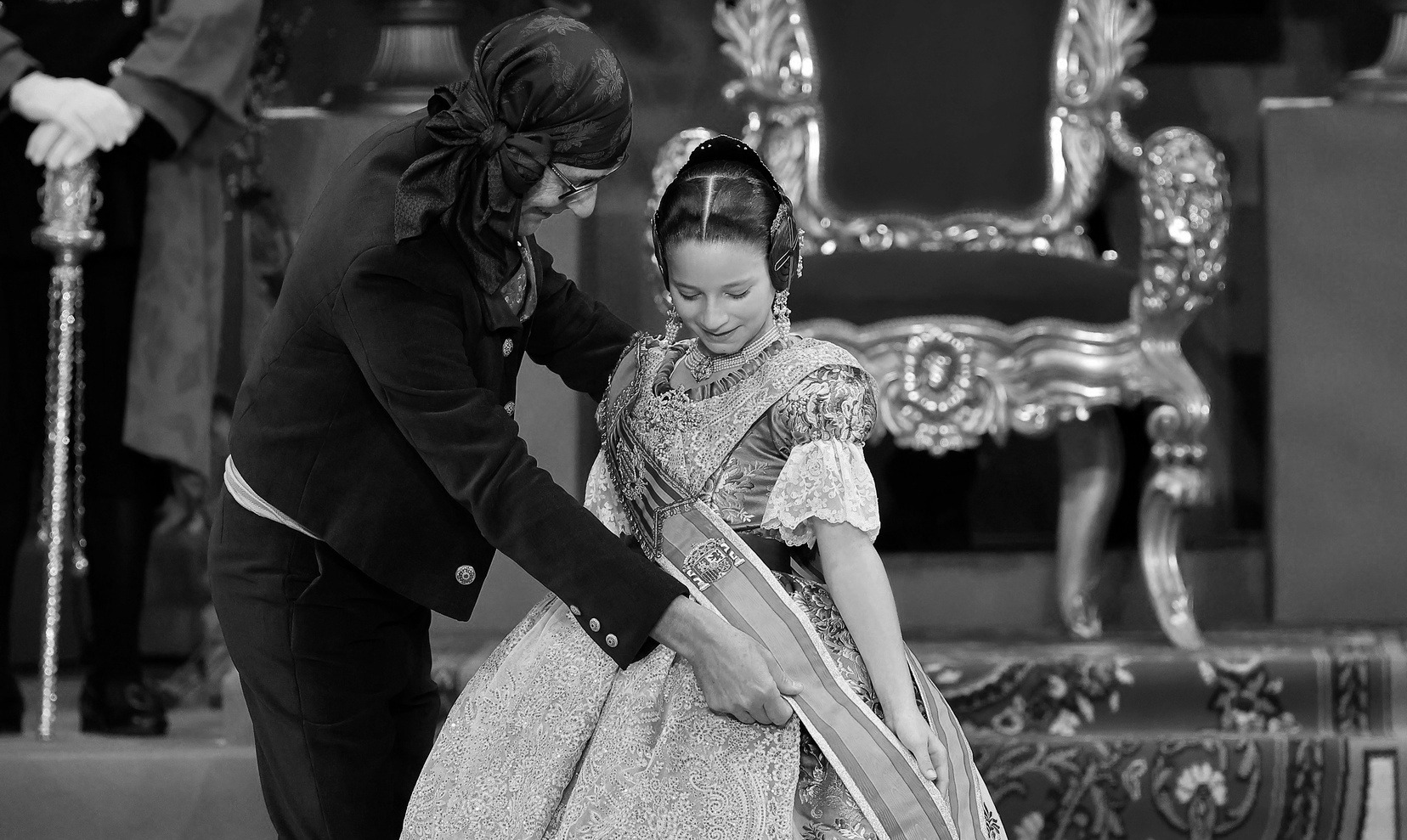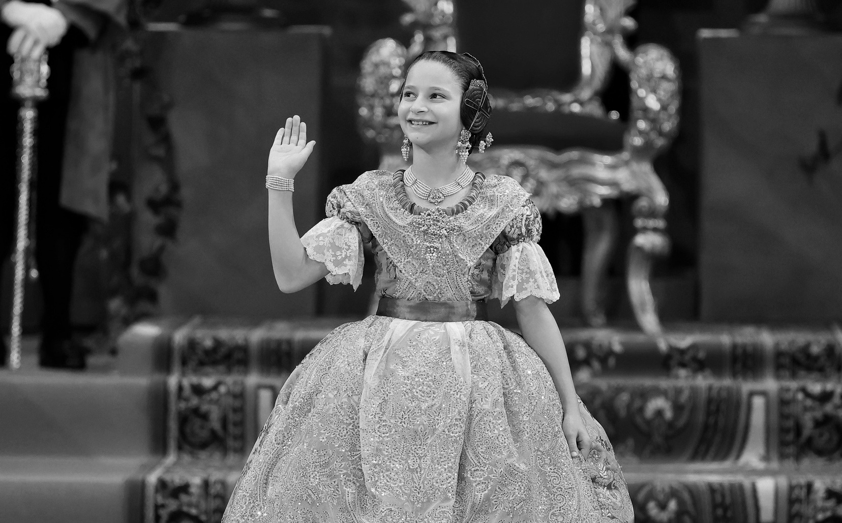 Després de la imposició de bandes a la Cort d’Honor Infantil, la veu de Reis Juan ha recitat les paraules que precedien al moment més esperat de tota la vesprada, «..pel conjunt de virtuts que atesora i que la fan dignísima portadora de nostra més alta representació, rindam homenatge d’amor i pleitesia a la Fallera Major Infantil de València (…)”