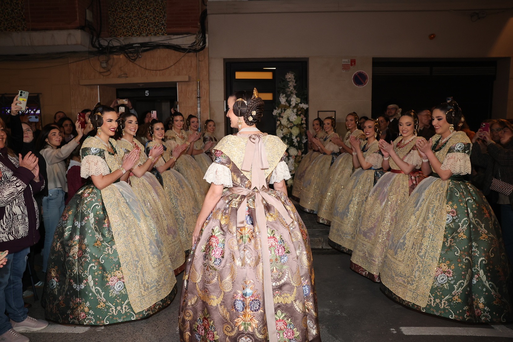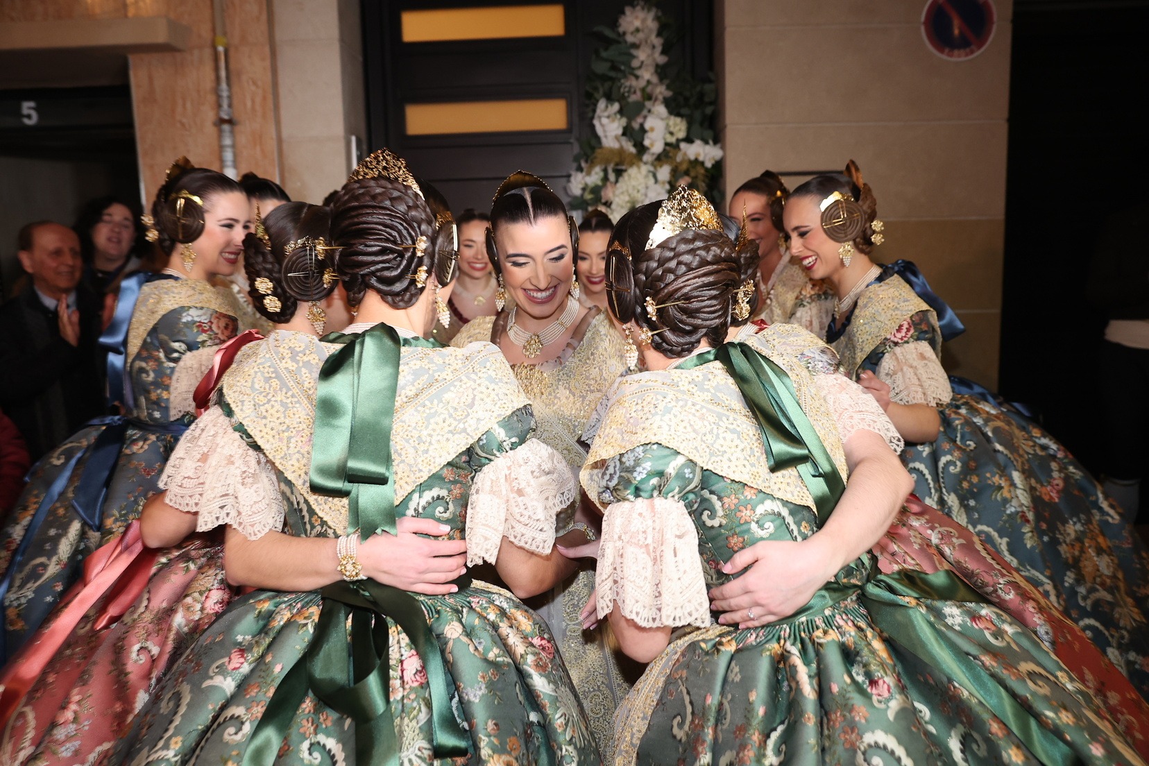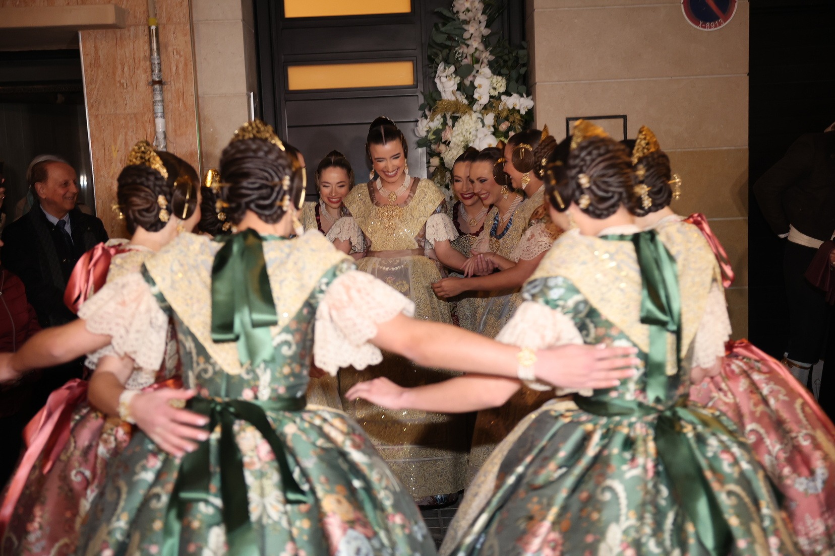 Les 12 components de la Cort d’Honor s’han dirigit, vestides amb els seus primers vestits oficials confeccionats per ‘Montaña Caballero’ amb les sedes de ‘Sedería Tradicional Valenciana’, a la casa de la nostra Fallera Major de València, Carmen Prades, per a conéixer de primera mà el color triat per al seu espolí i, com no, per a abrigallar i expressar la seua estima a la Fallera Major de València en esta nit tan especial per a elles i per al món faller.