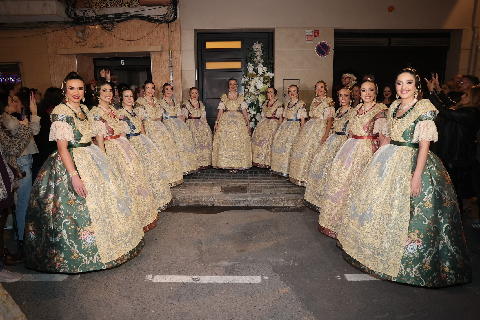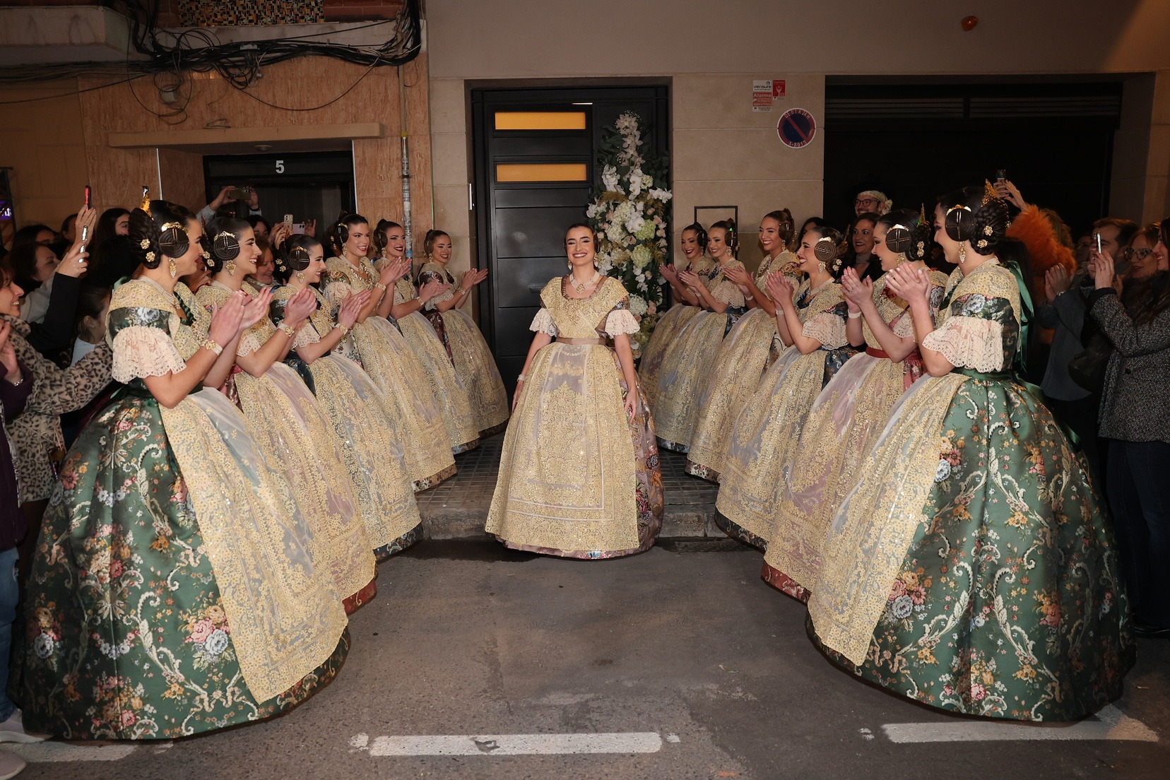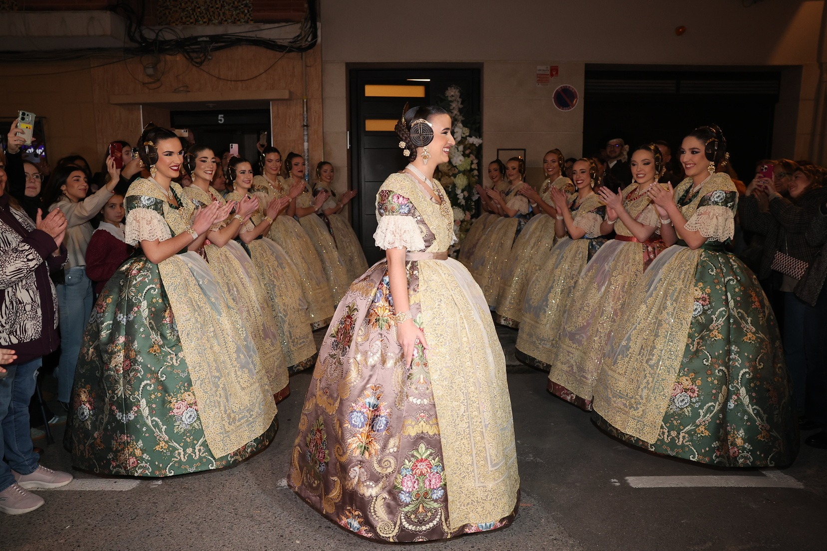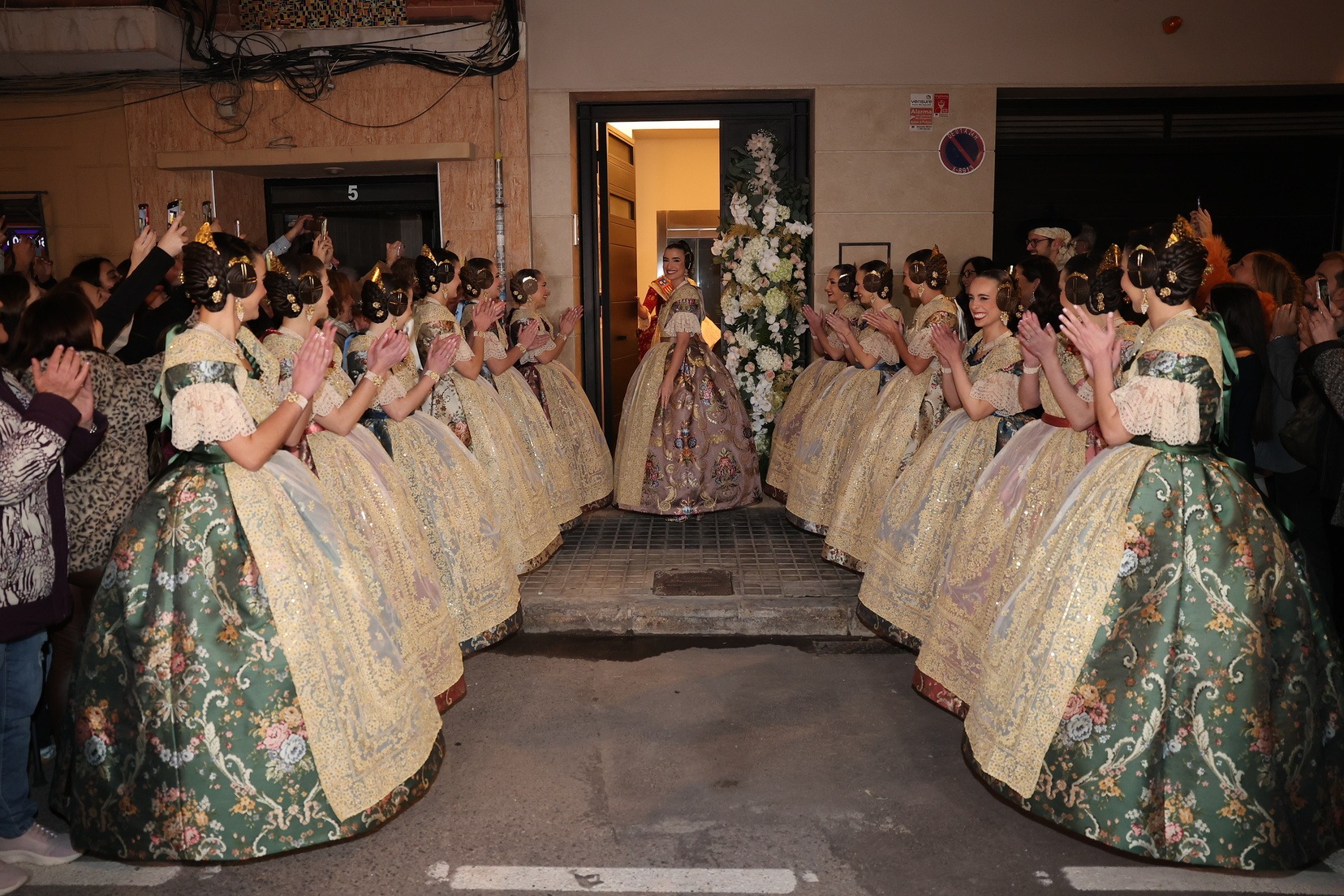 Les 12 components de la Cort d’Honor s’han dirigit, vestides amb els seus primers vestits oficials confeccionats per ‘Montaña Caballero’ amb les sedes de ‘Sedería Tradicional Valenciana’, a la casa de la nostra Fallera Major de València, Carmen Prades, per a conéixer de primera mà el color triat per al seu espolí i, com no, per a abrigallar i expressar la seua estima a la Fallera Major de València en esta nit tan especial per a elles i per al món faller.