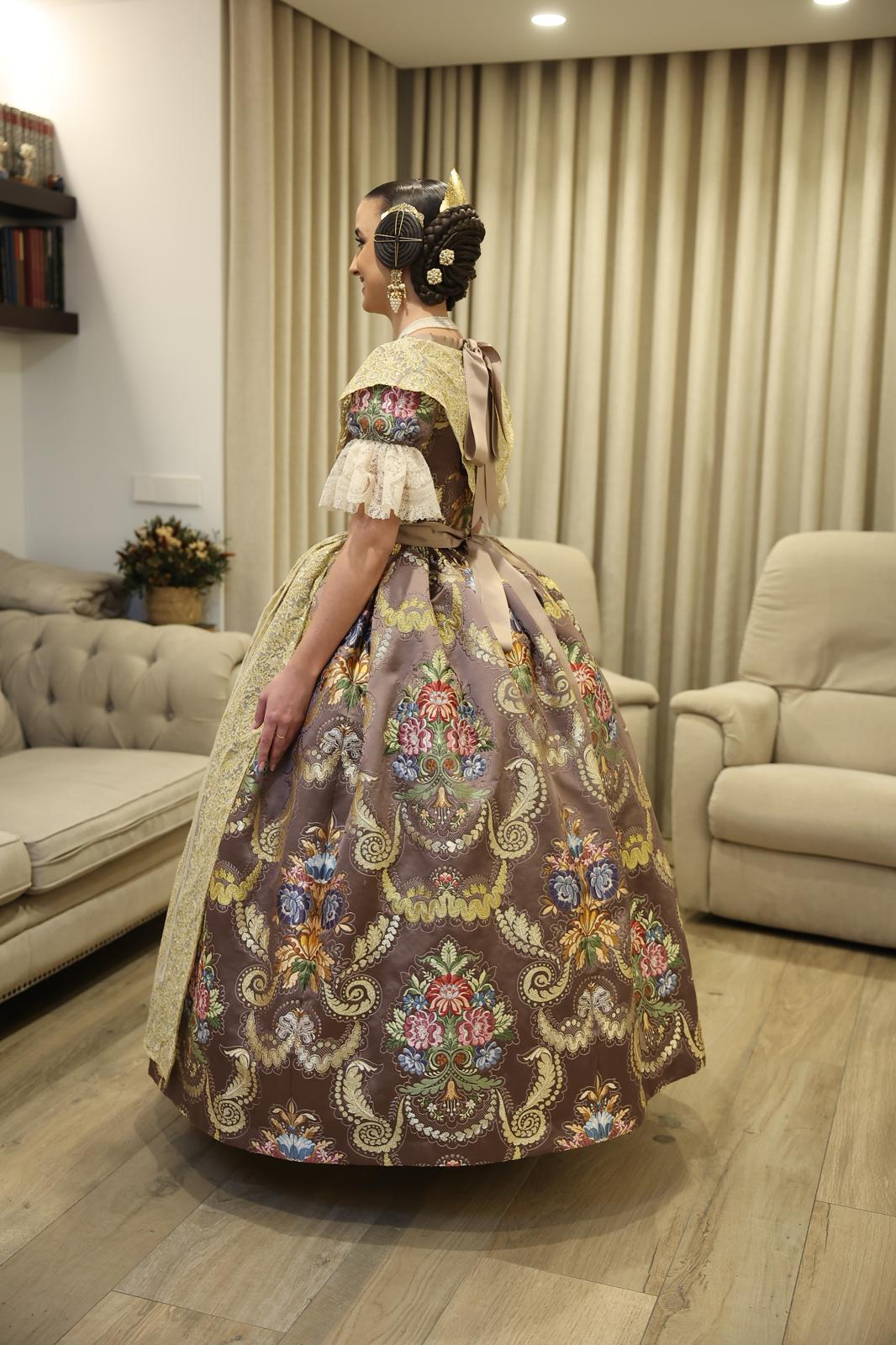 Cap a les 19:30 hores de la vesprada, Carmen, radiant i molt emocionada, ha eixit de casa entre els aplaudiments de tots els congregats en eixe punt i, per fi, hem pogut conéixer el secret més ben guardat, el color del seu espolí: ‘Terreta’, teixit per Vives i Marí i confeccionat també per ‘Montaña Caballero’. Un nom triat com a homenatge a València i a totes les persones que en formen part.