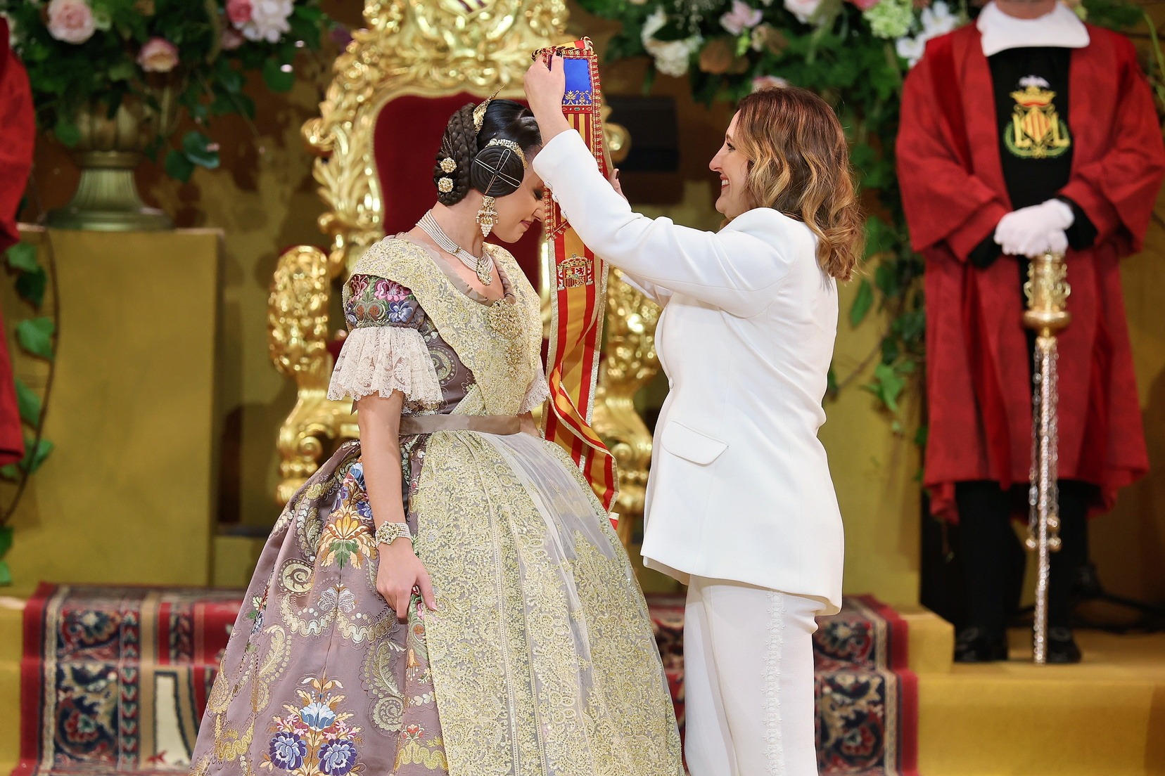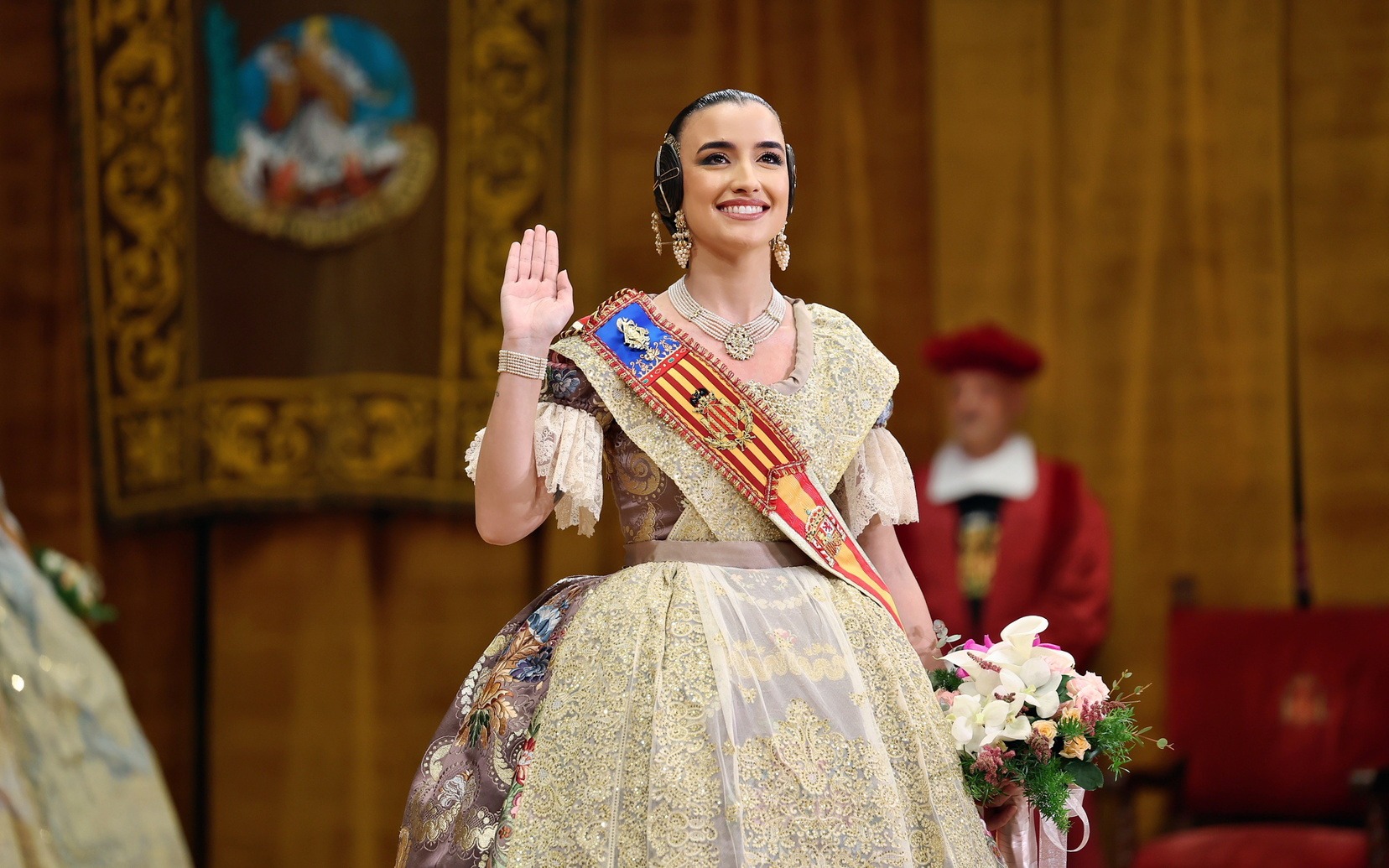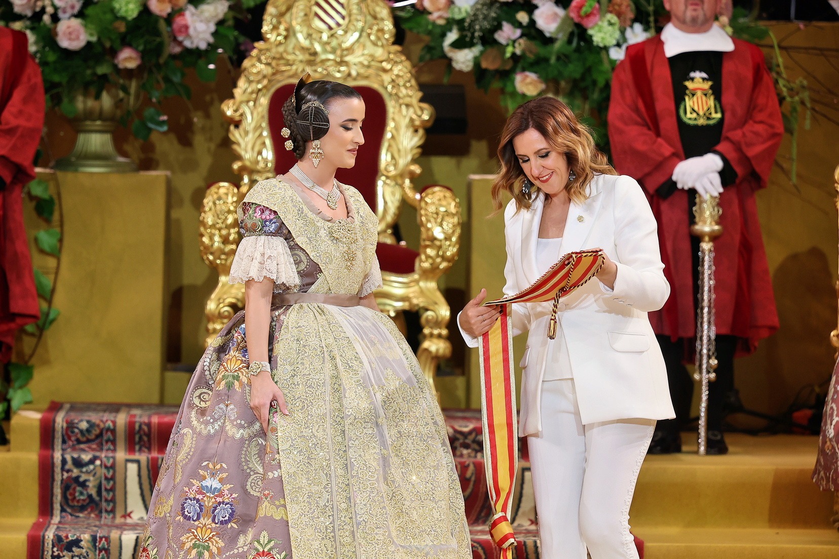Allí la esperaban el Presidente de la Junta Central Fallera, Santiago Ballester, y su Corte de Honor, con quienes ha compartido uno de los instantes más importantes de su vida fallera. El momento culminante ha llegado cuando la alcaldesa de Valencia, María José Catalá, le ha impuesto la banda y la joia, dedicándole unas palabras llenas de cercanía y solemnidad en un acto que quedará para siempre en la memoria de Carmen.