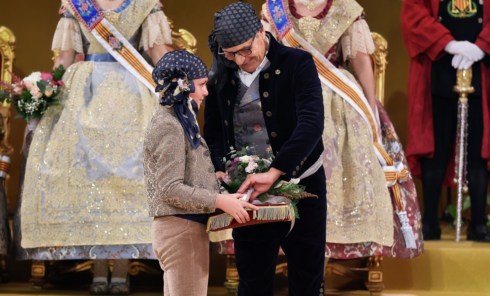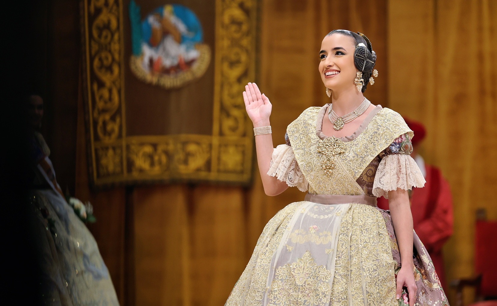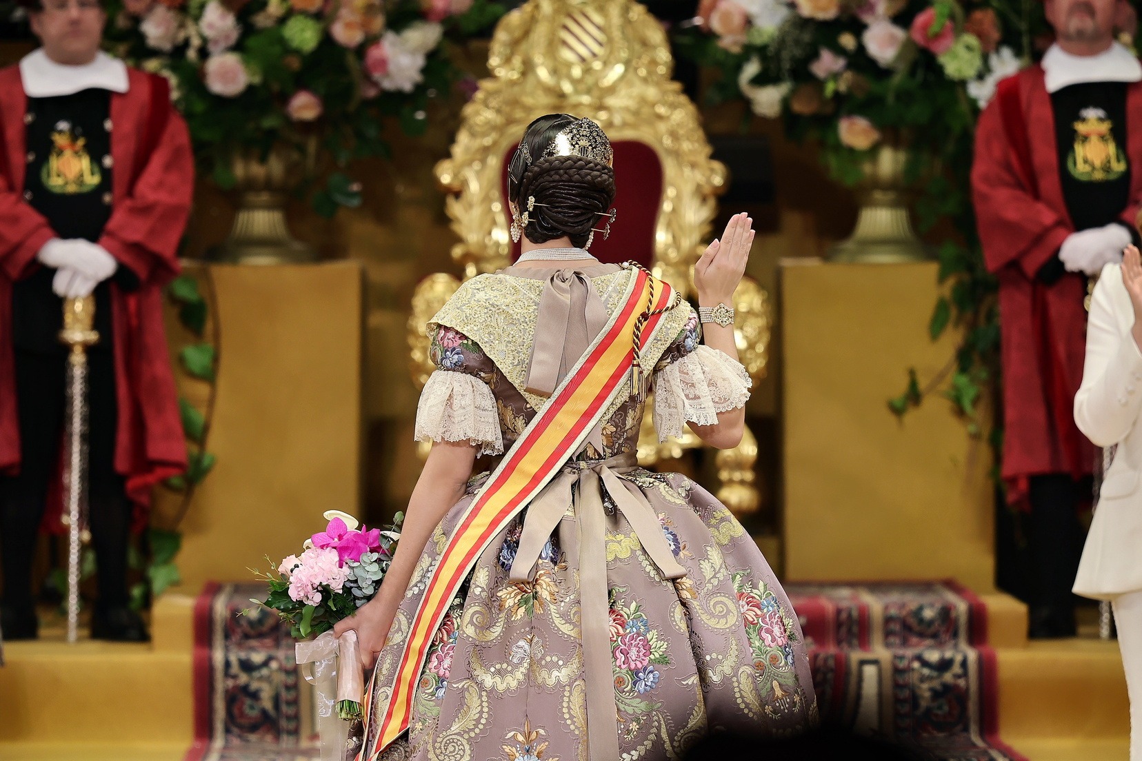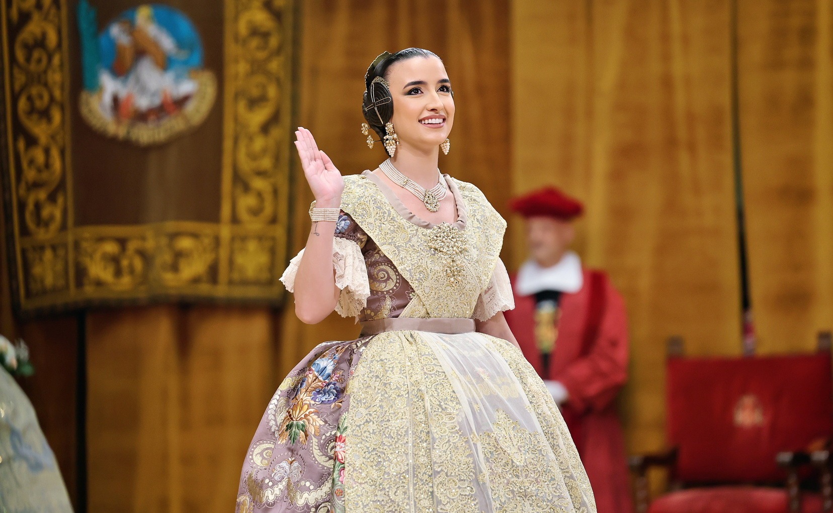 Allí la esperaban el Presidente de la Junta Central Fallera, Santiago Ballester, y su Corte de Honor, con quienes ha compartido uno de los instantes más importantes de su vida fallera. El momento culminante ha llegado cuando la alcaldesa de Valencia, María José Catalá, le ha impuesto la banda y la joia, dedicándole unas palabras llenas de cercanía y solemnidad en un acto que quedará para siempre en la memoria de Carmen.