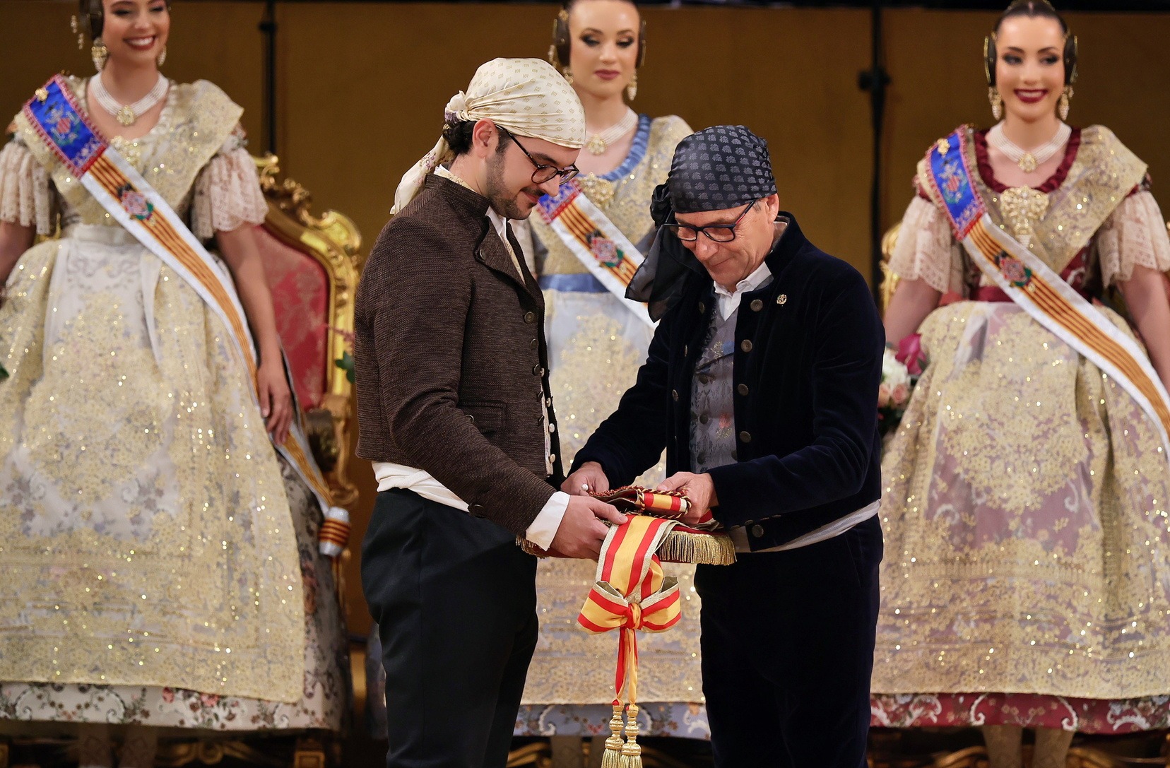 El momento, también ha sido muy especial para Carlos Prades Gil, hermano de Carmen, que ha sido el encargado de sacar la banda de una emocionada Fallera Mayor de Valencia, que ya luce este emblema como máxima representante de la fiesta fallera.