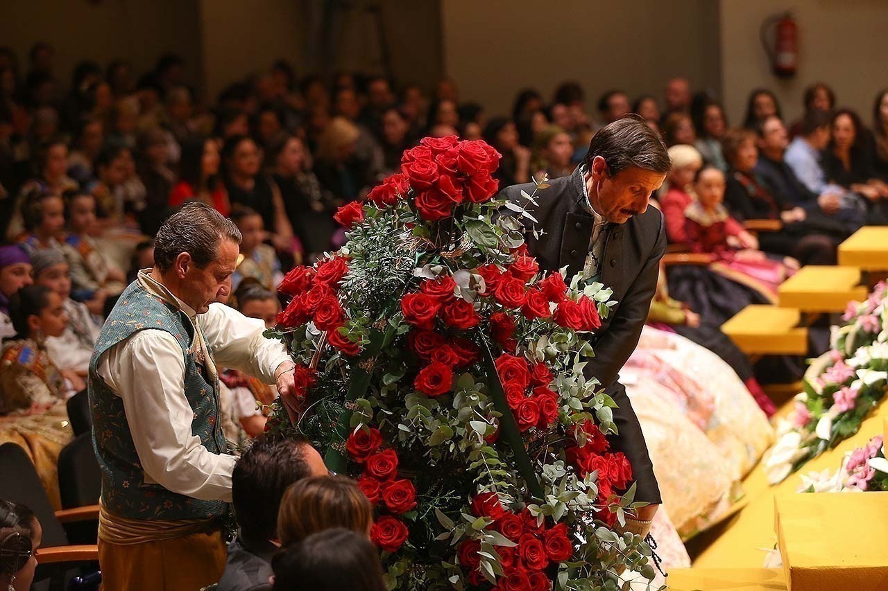 El escenario del Palau de la Música, abarrotado de flores en honor a la Fallera Mayor Infantil de València, Sara Larrazábal Bernal Después de la imposición de bandas que acreditan a Sara Larrazábal y su Corte de Honor como las máximas representantes de la fiesta valenciana, por los pasillos del Palau de la Música han comenzado a desfilar preciosas canastillas de flores que han llenado de color y de un magnífico olor la Sala Iturbi del Palau de la Música en este día tan especial.
