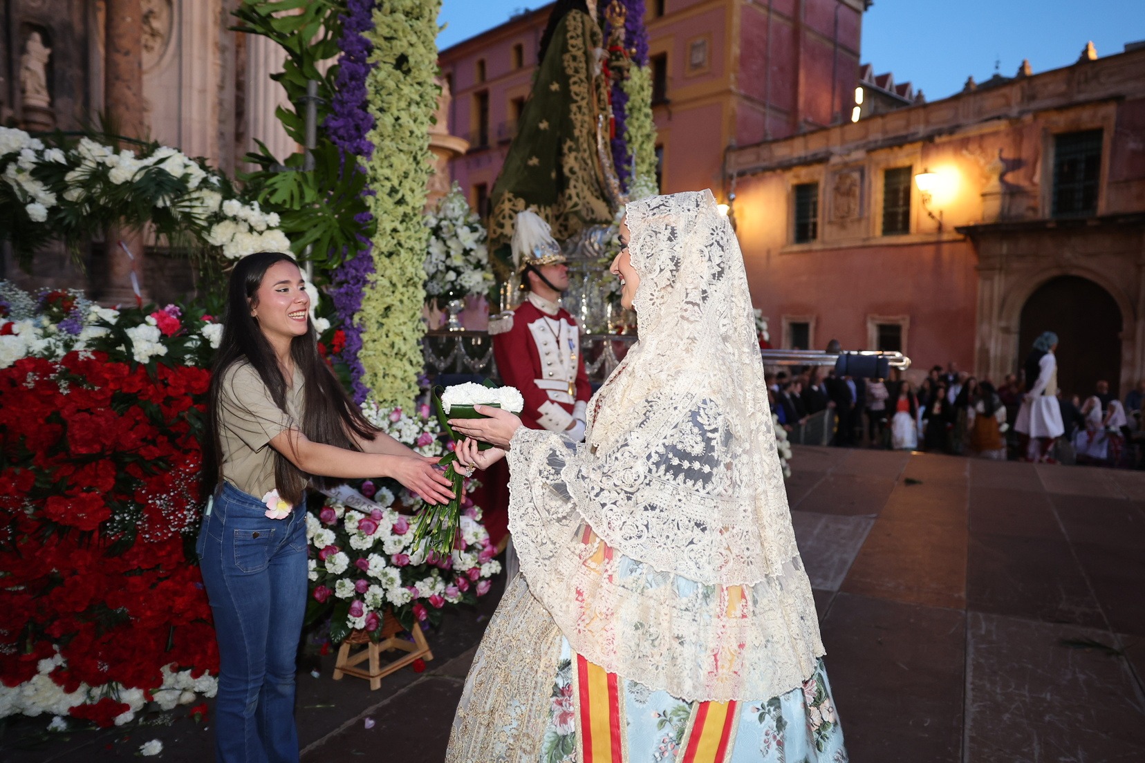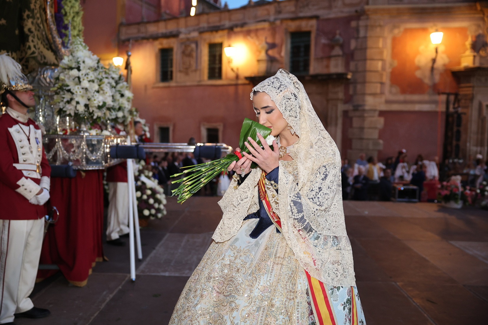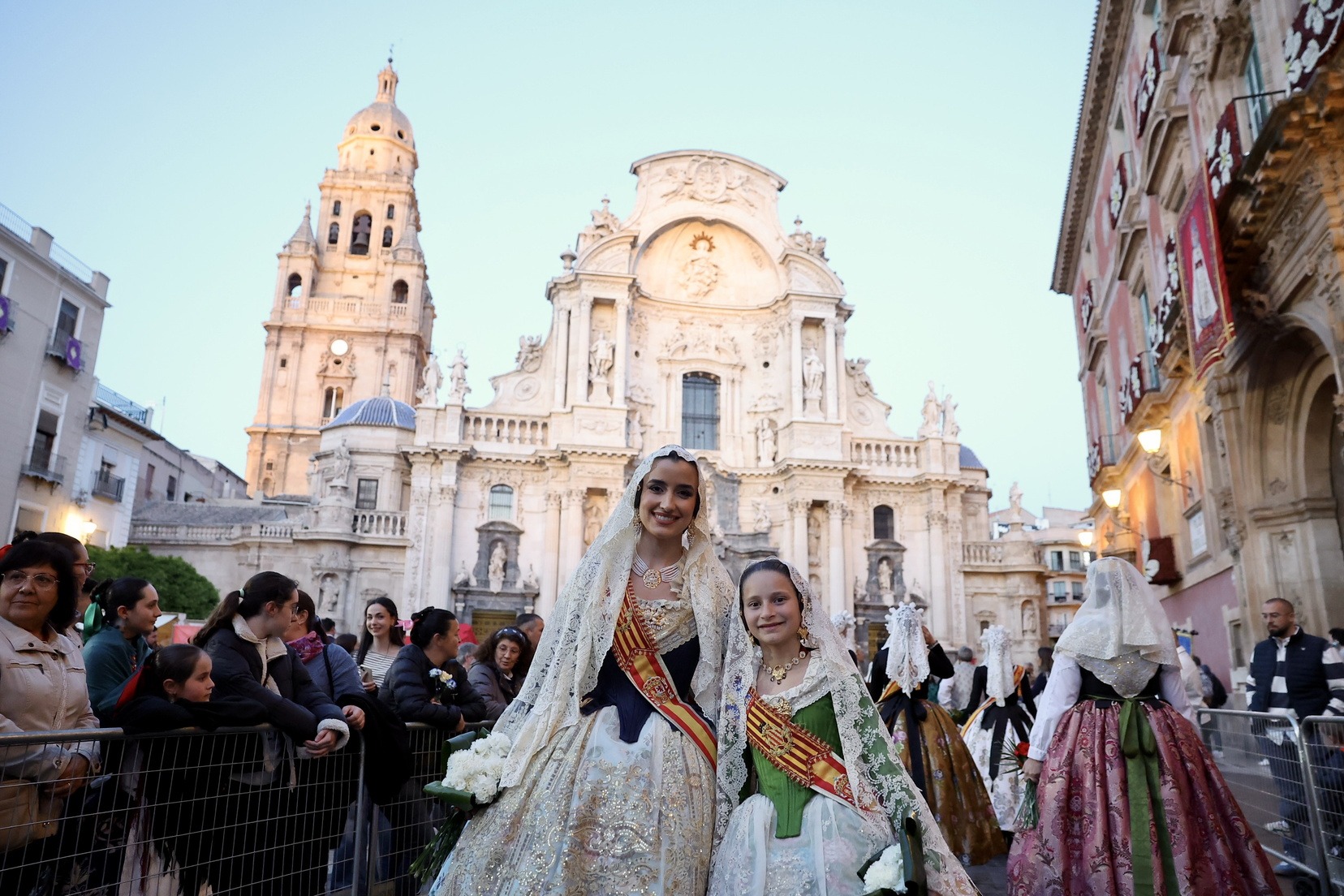 Ambas han acompañado a Ángela Muñoz y Leonor Antón, Reinas de la Huerta de Murcia, en este acto que ha finalizado en la plaza del Cardenal Belluga, a los pies de la Catedral, y que cada año reúne a miles de participantes. Más de medio centenar de peñas huertanas, junto a grupos folclóricos y colectivos tradicionales, han desfilado ataviados con el traje típico hasta el lugar de la Ofrenda para depositar sus ramos de flores, principalmente claveles, formando un tapiz floral en honor a su patrona.