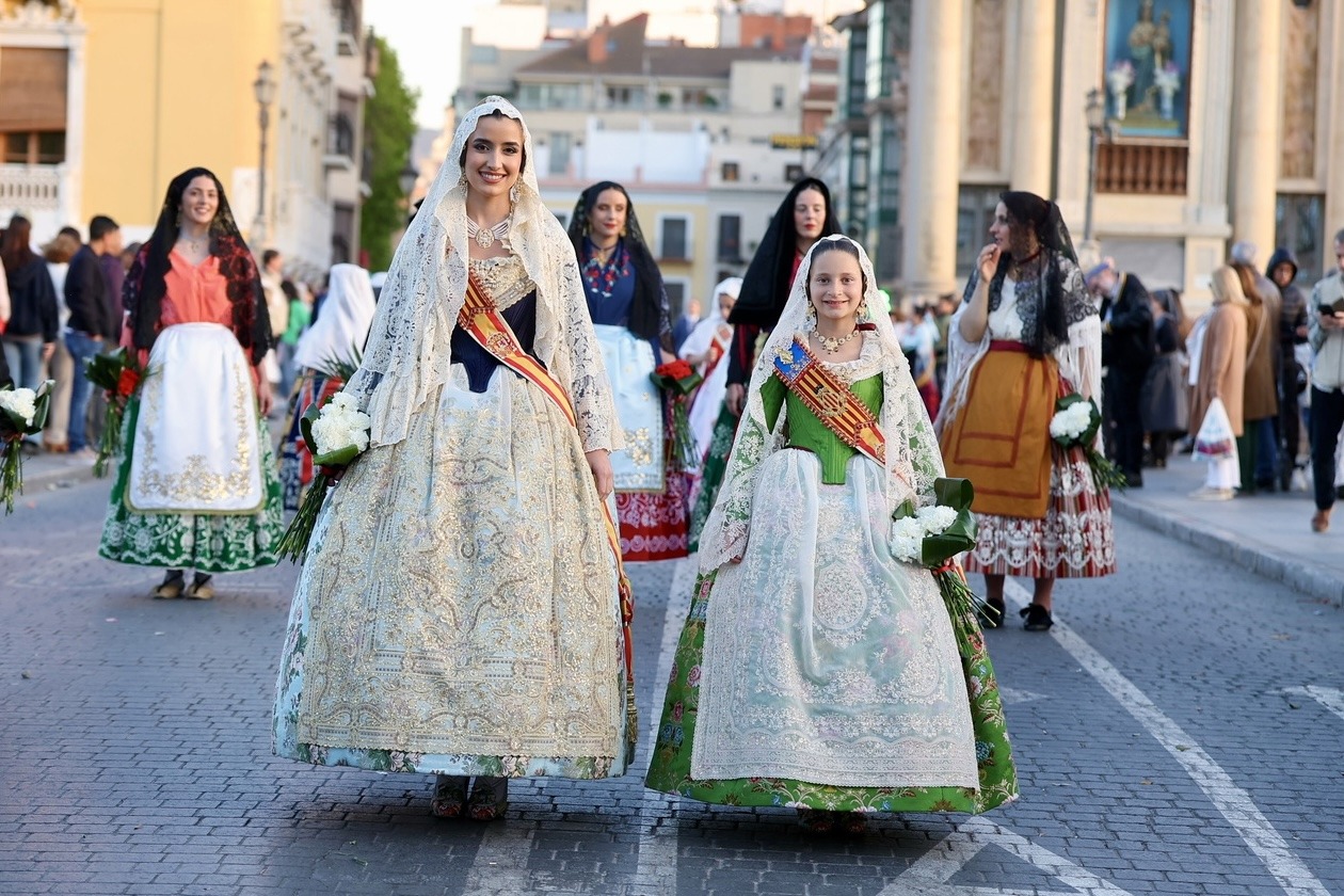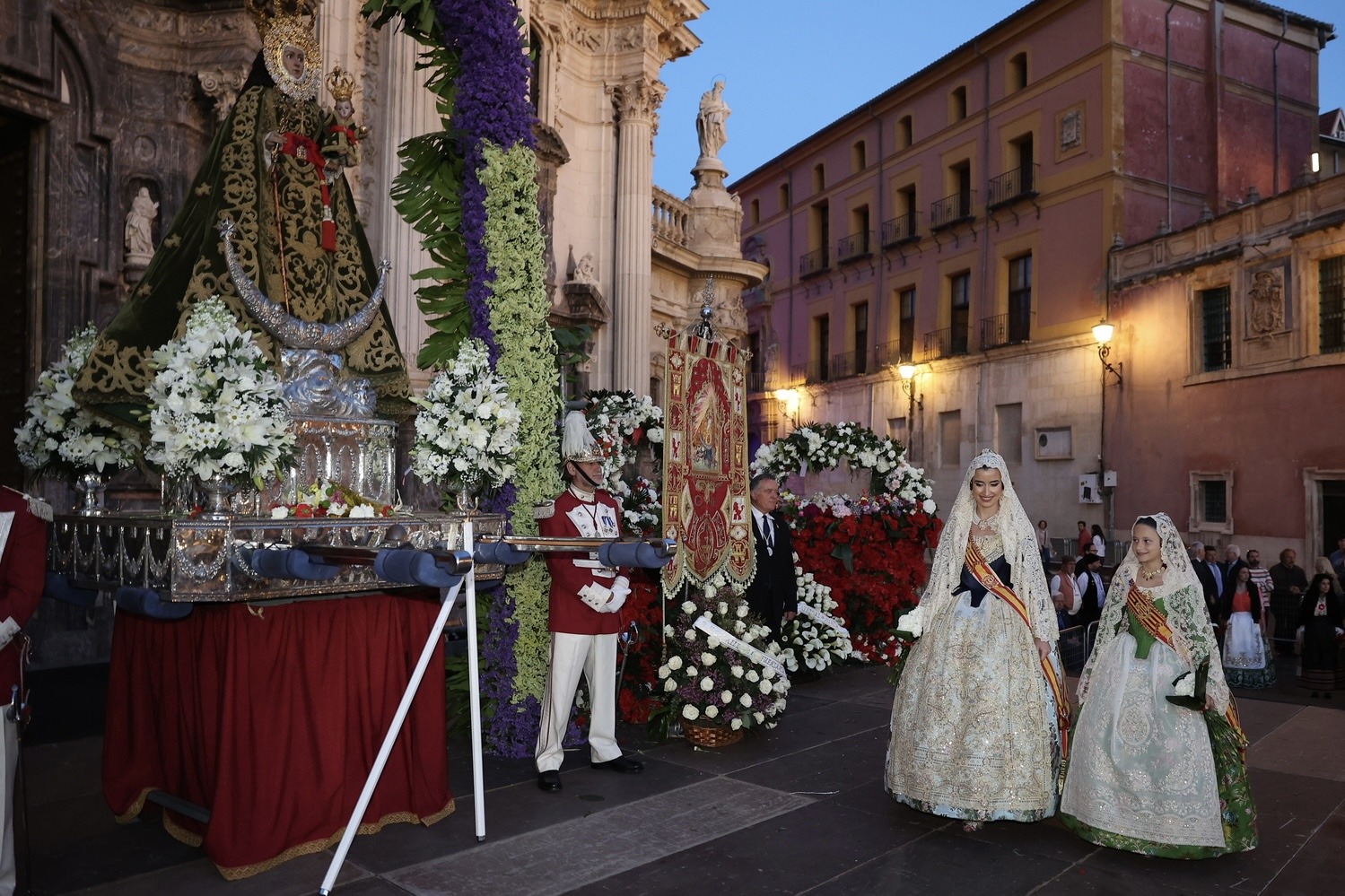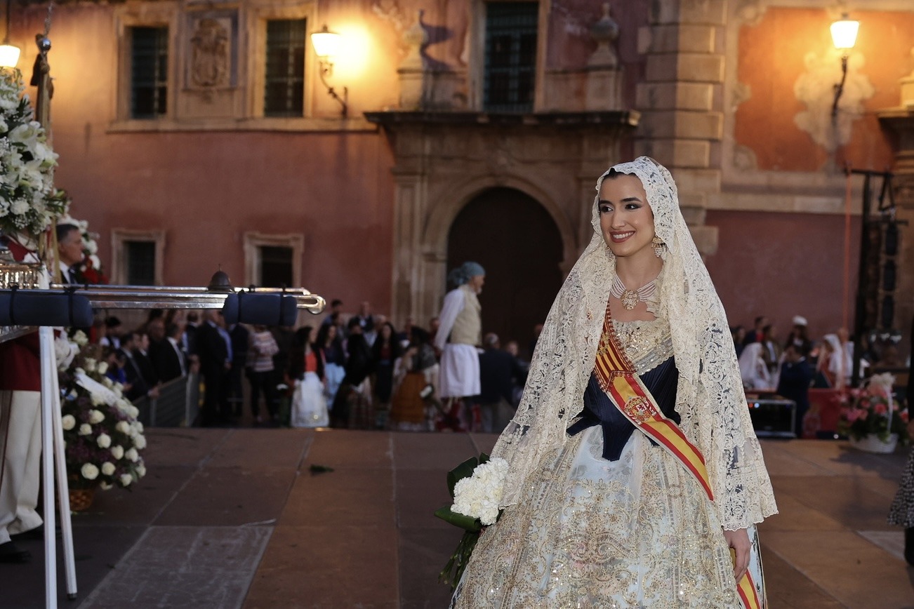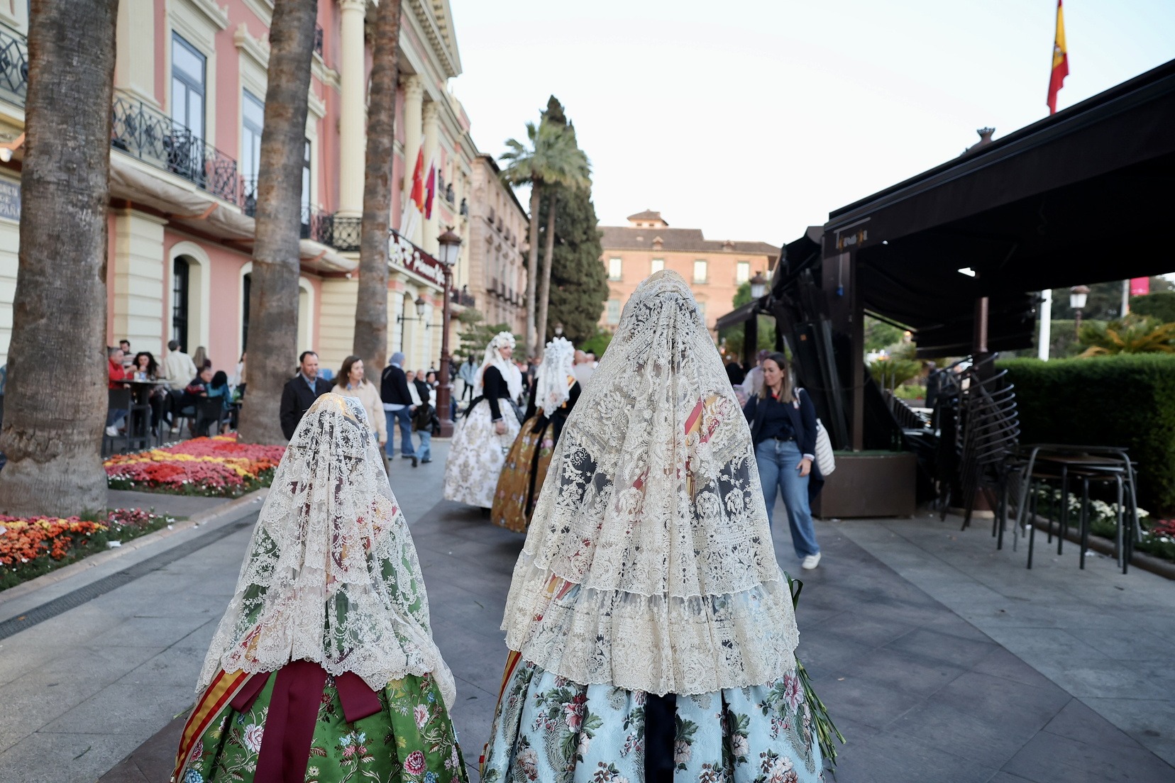 Ambas han acompañado a Ángela Muñoz y Leonor Antón, Reinas de la Huerta de Murcia, en este acto que ha finalizado en la plaza del Cardenal Belluga, a los pies de la Catedral, y que cada año reúne a miles de participantes. Más de medio centenar de peñas huertanas, junto a grupos folclóricos y colectivos tradicionales, han desfilado ataviados con el traje típico hasta el lugar de la Ofrenda para depositar sus ramos de flores, principalmente claveles, formando un tapiz floral en honor a su patrona.