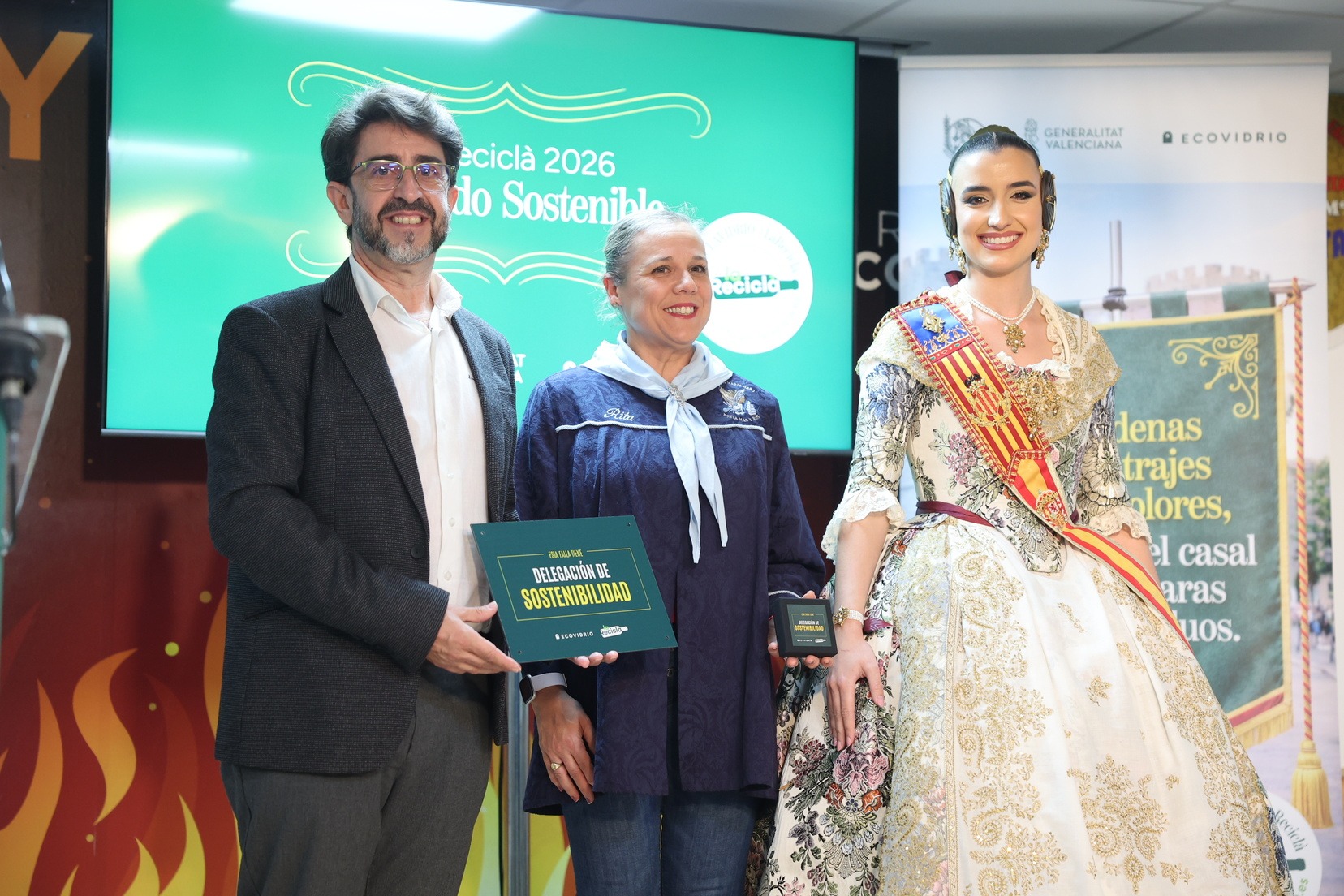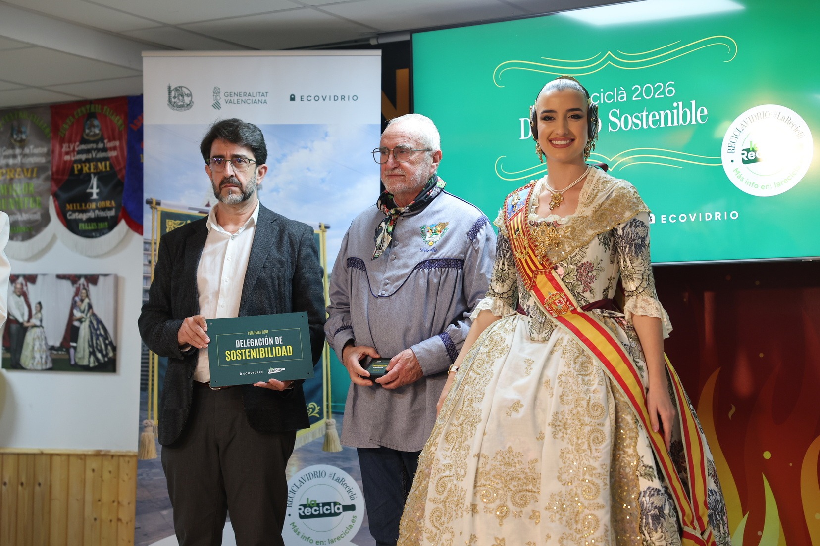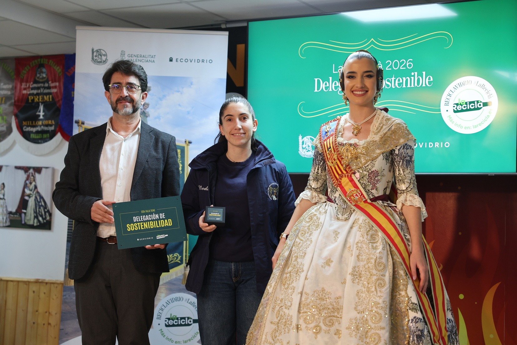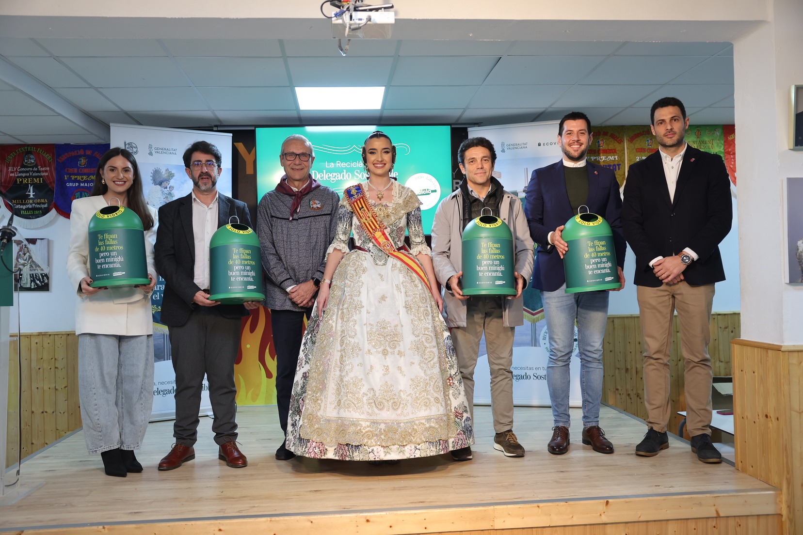 La Fallera Mayor de Valencia, Carmen Prades, acompañada por el concejal de Fallas y presidente de Junta Central Fallera, Santiago Ballester, ha querido asistir a la presentación de esta campaña que, un año más, trabaja junto a las comisiones falleras para mostrar su responsabilidad con el medioambiente y convertirse en referente de civismo y respeto en el tratamiento de los residuos que se generan por la actividad fallera.