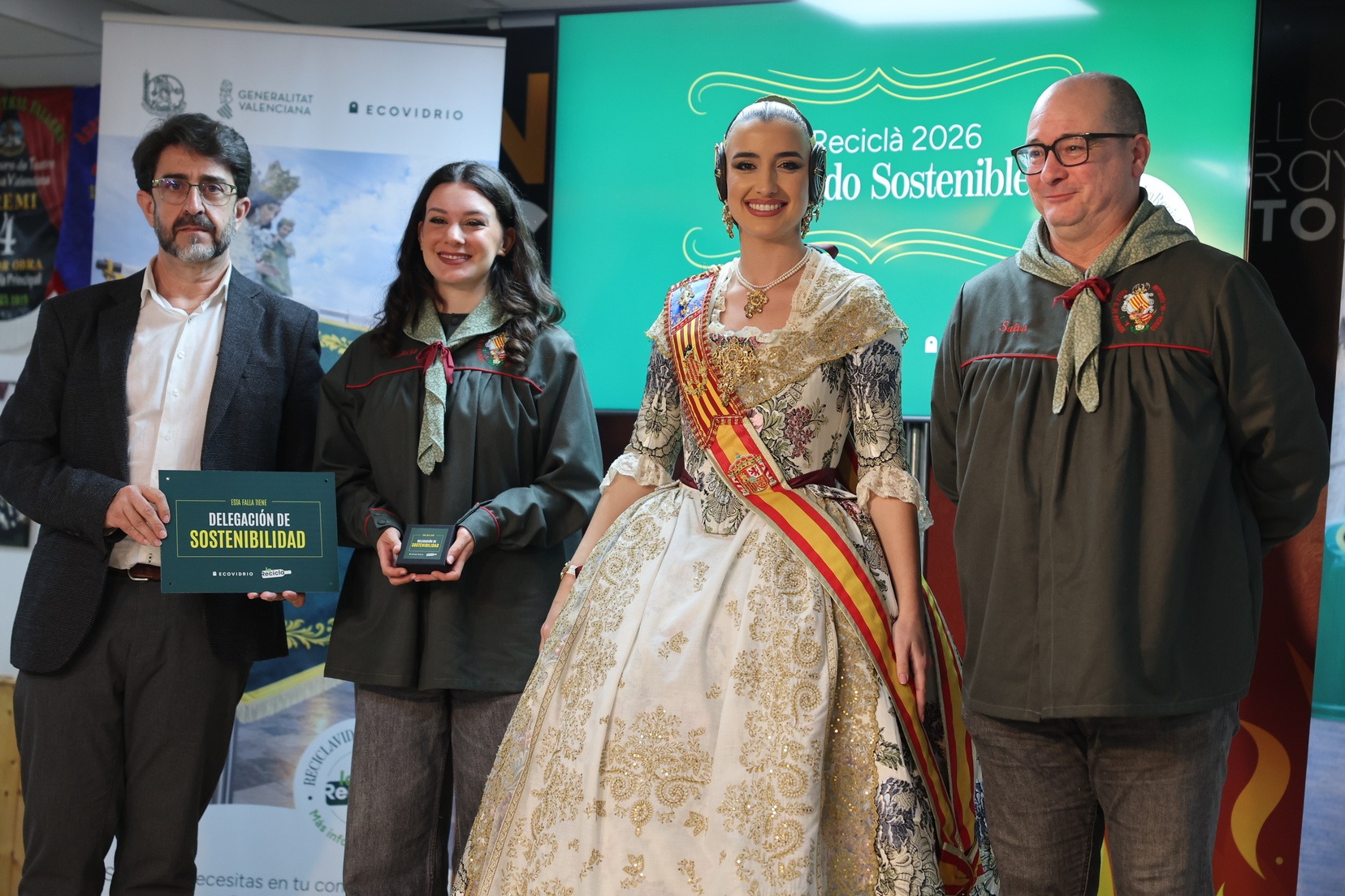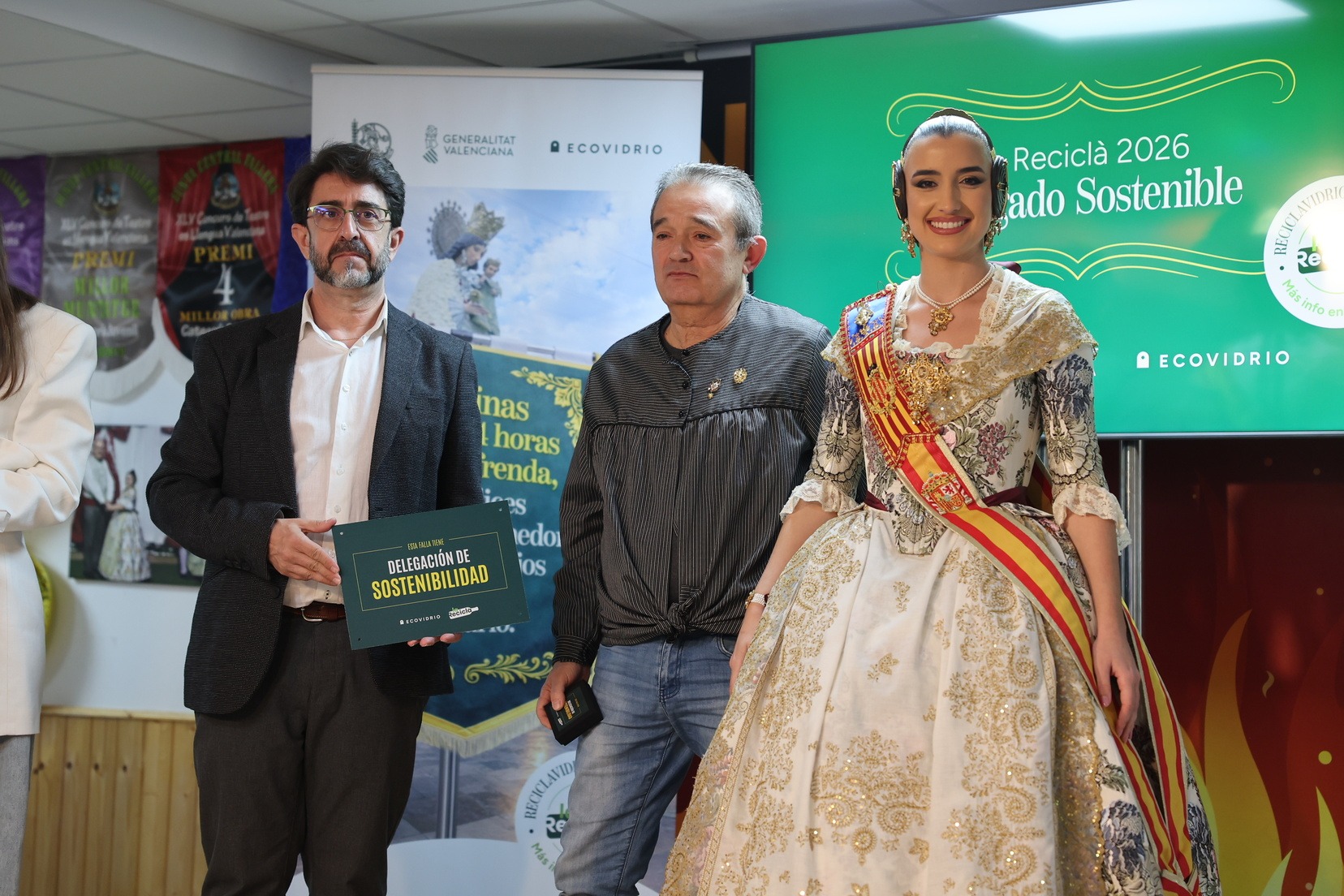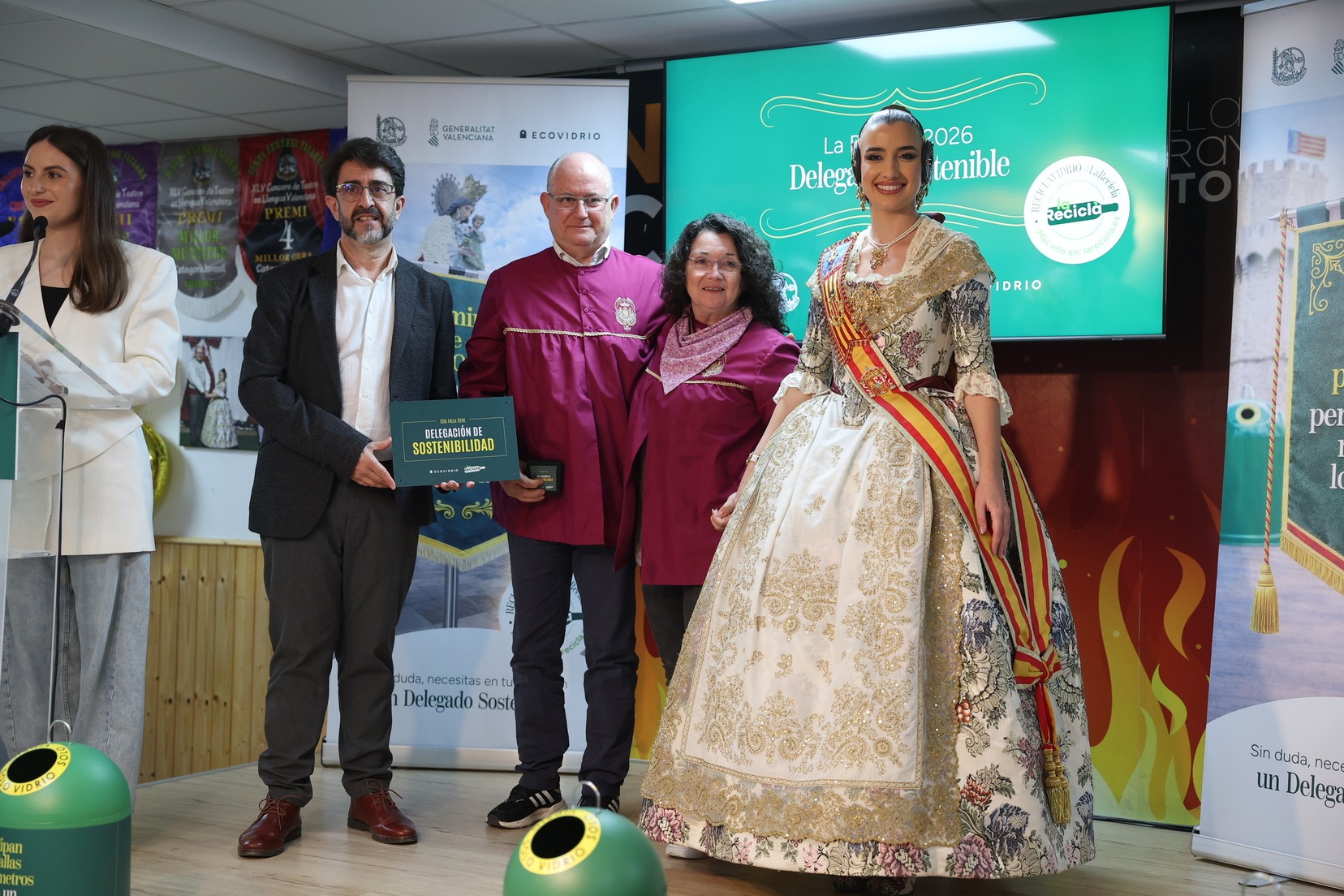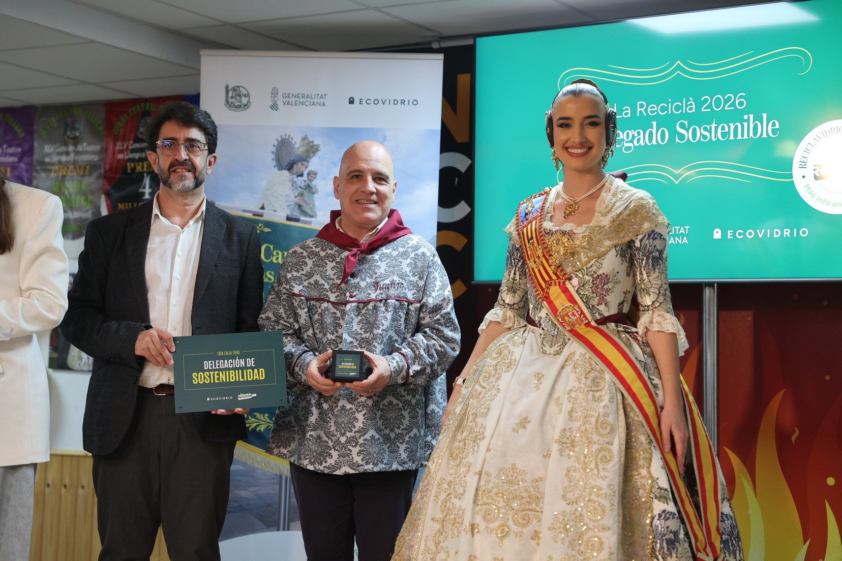 La Fallera Mayor de Valencia, Carmen Prades, acompañada por el concejal de Fallas y presidente de Junta Central Fallera, Santiago Ballester, ha querido asistir a la presentación de esta campaña que, un año más, trabaja junto a las comisiones falleras para mostrar su responsabilidad con el medioambiente y convertirse en referente de civismo y respeto en el tratamiento de los residuos que se generan por la actividad fallera.