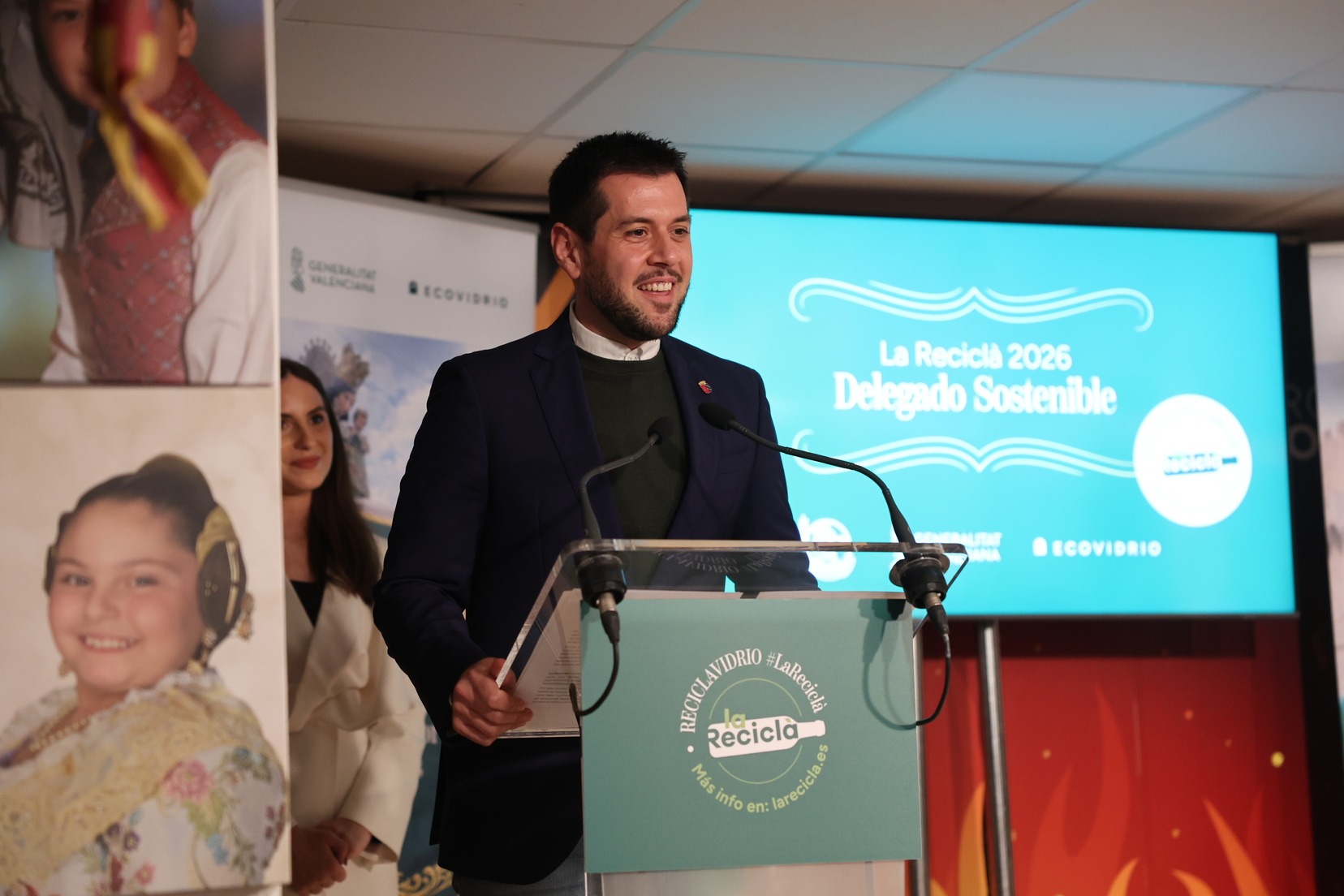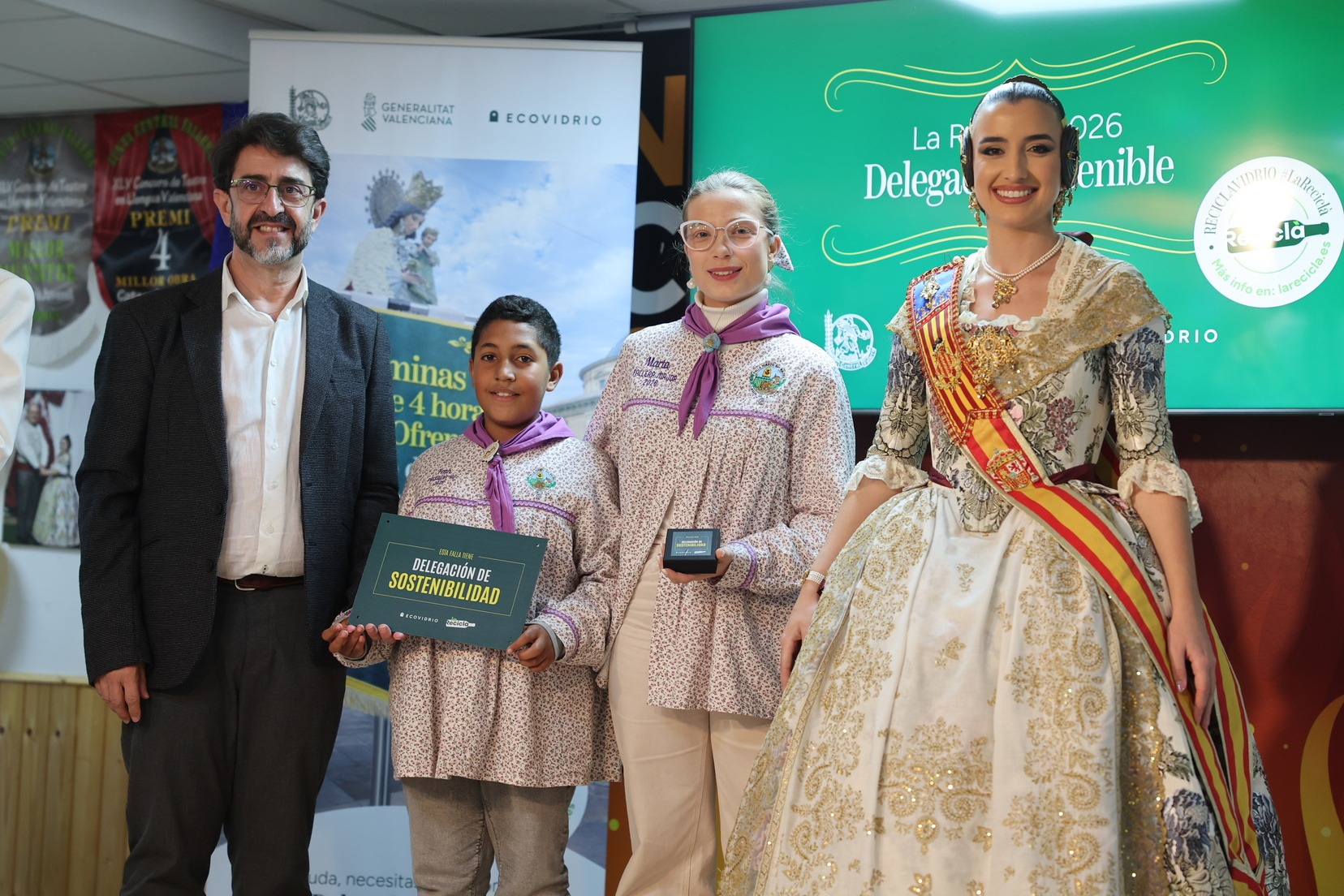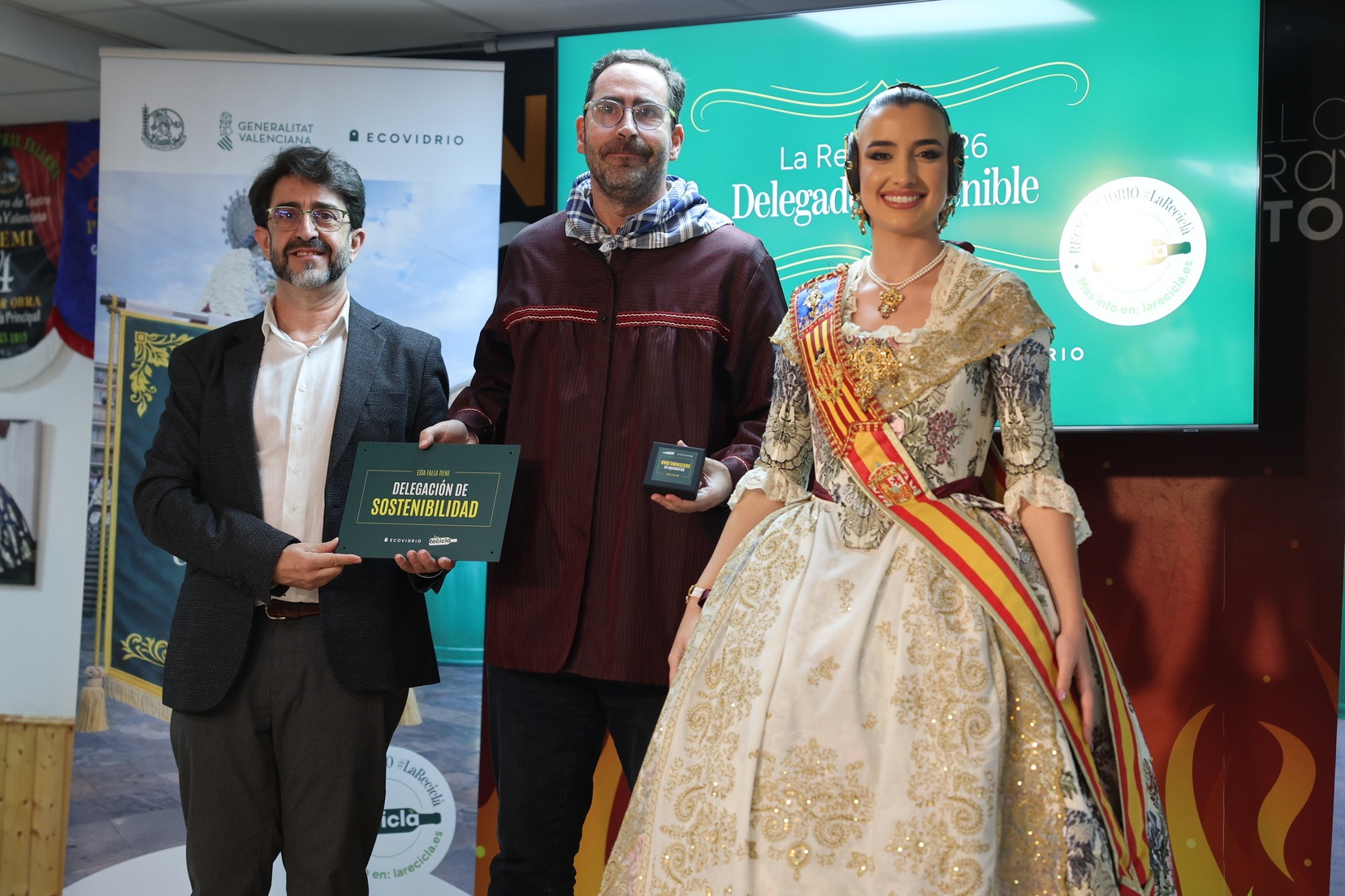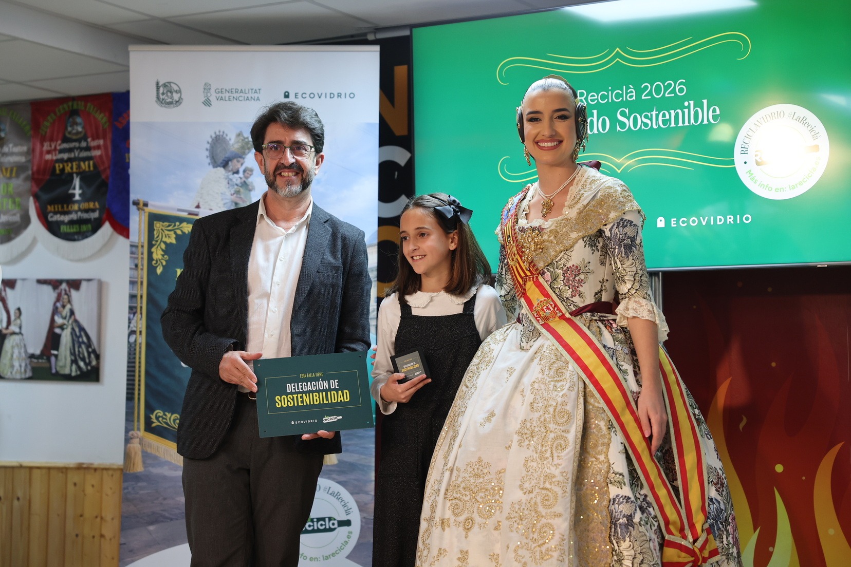 La Fallera Mayor de Valencia, Carmen Prades, acompañada por el concejal de Fallas y presidente de Junta Central Fallera, Santiago Ballester, ha querido asistir a la presentación de esta campaña que, un año más, trabaja junto a las comisiones falleras para mostrar su responsabilidad con el medioambiente y convertirse en referente de civismo y respeto en el tratamiento de los residuos que se generan por la actividad fallera.