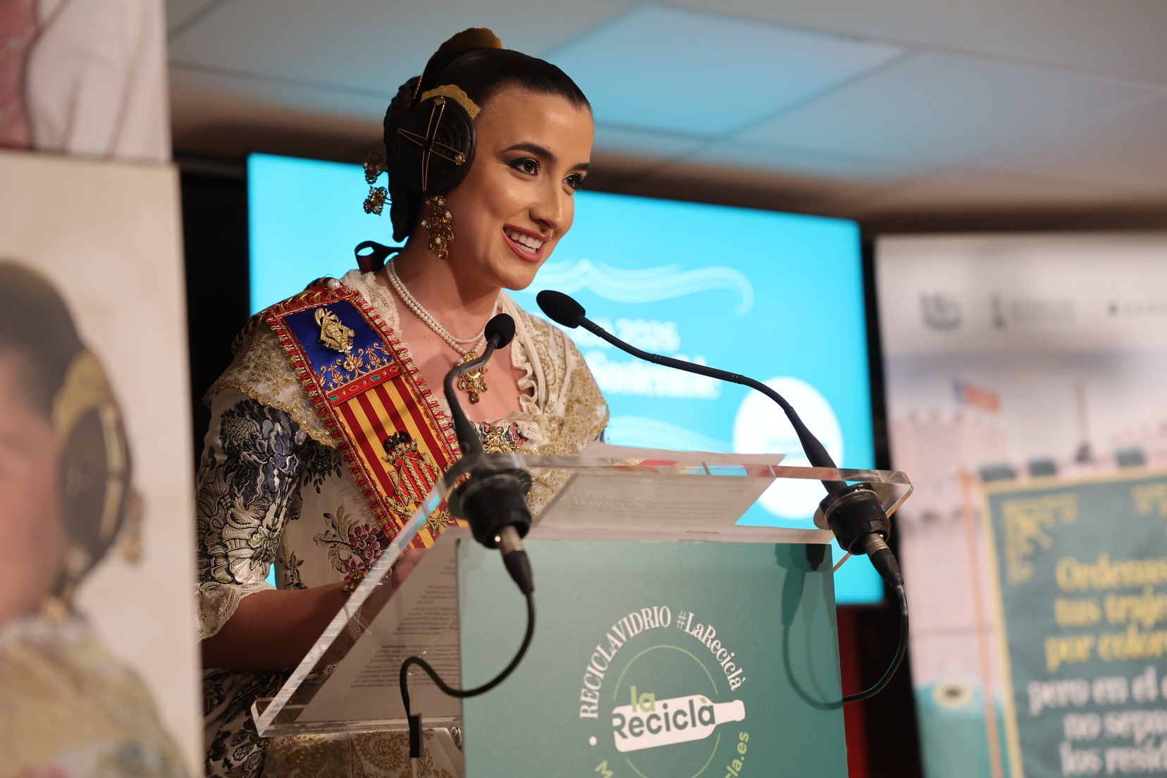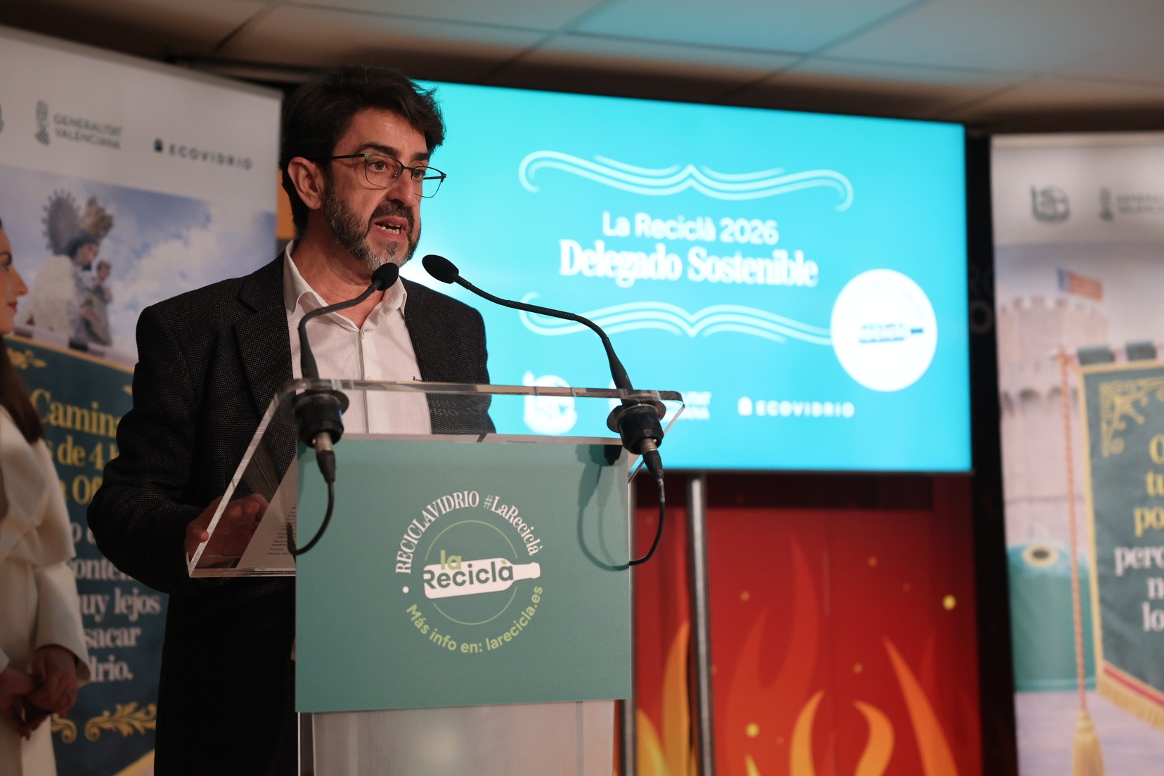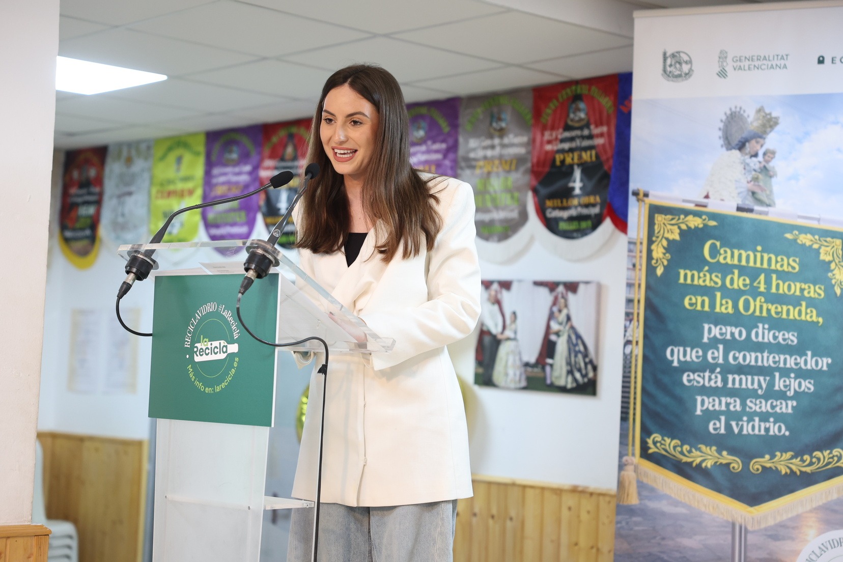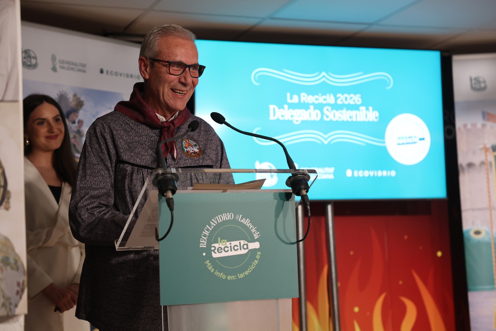 La Fallera Mayor de Valencia, Carmen Prades, acompañada por el concejal de Fallas y presidente de Junta Central Fallera, Santiago Ballester, ha querido asistir a la presentación de esta campaña que, un año más, trabaja junto a las comisiones falleras para mostrar su responsabilidad con el medioambiente y convertirse en referente de civismo y respeto en el tratamiento de los residuos que se generan por la actividad fallera.