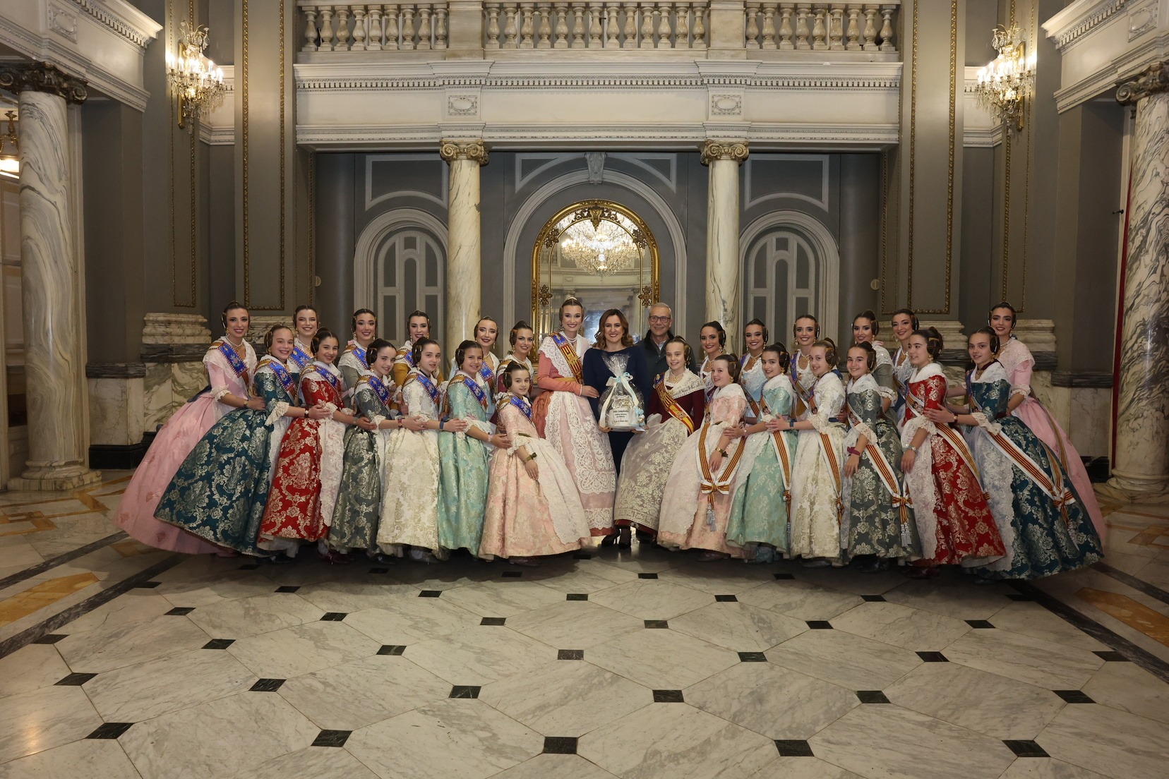 En esta ocasión también recibieron a los jugadores del Valencia Basket, quienes posaron con ellas en una fotografía y después disfrutaron de la mascletà en el balcón, así como las fallas invitadas del día.
