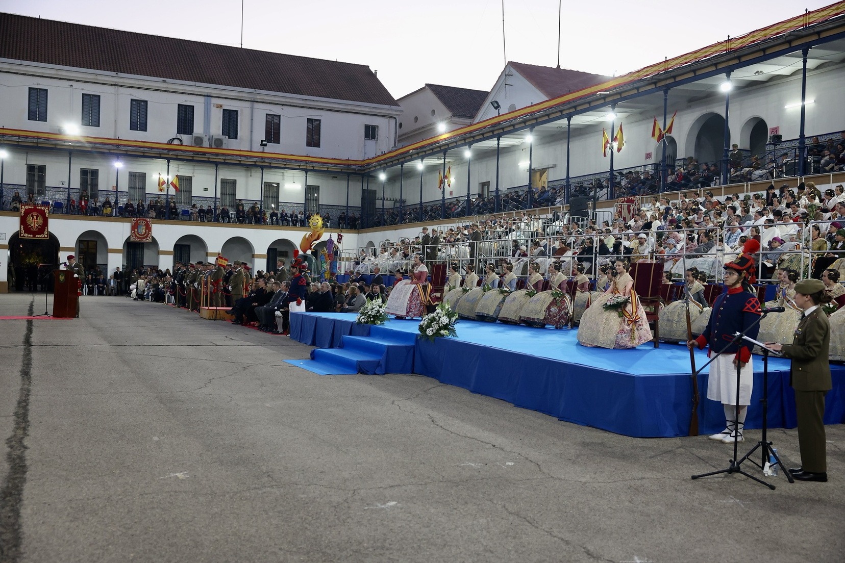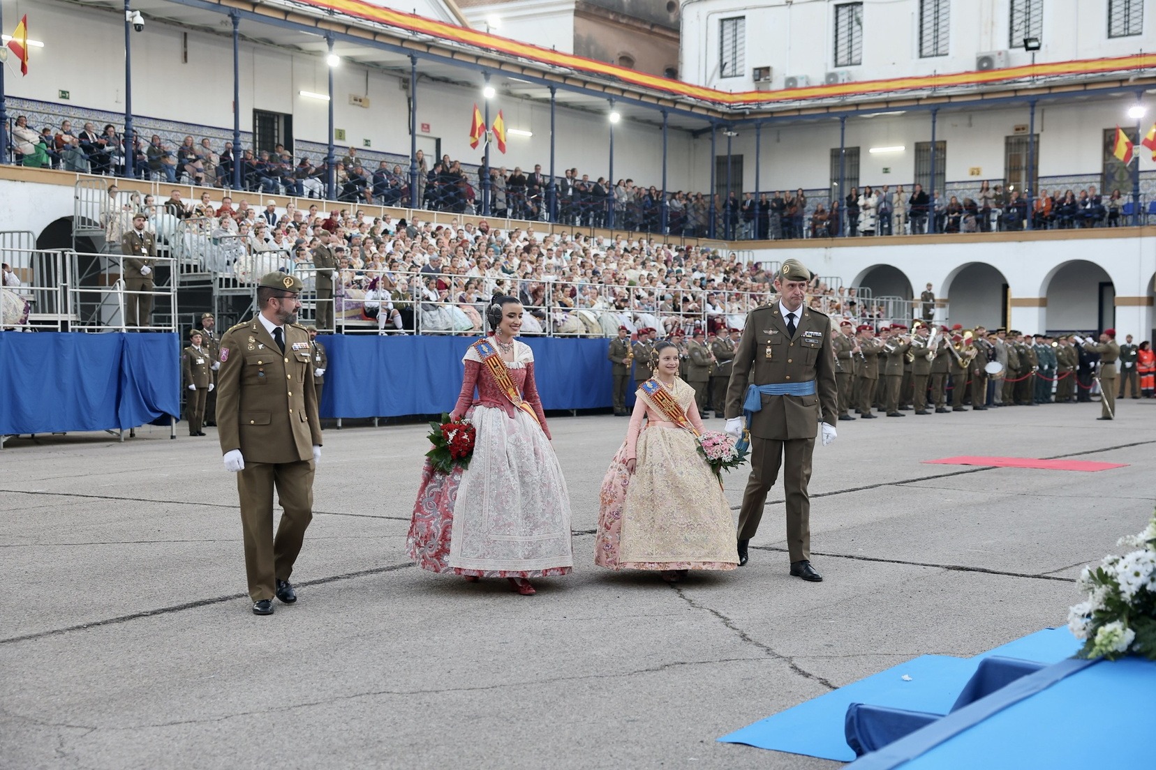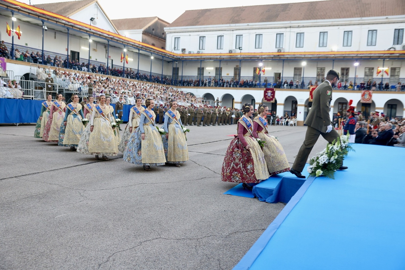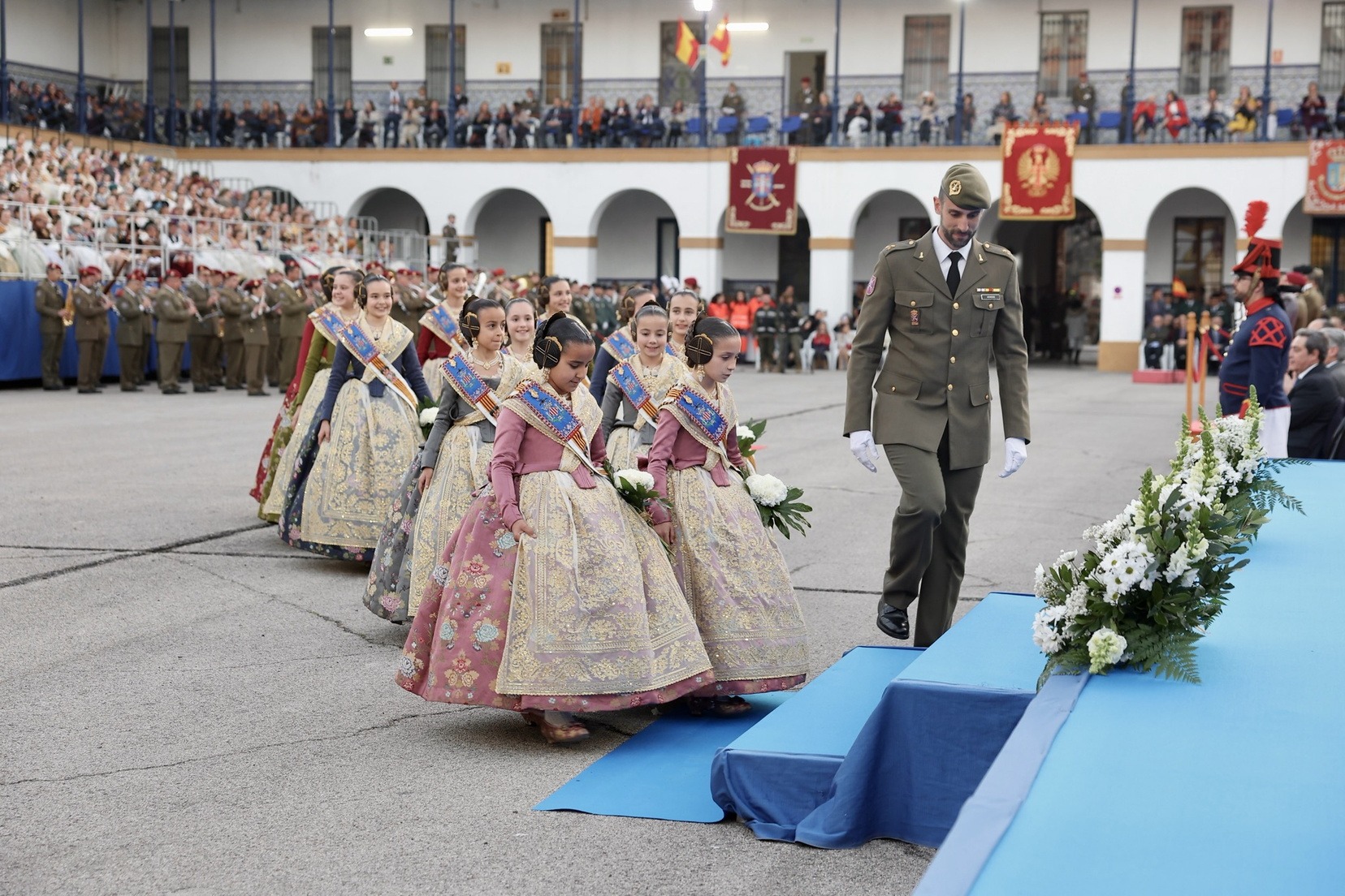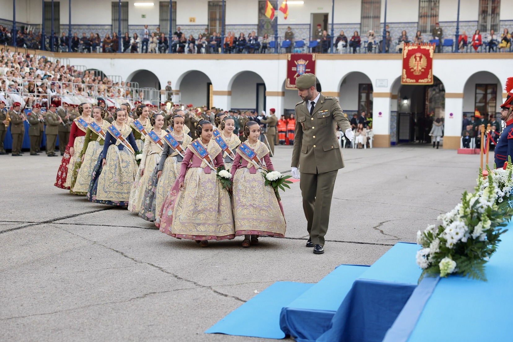 Las Falleras Mayores de Valencia, Carmen Prades y Marta Mercader, junto a sus Cortes de Honor, han llegado en carruaje, tal y como es tradicional, y tras ser recibidas por el Teniente General del Cuartel General Terrestre de Alta Disponibilidad, Luis Sáez Rocandio, han presidido junto a él este solemne homenaje que una vez más ha contado con la presencia de numerosas autoridades civiles y militares.