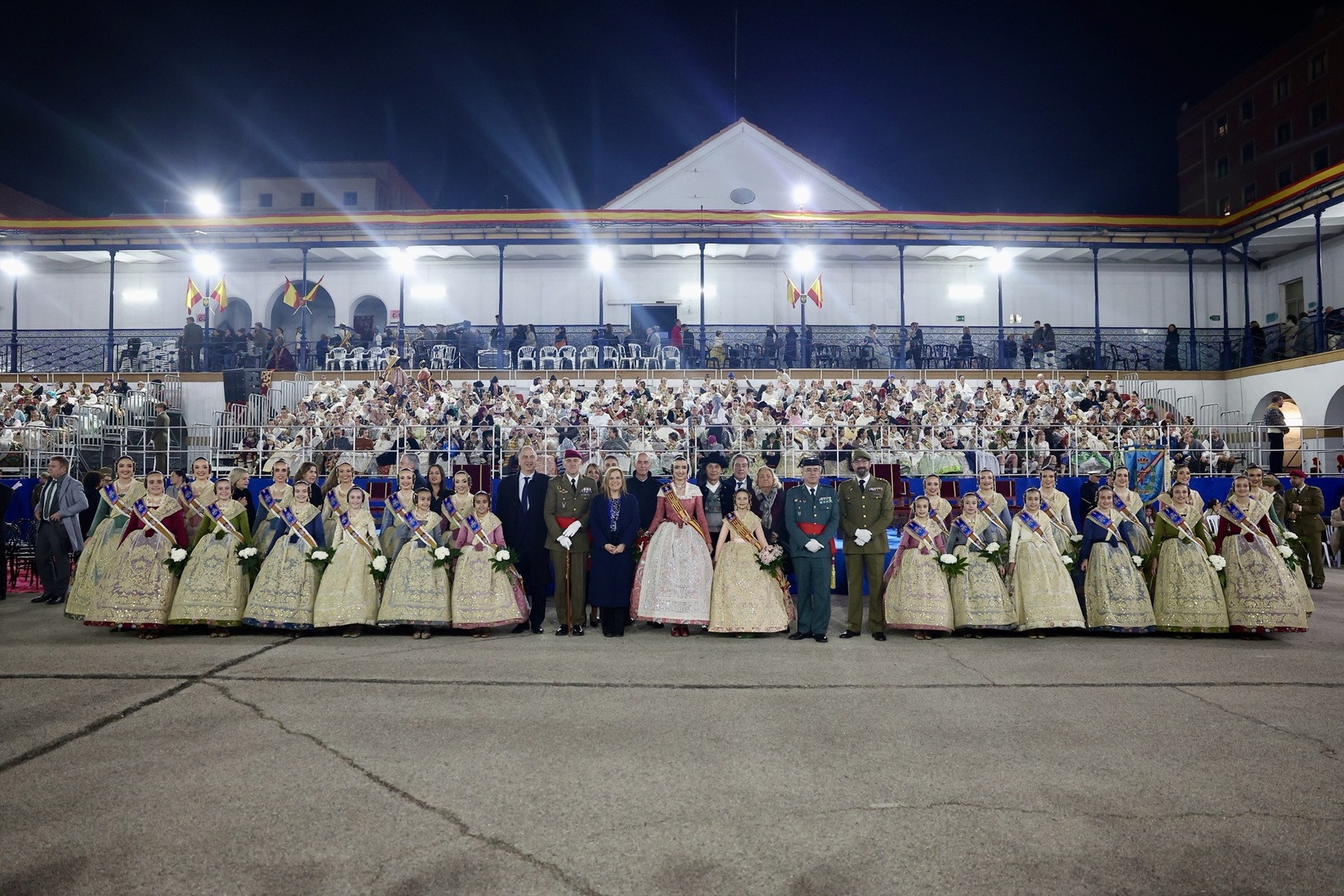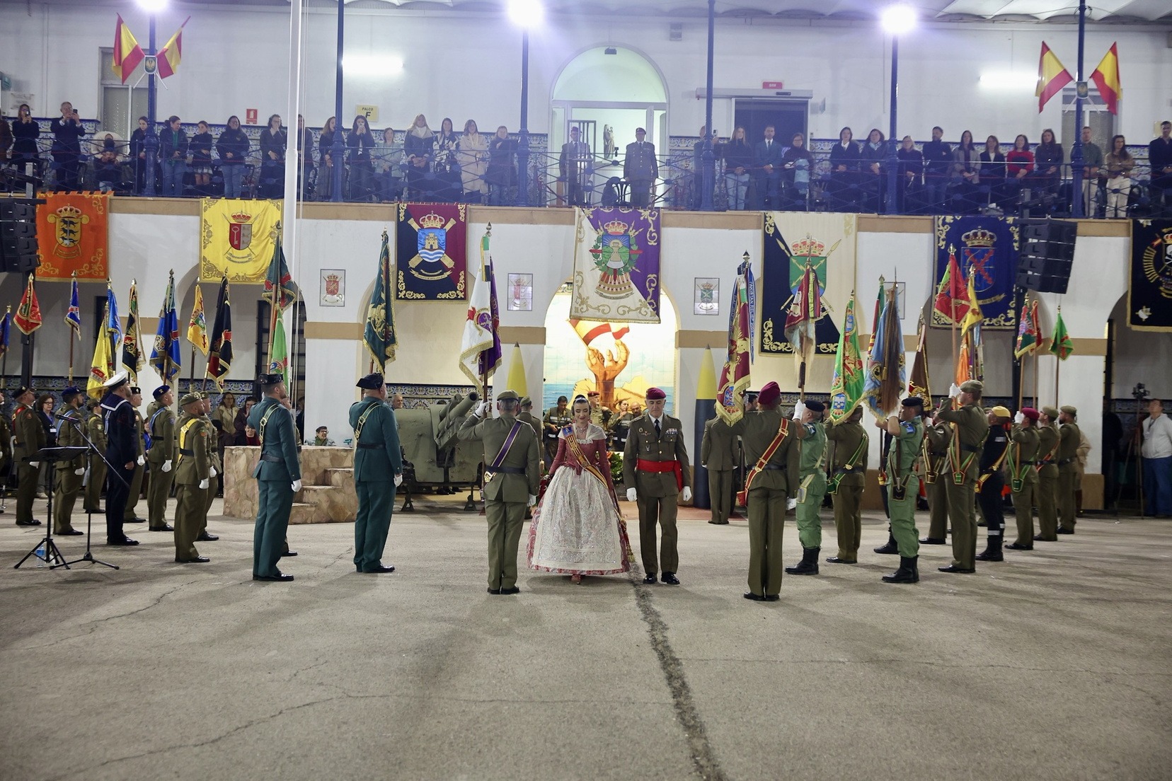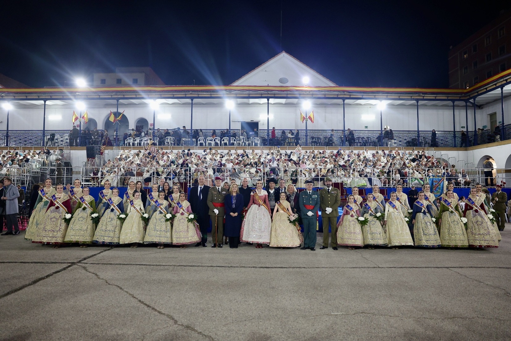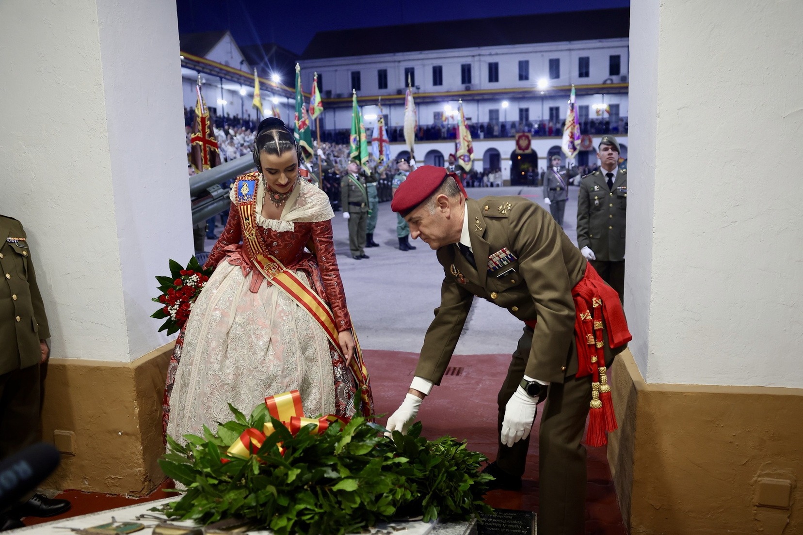 Las Falleras Mayores de Valencia, Carmen Prades y Marta Mercader, junto a sus Cortes de Honor, han llegado en carruaje, tal y como es tradicional, y tras ser recibidas por el Teniente General del Cuartel General Terrestre de Alta Disponibilidad, Luis Sáez Rocandio, han presidido junto a él este solemne homenaje que una vez más ha contado con la presencia de numerosas autoridades civiles y militares.