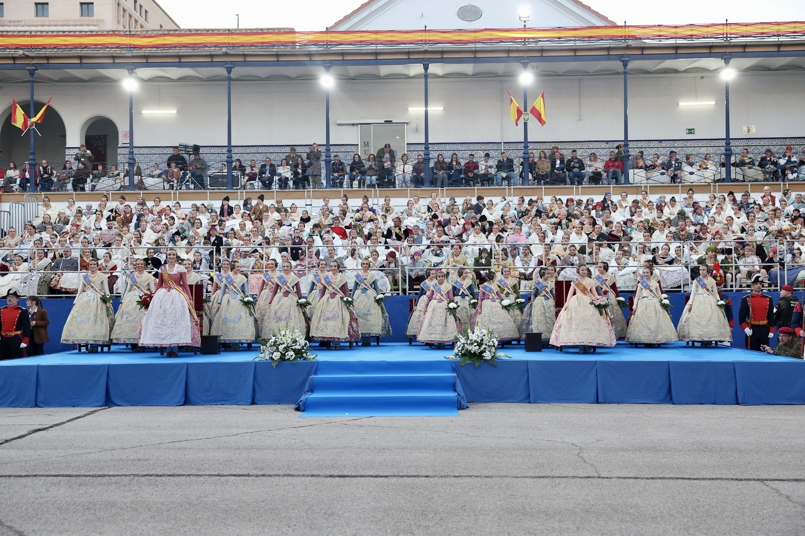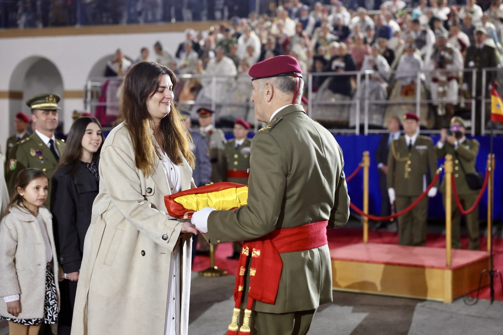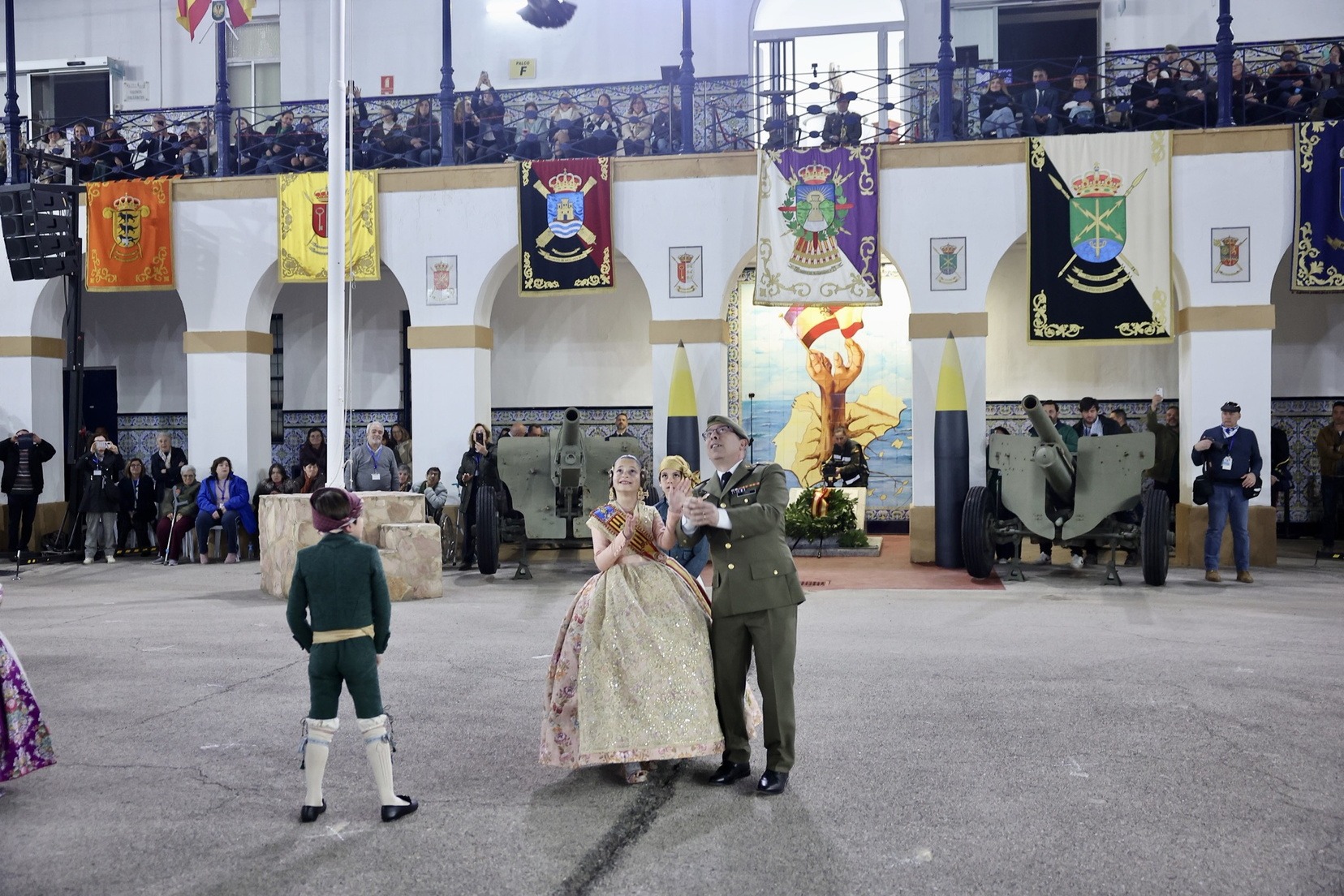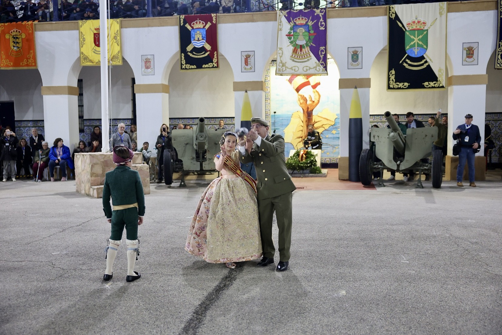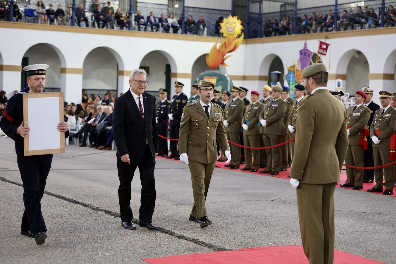 Las Falleras Mayores de Valencia, Carmen Prades y Marta Mercader, junto a sus Cortes de Honor, han llegado en carruaje, tal y como es tradicional, y tras ser recibidas por el Teniente General del Cuartel General Terrestre de Alta Disponibilidad, Luis Sáez Rocandio, han presidido junto a él este solemne homenaje que una vez más ha contado con la presencia de numerosas autoridades civiles y militares.