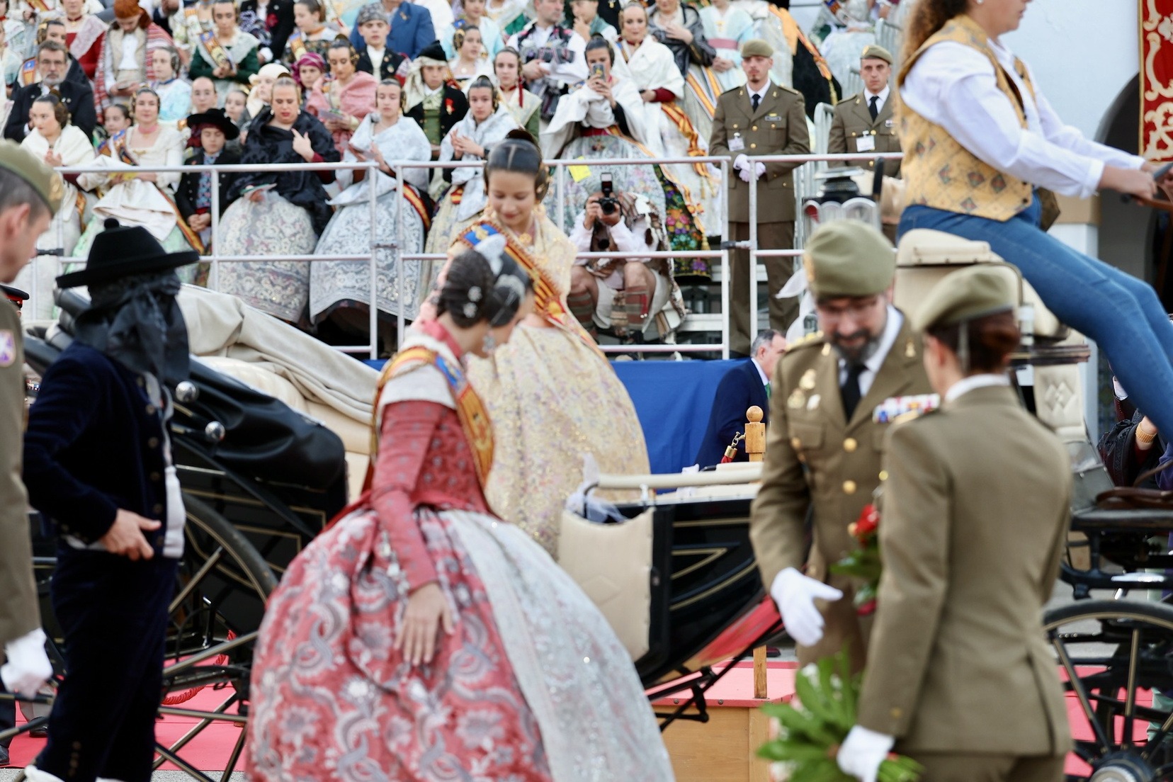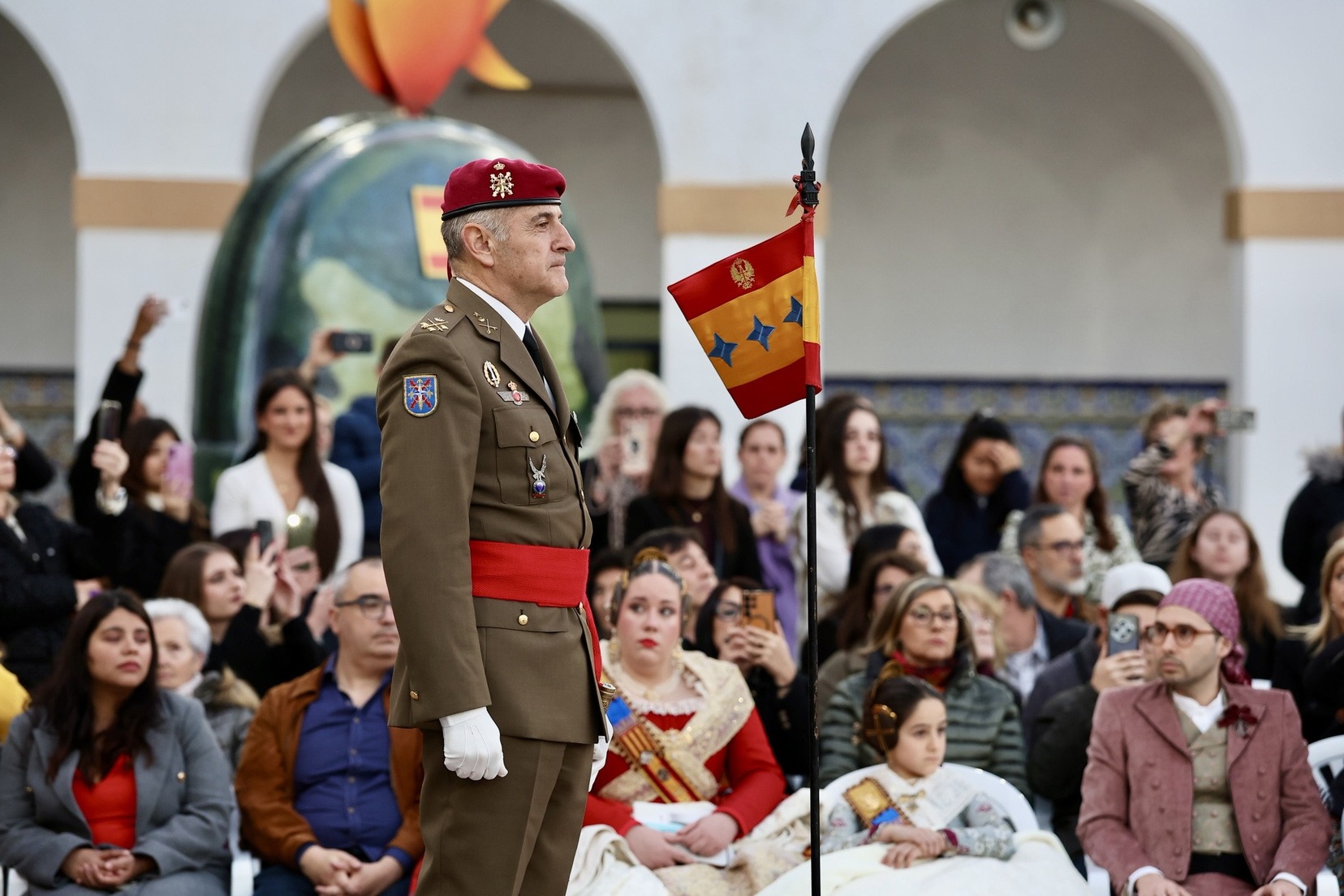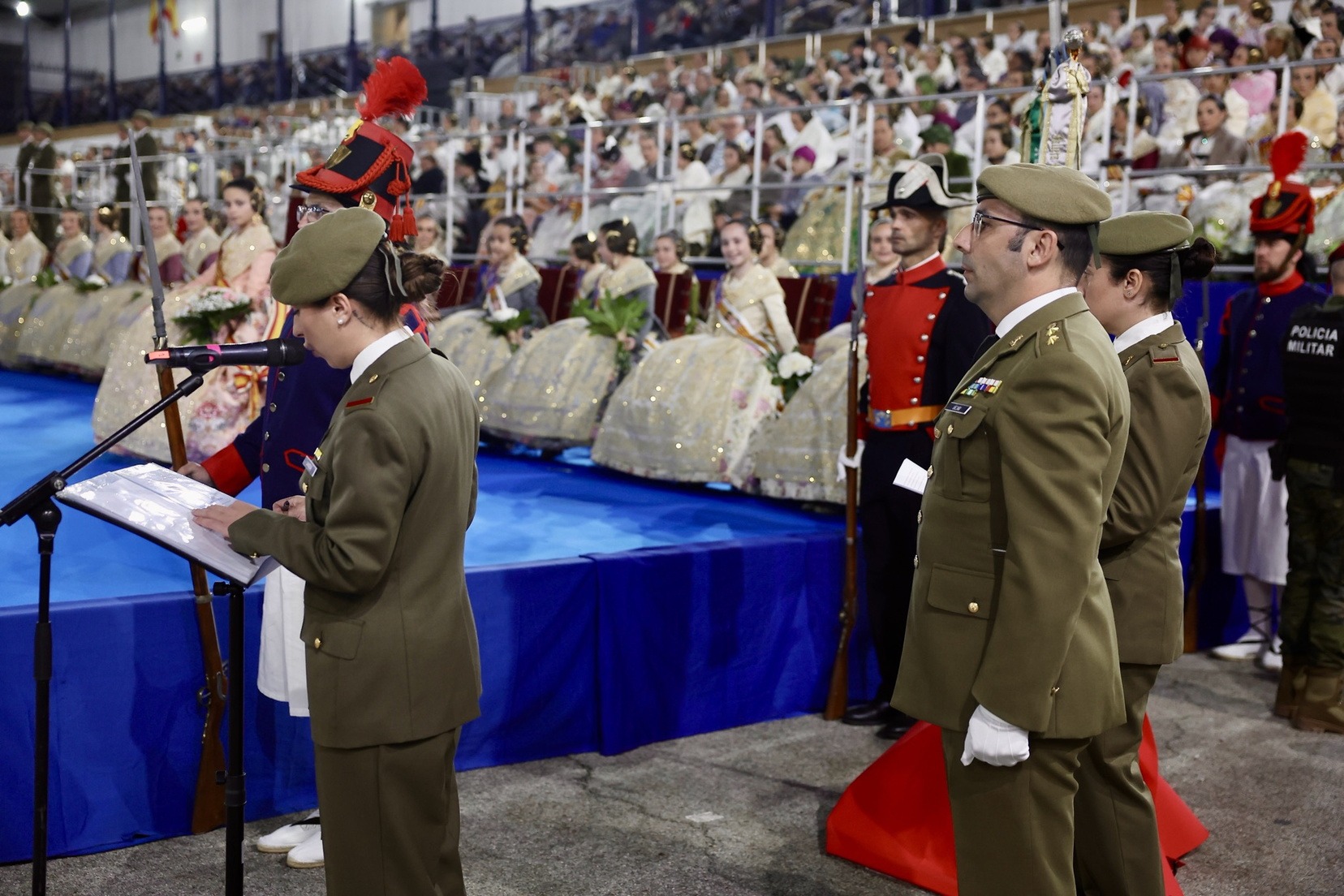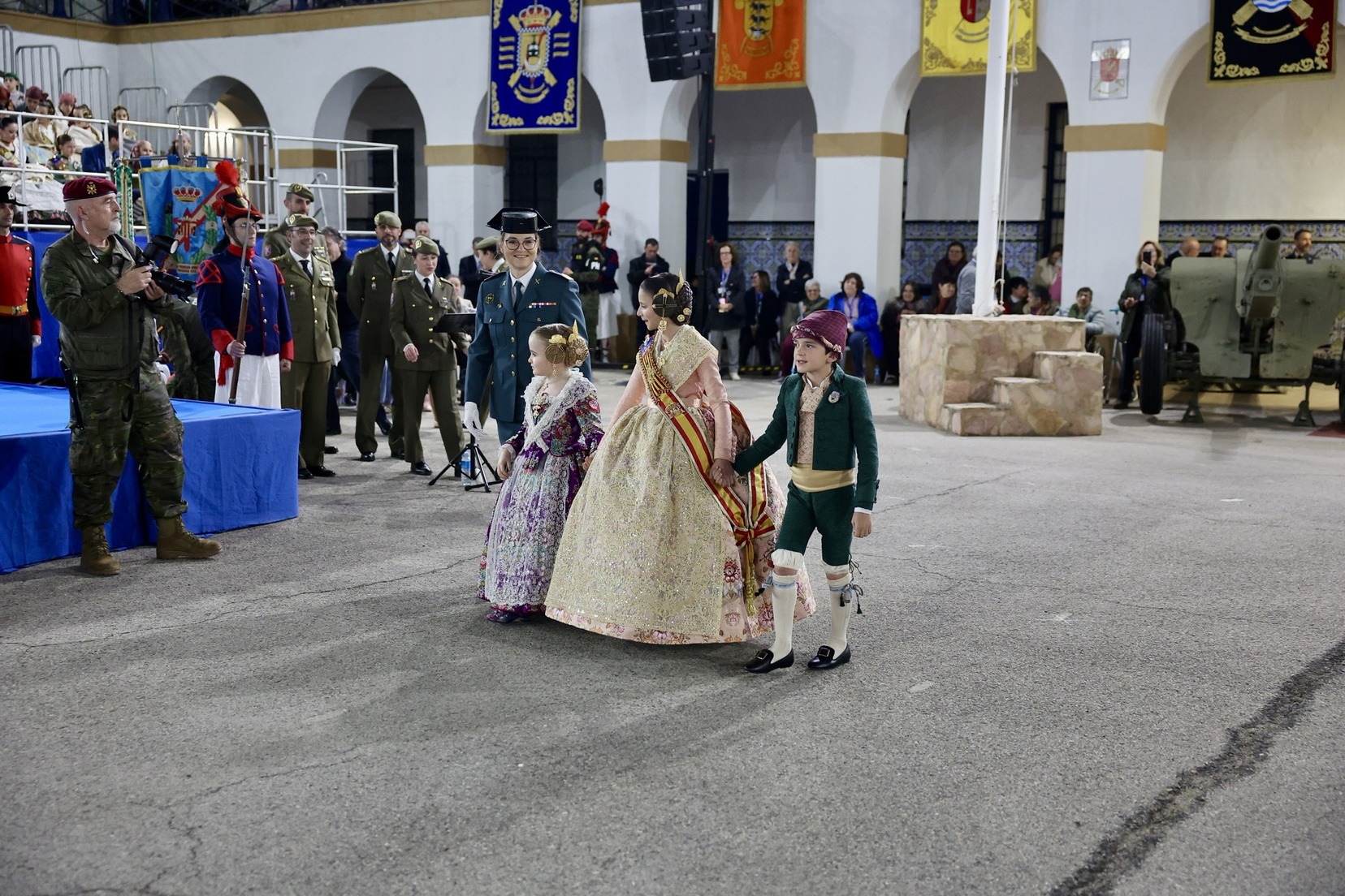 Las Falleras Mayores de Valencia, Carmen Prades y Marta Mercader, junto a sus Cortes de Honor, han llegado en carruaje, tal y como es tradicional, y tras ser recibidas por el Teniente General del Cuartel General Terrestre de Alta Disponibilidad, Luis Sáez Rocandio, han presidido junto a él este solemne homenaje que una vez más ha contado con la presencia de numerosas autoridades civiles y militares.