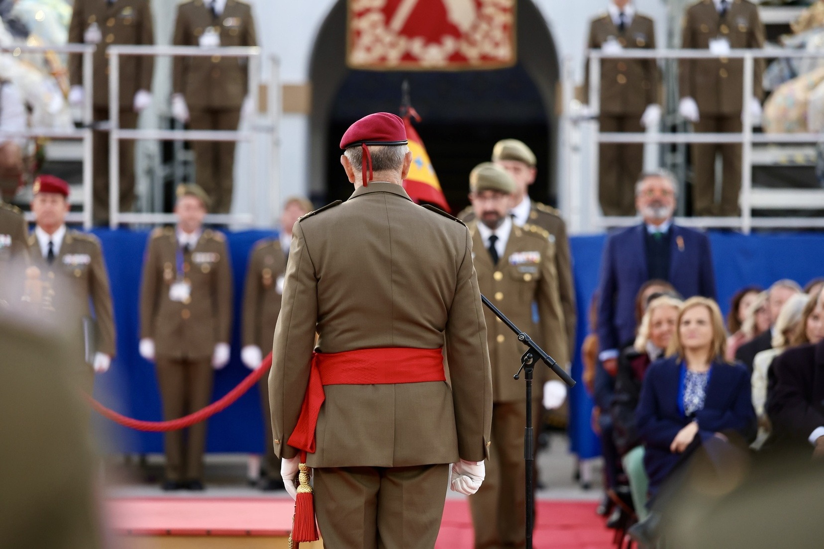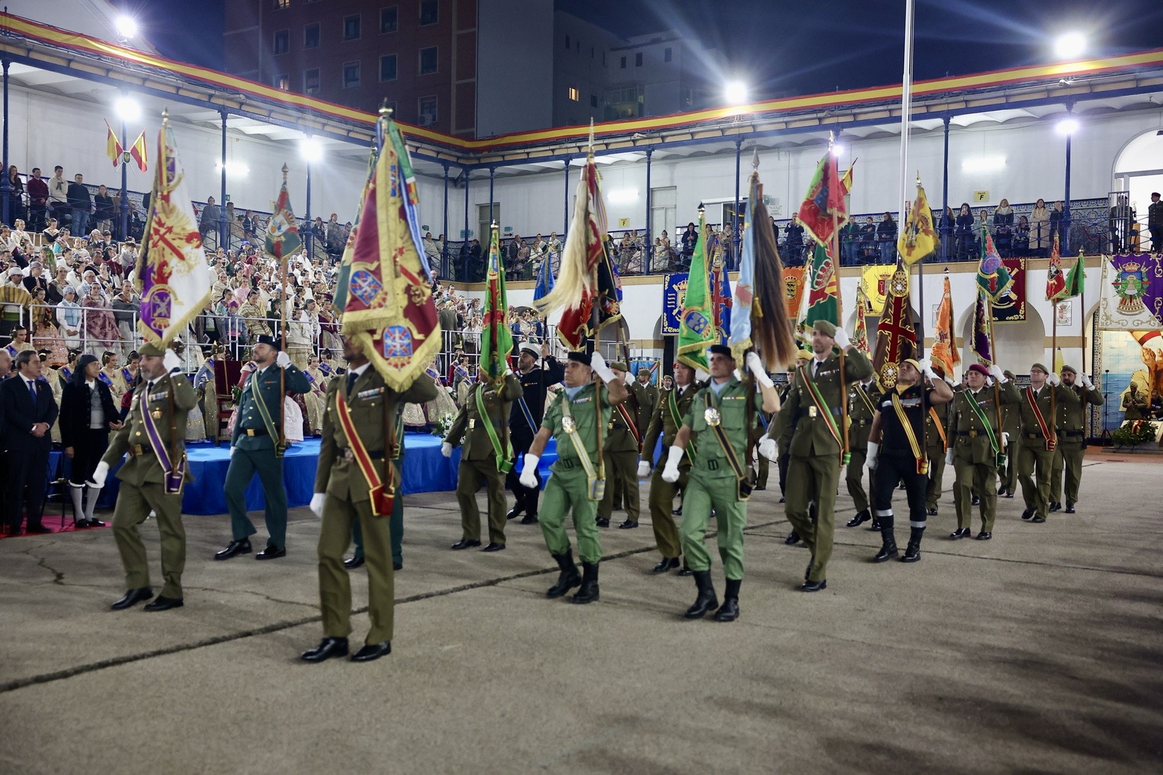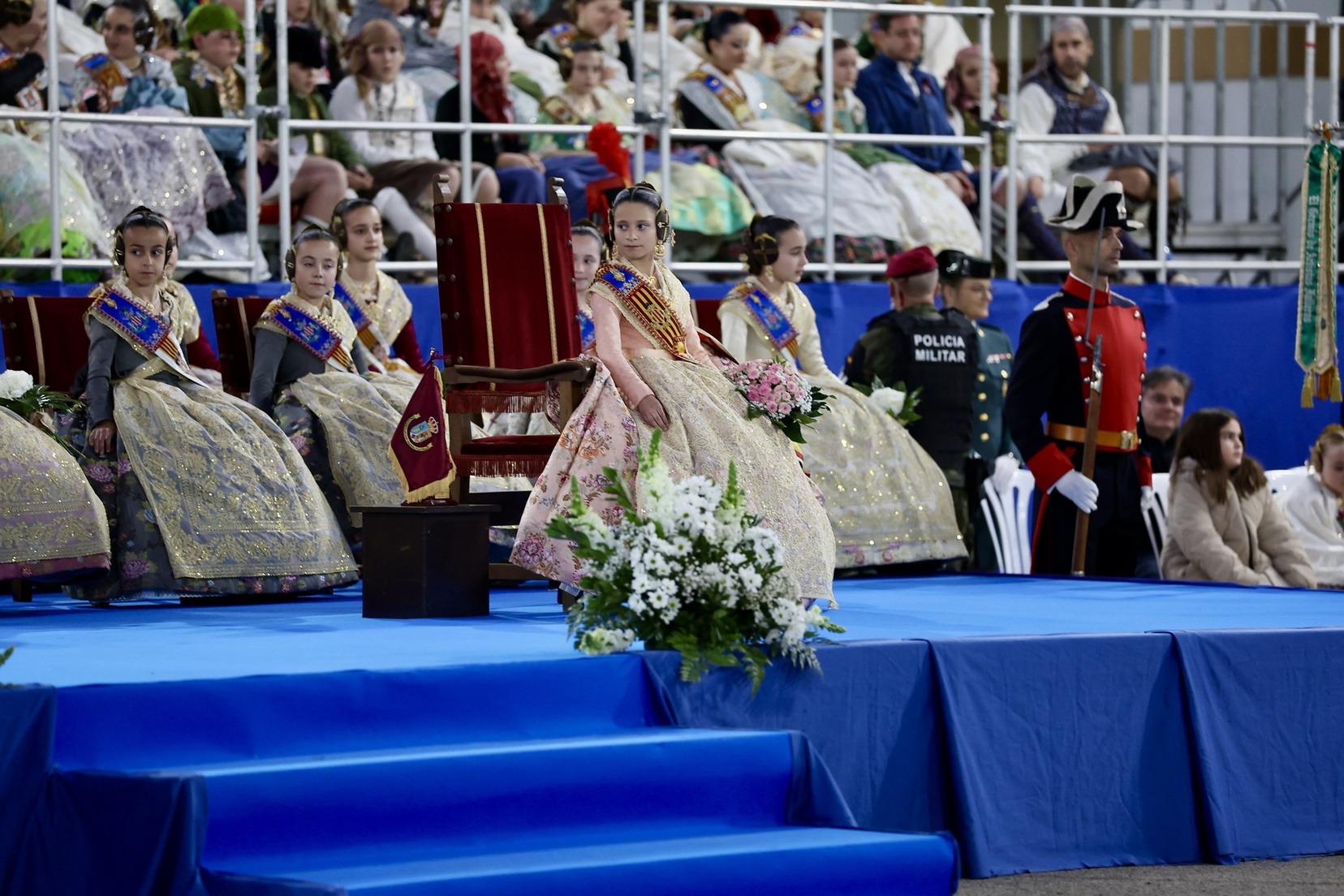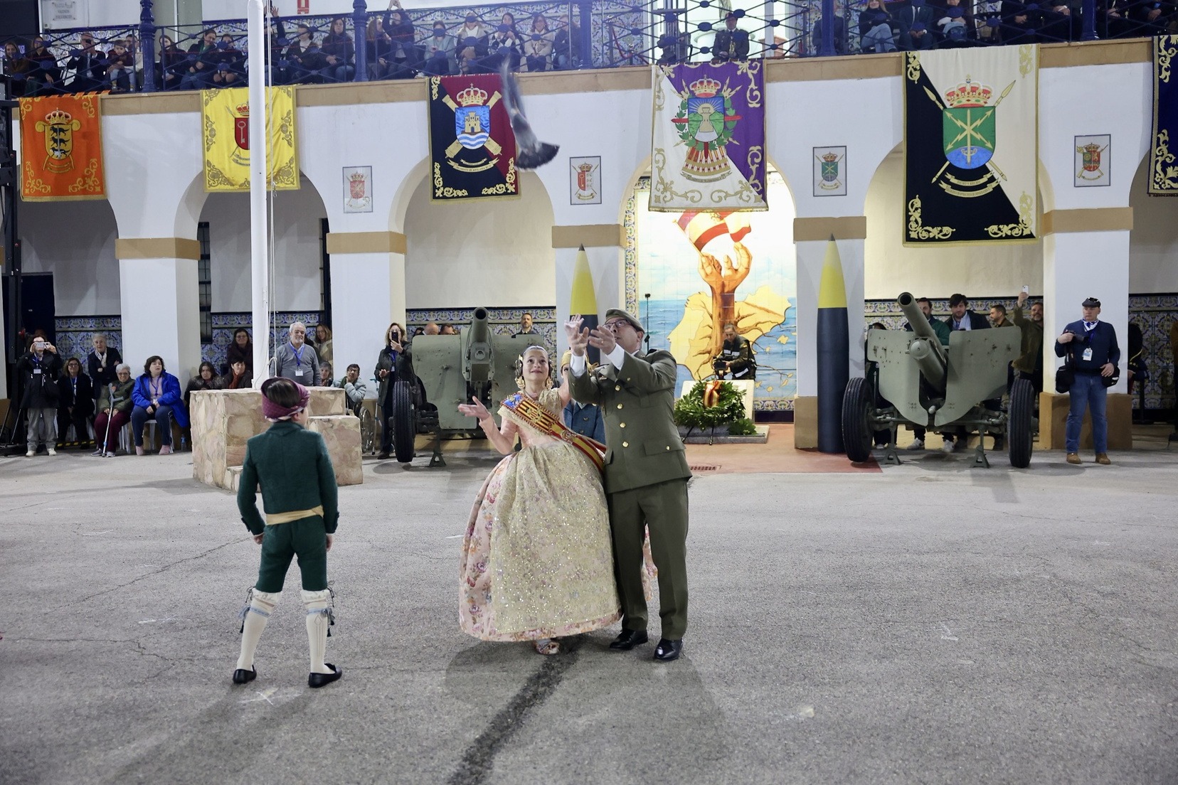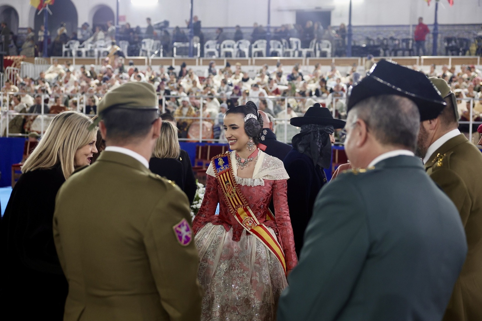 Las Falleras Mayores de Valencia, Carmen Prades y Marta Mercader, junto a sus Cortes de Honor, han llegado en carruaje, tal y como es tradicional, y tras ser recibidas por el Teniente General del Cuartel General Terrestre de Alta Disponibilidad, Luis Sáez Rocandio, han presidido junto a él este solemne homenaje que una vez más ha contado con la presencia de numerosas autoridades civiles y militares.