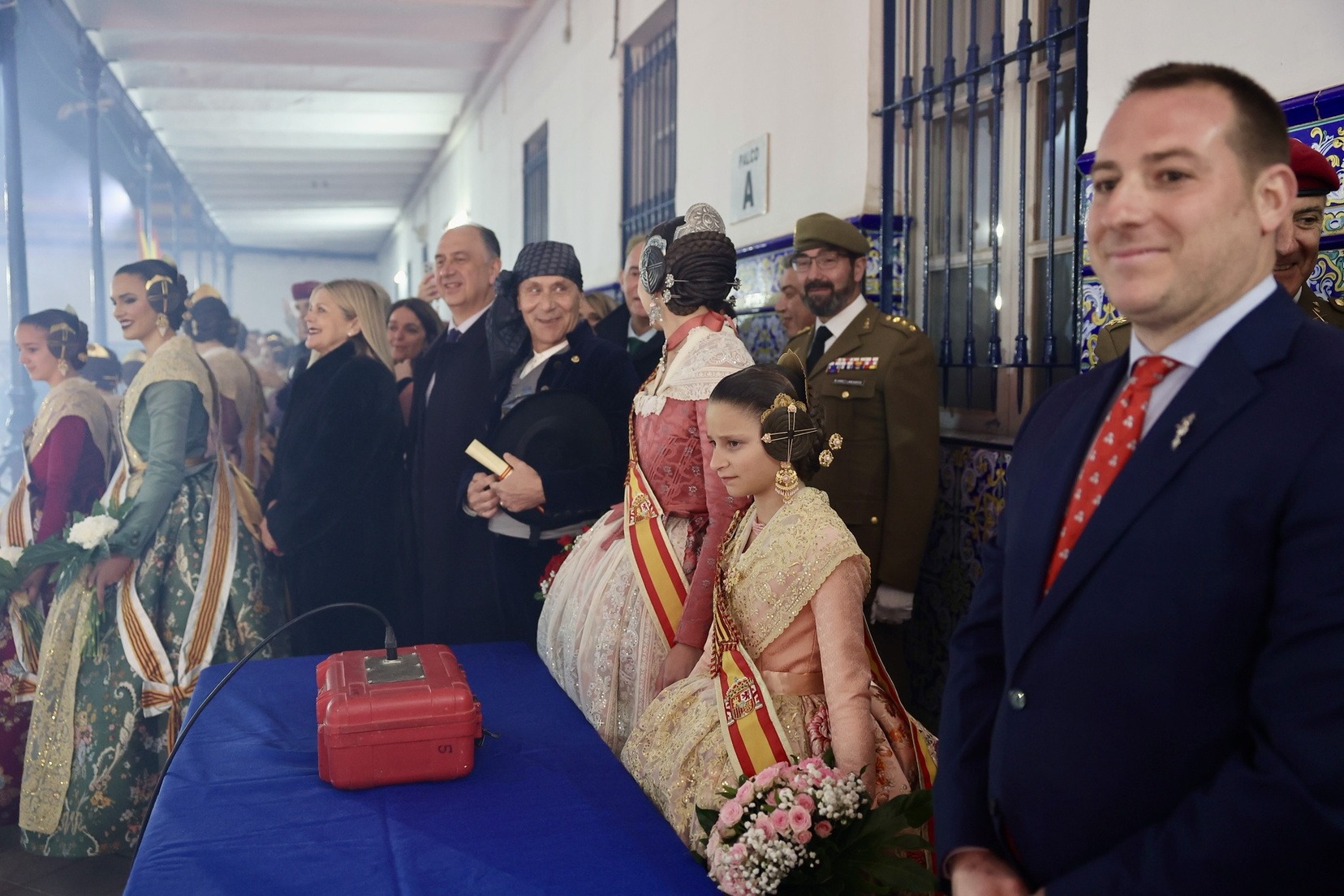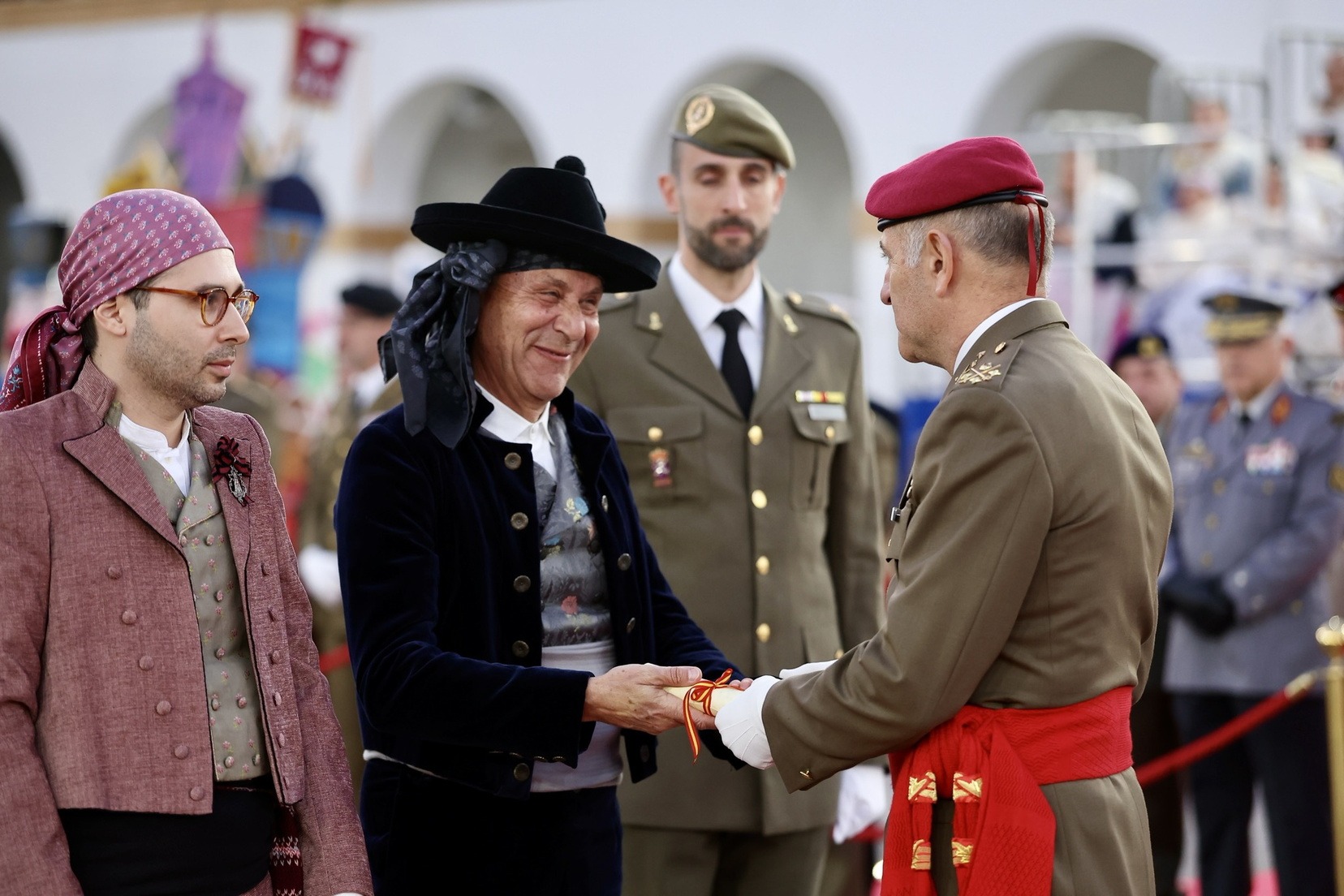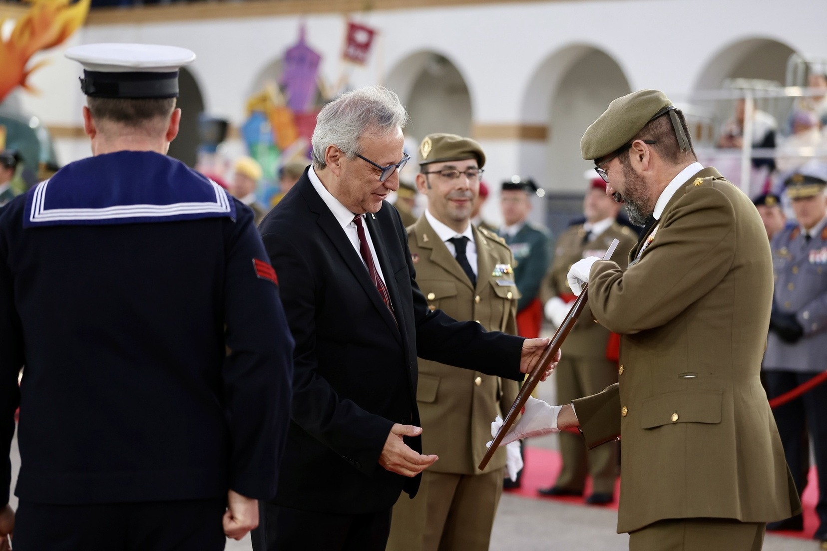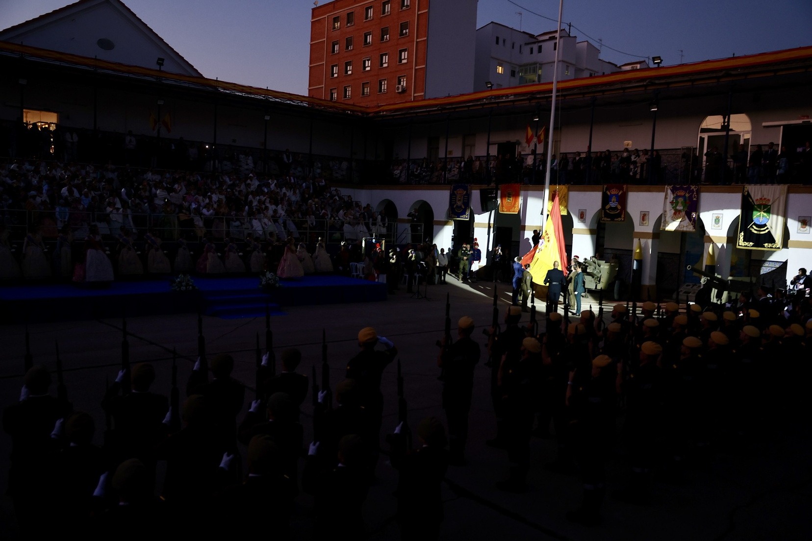 Las Falleras Mayores de Valencia, Carmen Prades y Marta Mercader, junto a sus Cortes de Honor, han llegado en carruaje, tal y como es tradicional, y tras ser recibidas por el Teniente General del Cuartel General Terrestre de Alta Disponibilidad, Luis Sáez Rocandio, han presidido junto a él este solemne homenaje que una vez más ha contado con la presencia de numerosas autoridades civiles y militares.