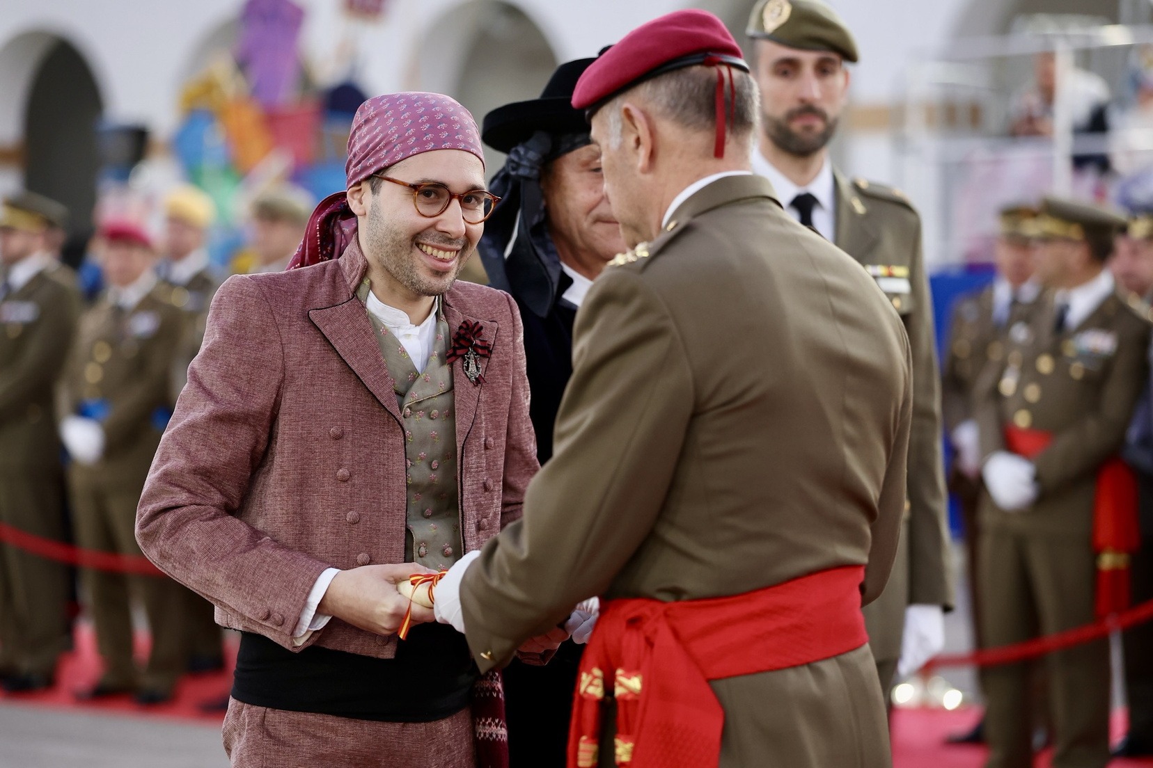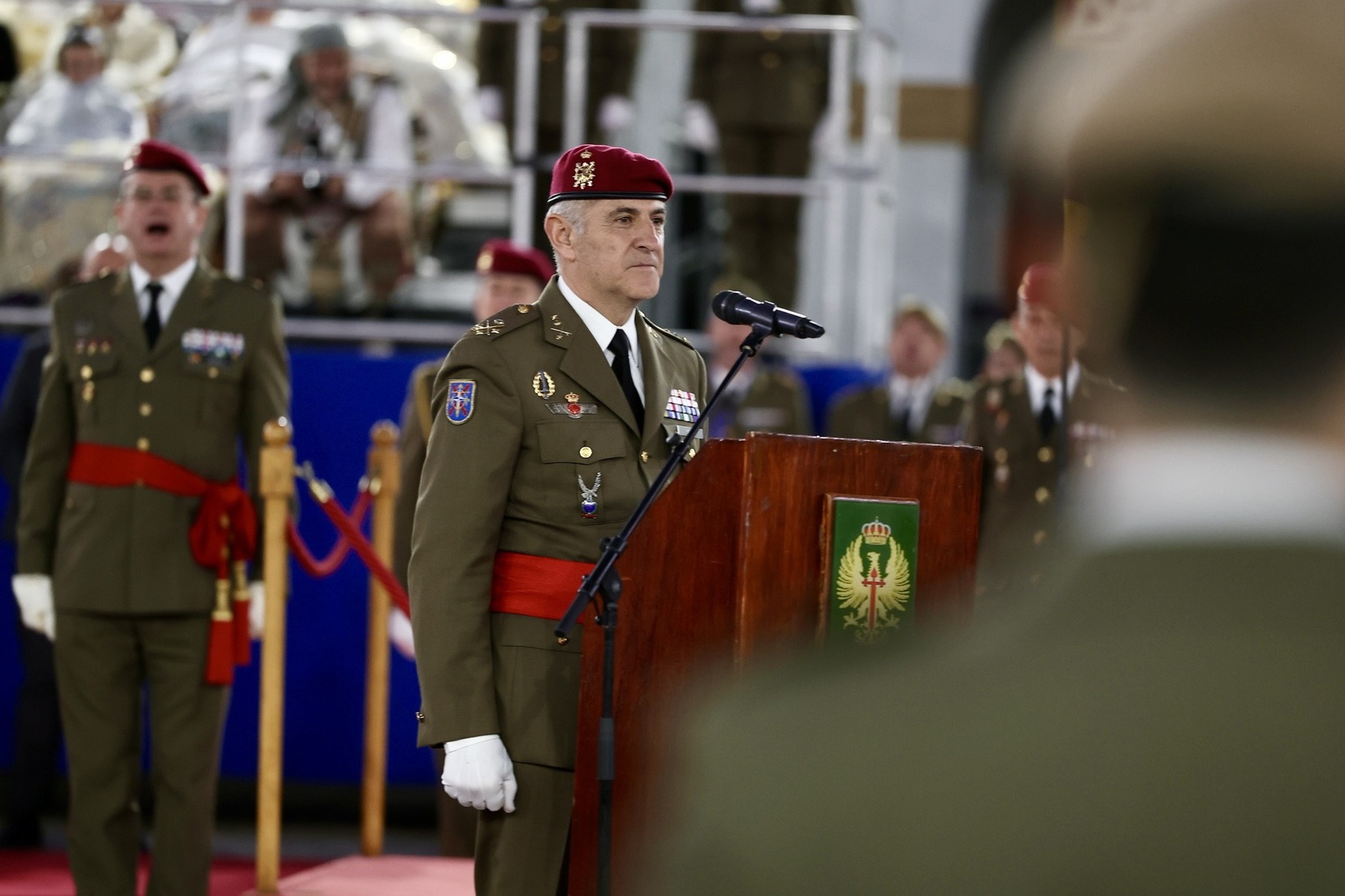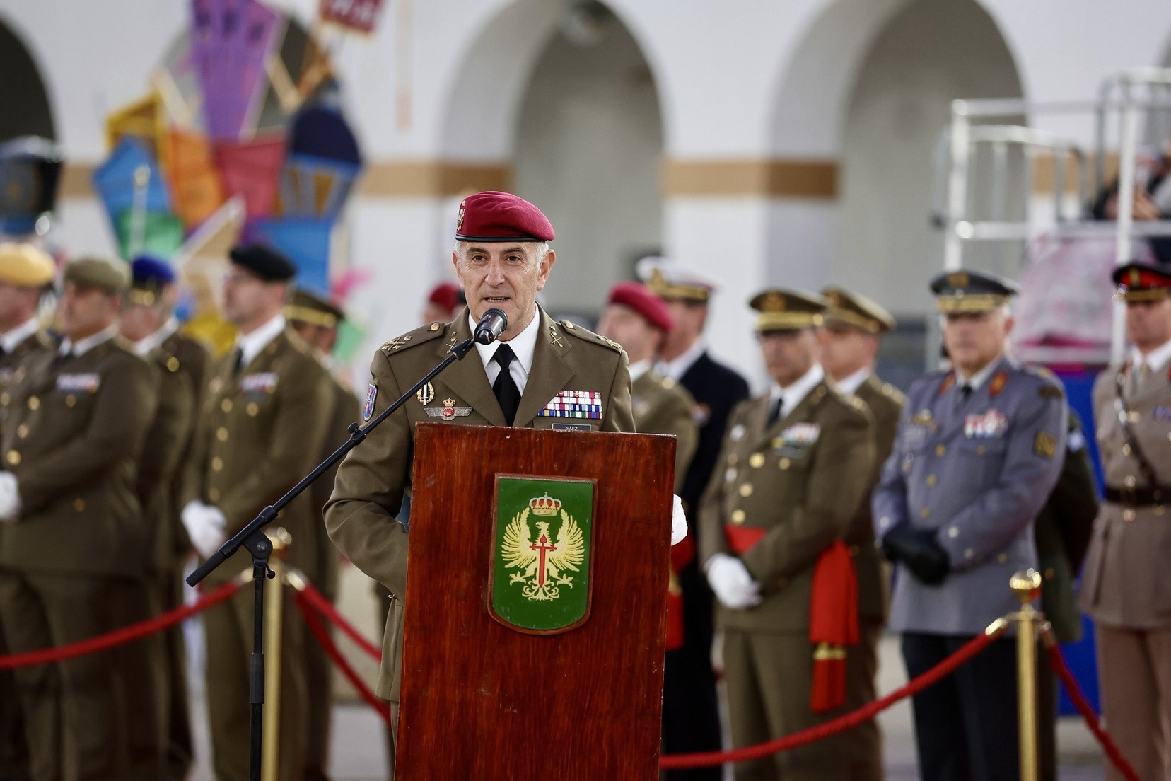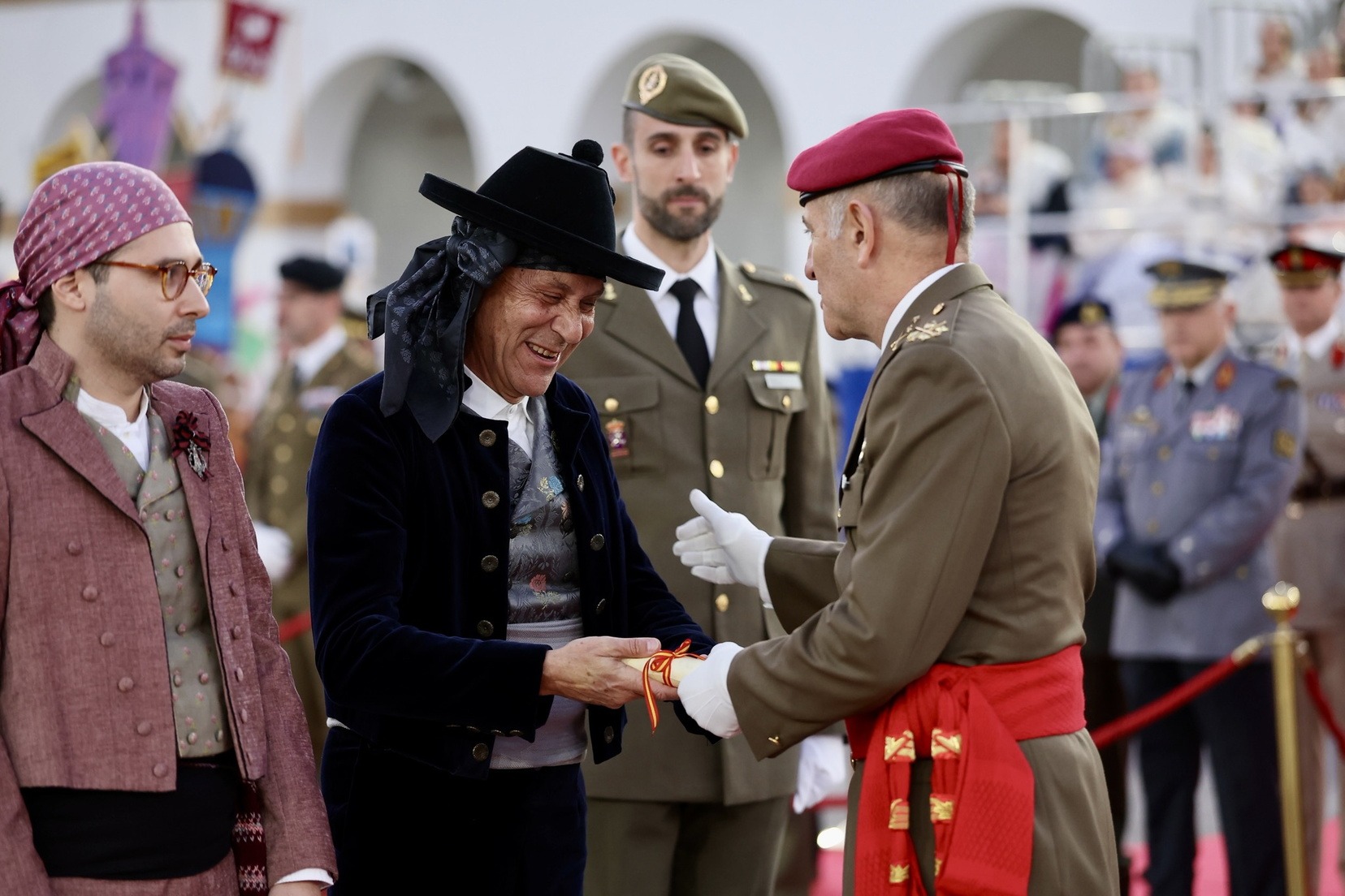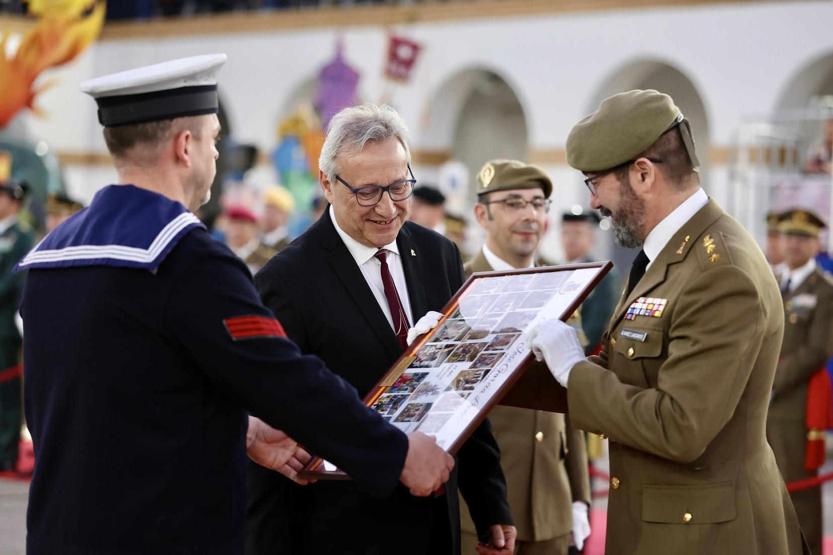 Las Falleras Mayores de Valencia, Carmen Prades y Marta Mercader, junto a sus Cortes de Honor, han llegado en carruaje, tal y como es tradicional, y tras ser recibidas por el Teniente General del Cuartel General Terrestre de Alta Disponibilidad, Luis Sáez Rocandio, han presidido junto a él este solemne homenaje que una vez más ha contado con la presencia de numerosas autoridades civiles y militares.