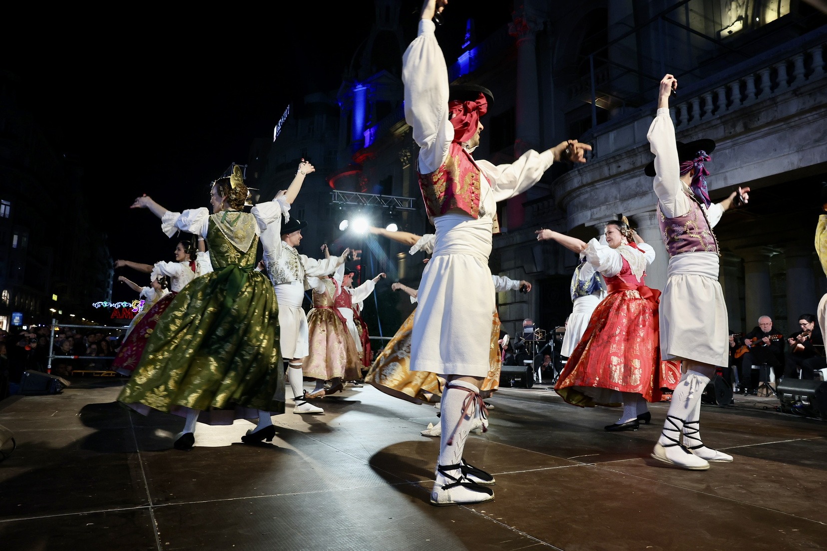 La ciudad de Valencia ha celebrado hoy una tradicional Muestra de Bailes Populares en la plaza del Ayuntamiento, un acto que ha llenado el centro de la ciudad de música, color y tradición en plena celebración de las Fallas.