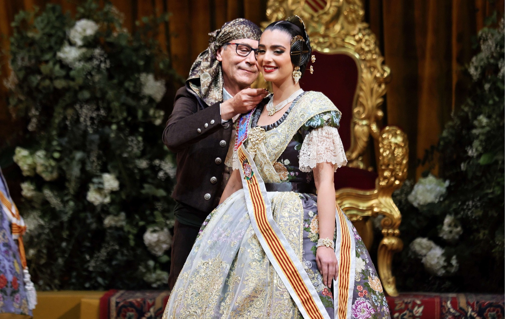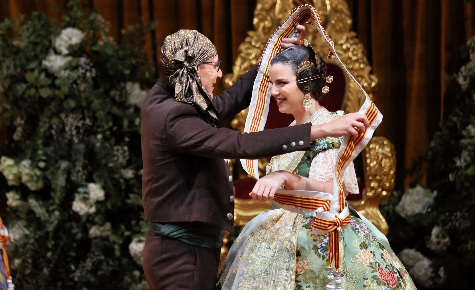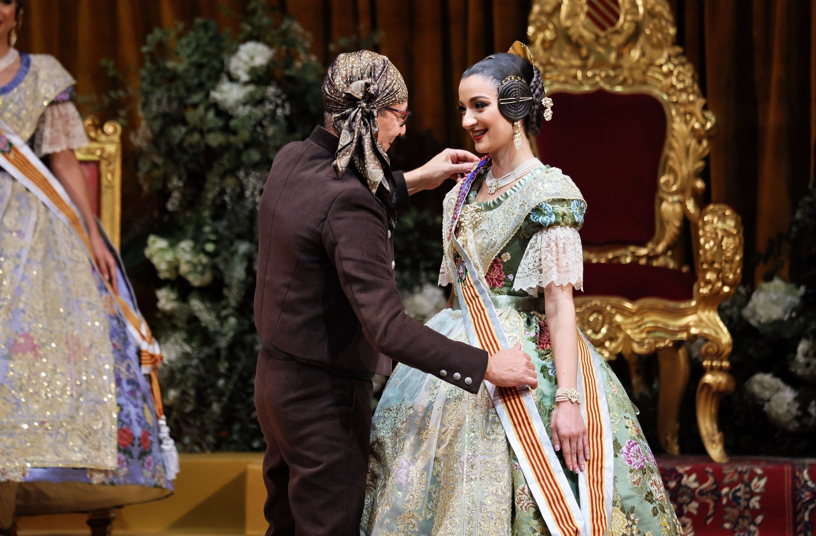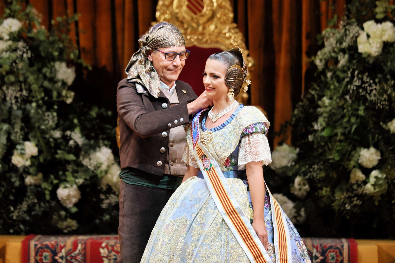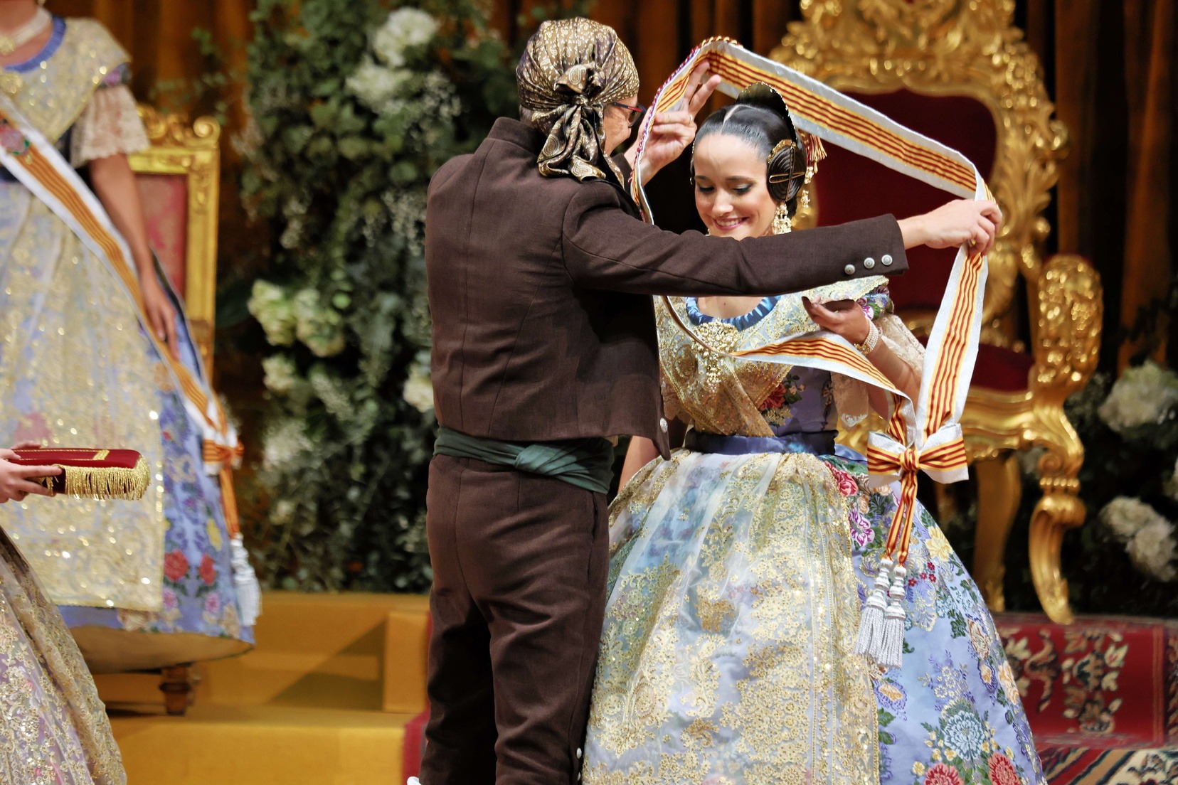 El Presidente de Junta Central Fallera, Santiago Ballester, las esperaba en el escenario para hacerles imposición de la ansiada banda y la joia que las acredita como máximas representantes del mundo fallero.
