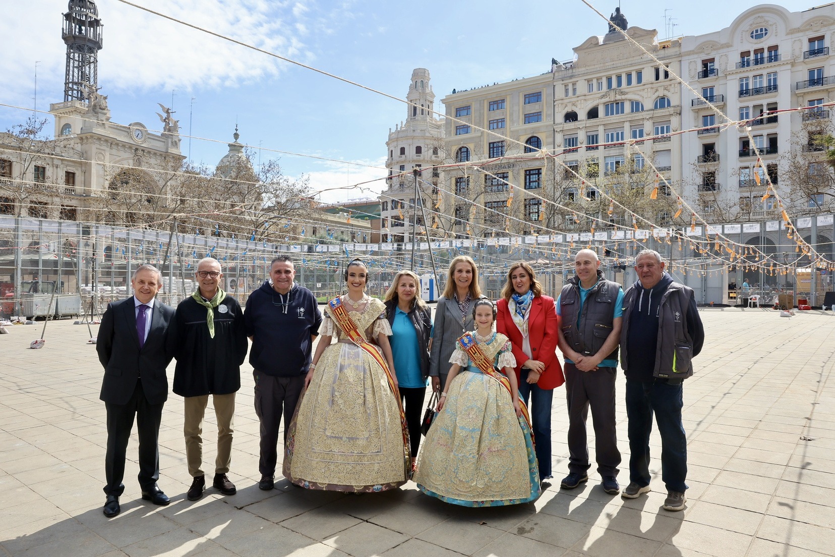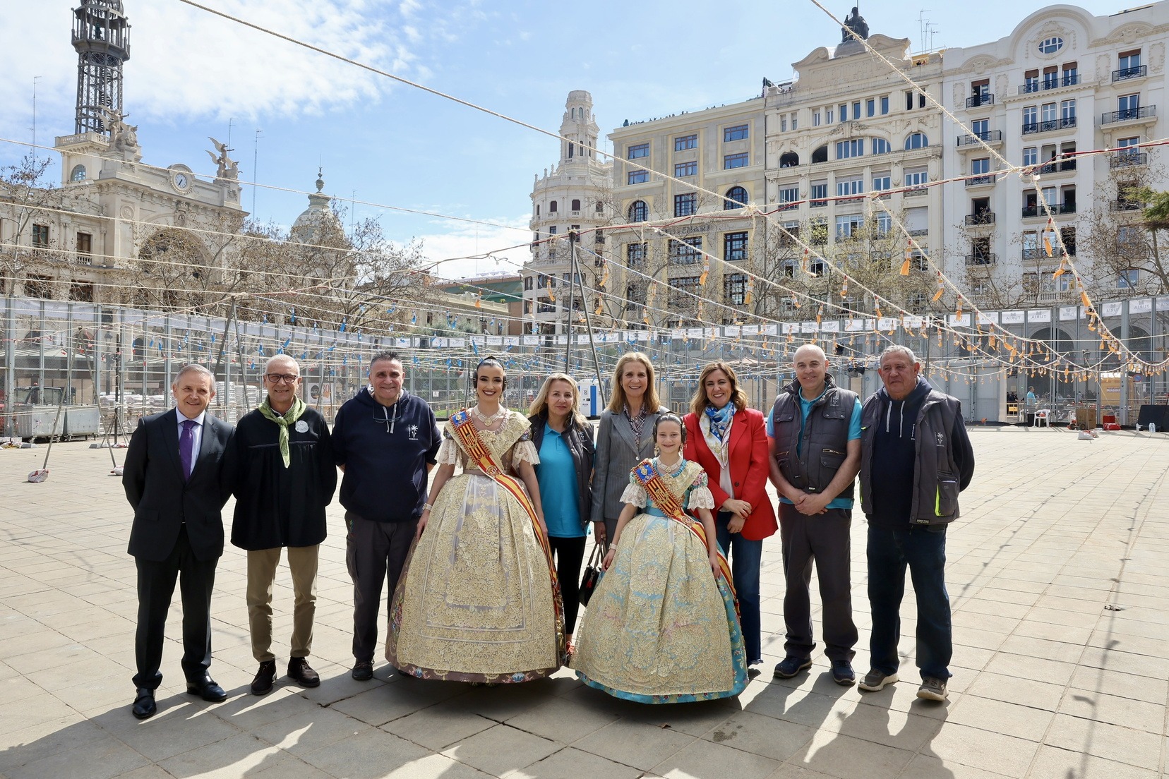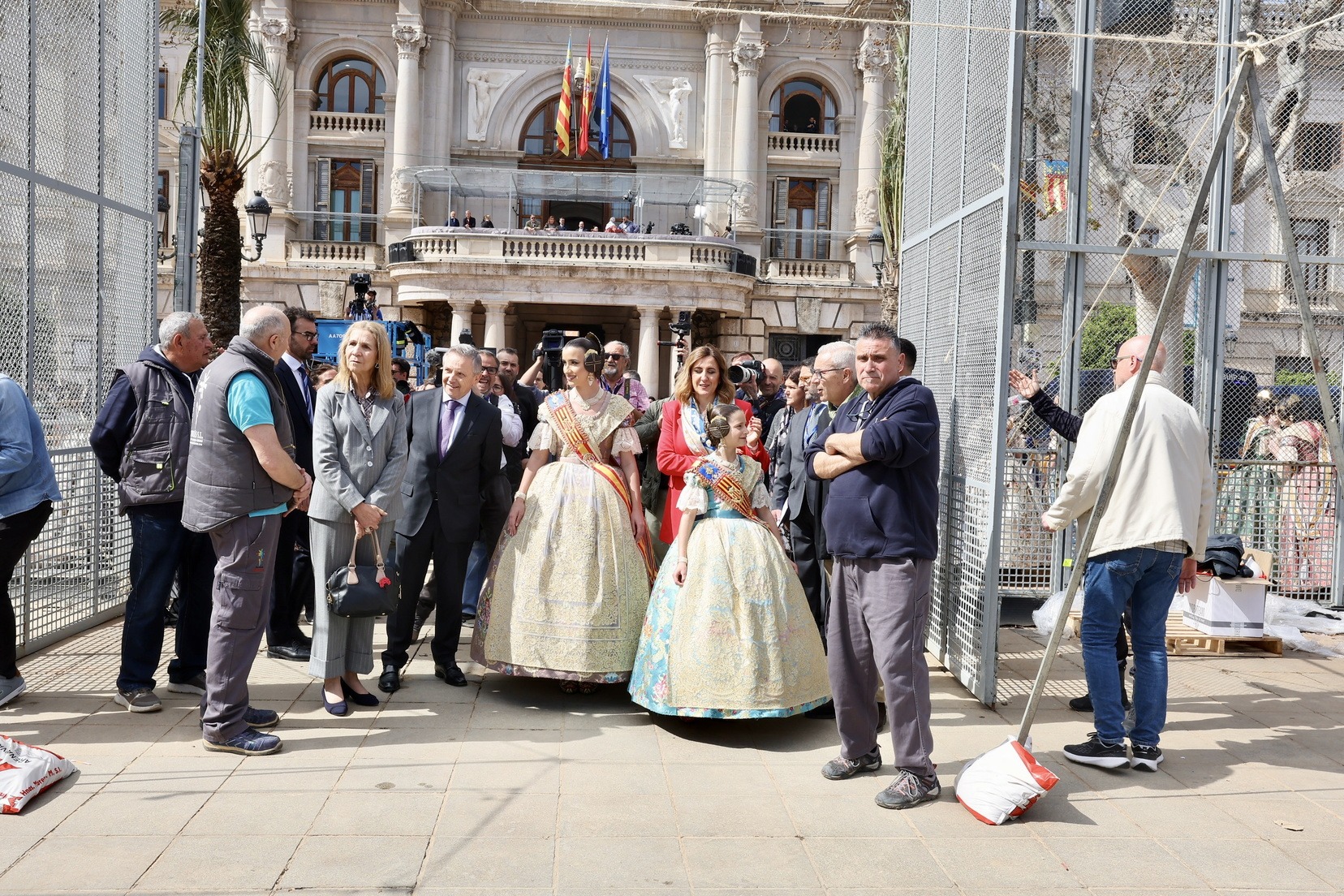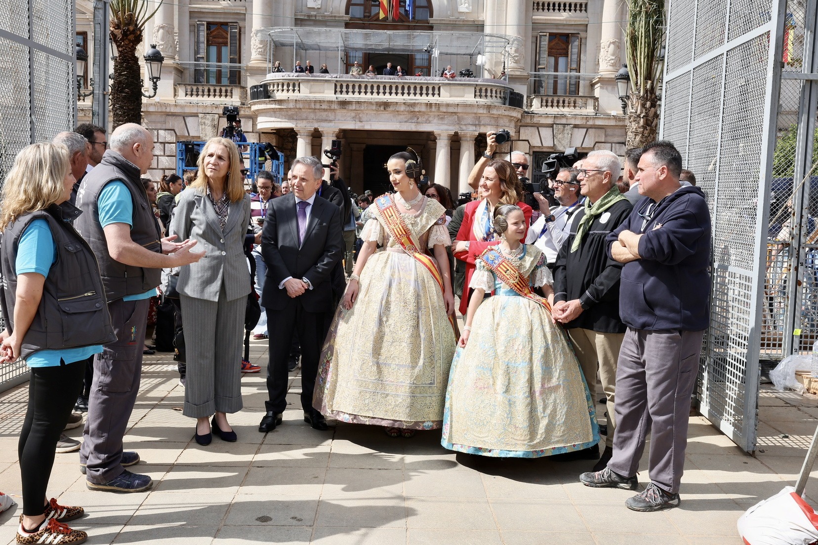 Posteriormente, doña Elena ha tenido la oportunidad de acceder a la zona de disparo para conocer de primera mano el trabajo previo al espectáculo pirotécnico. Allí ha podido ver cómo el equipo de Pirotecnia Tomás ultimaba los preparativos de la mascletà que se ha disparado en la Plaza del Ayuntamiento, una de las citas diarias más esperadas de las Fallas.