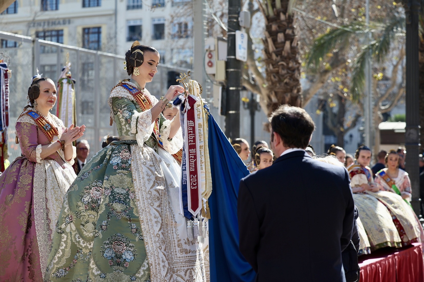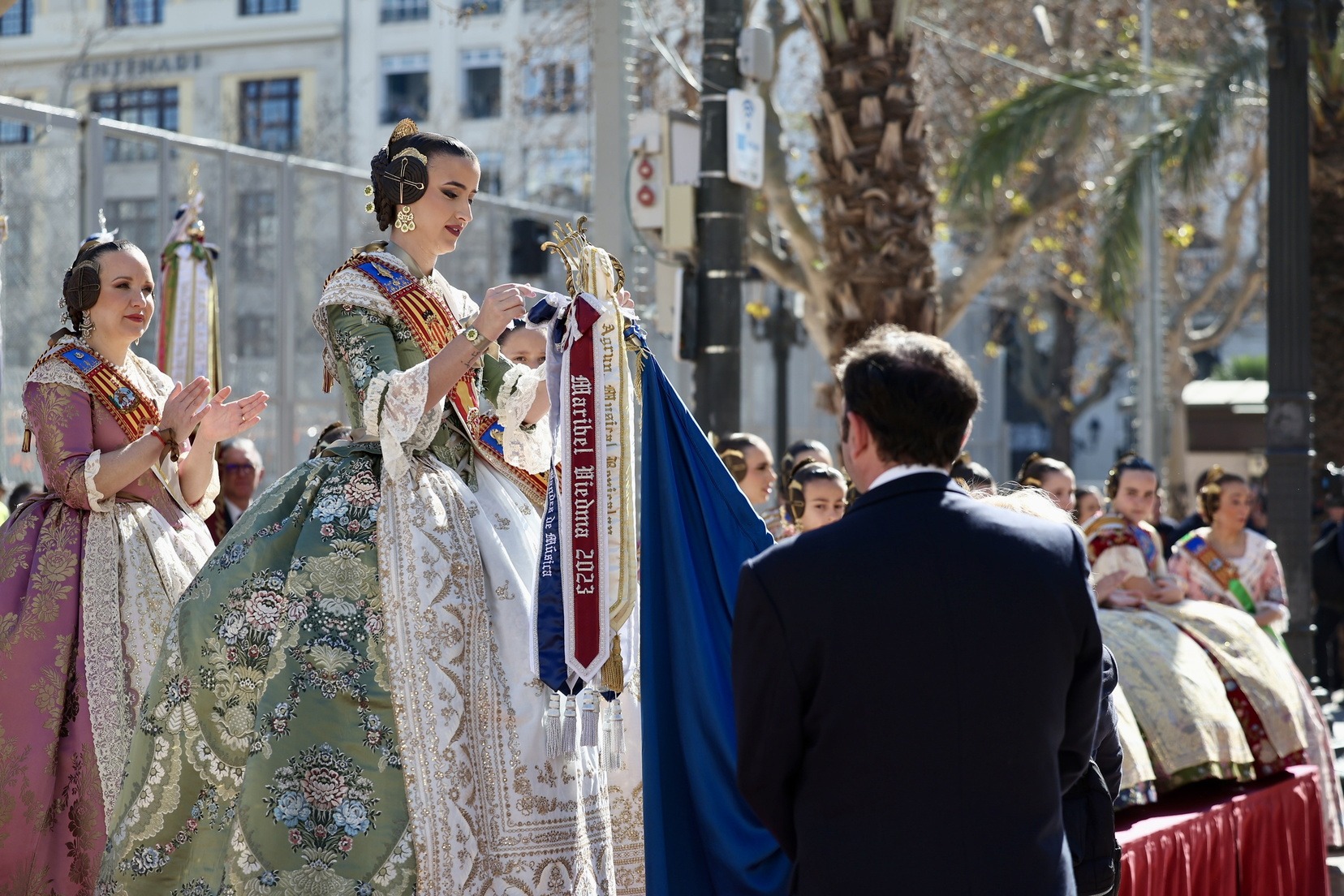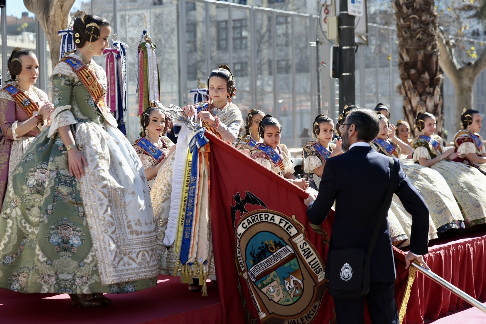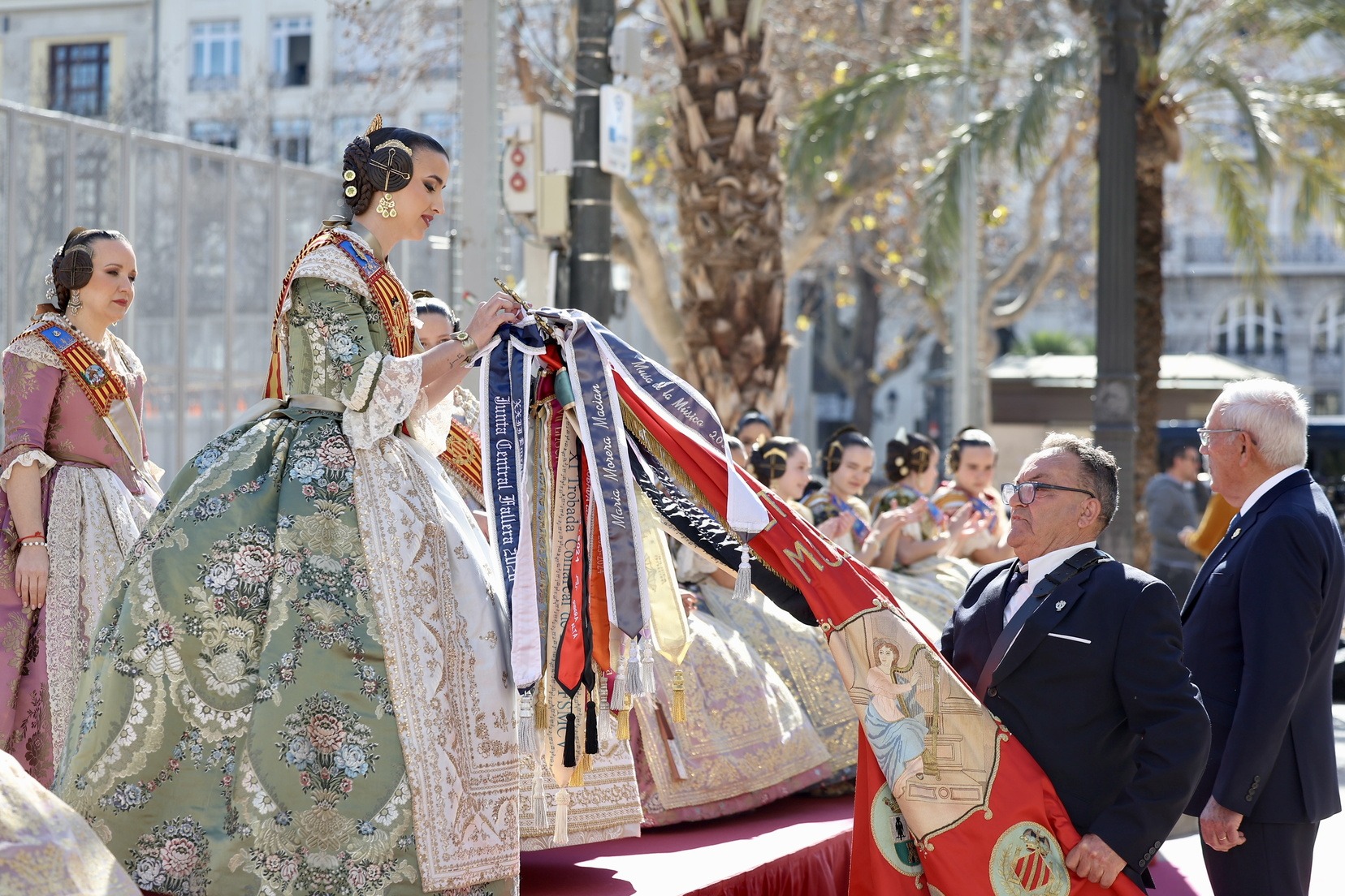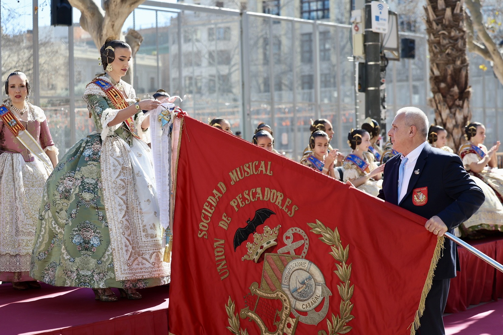 Al llegar a la tribuna situada frente al Ayuntamiento, han sido Carmen y Marta las encargadas de imponer el corbatín en recuerdo de este año a los estandartes de las diferentes bandas participantes.