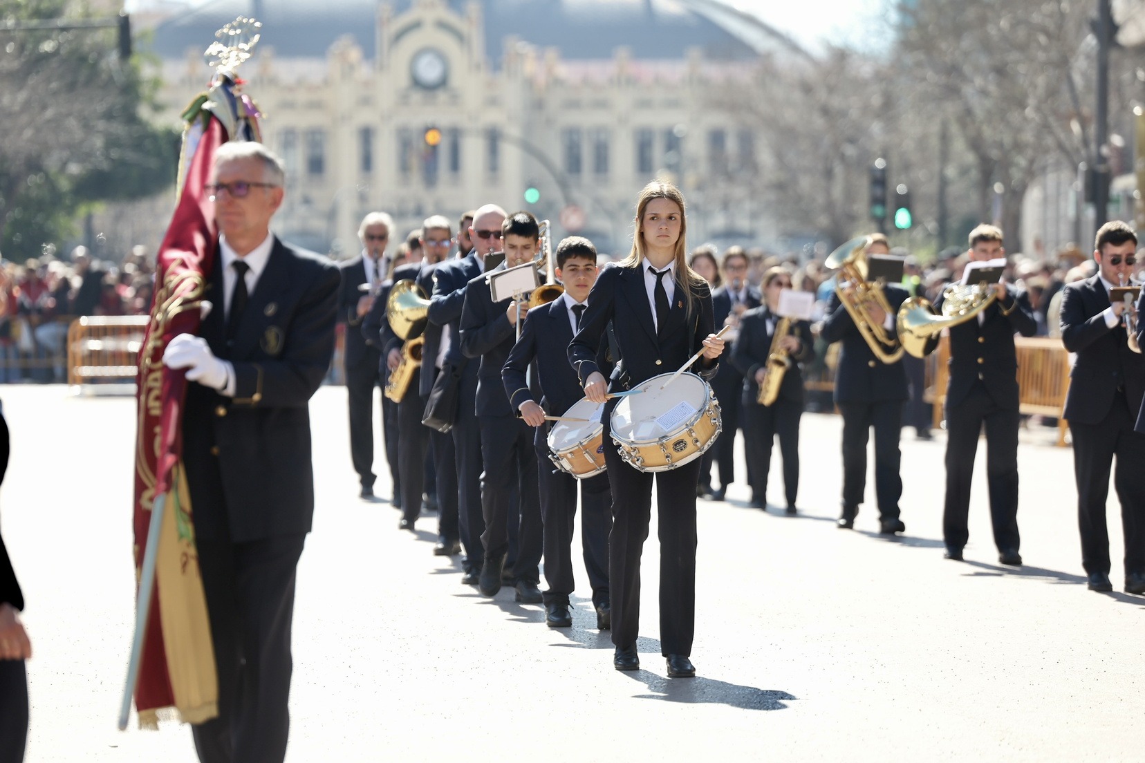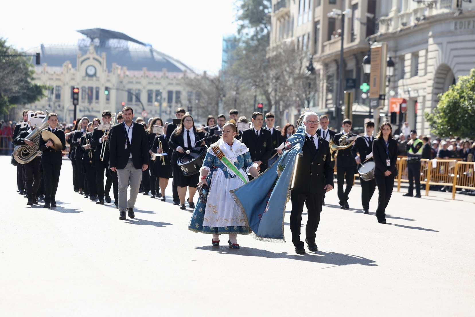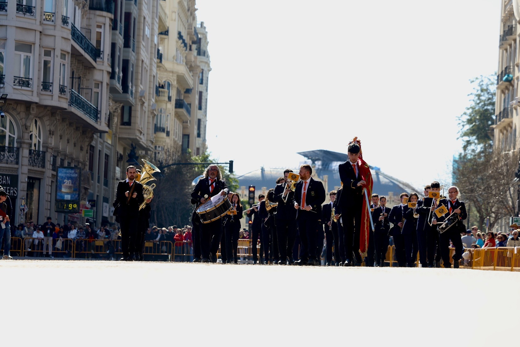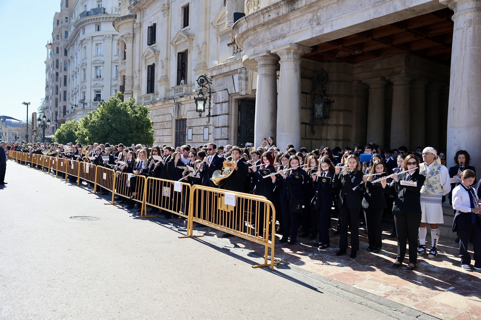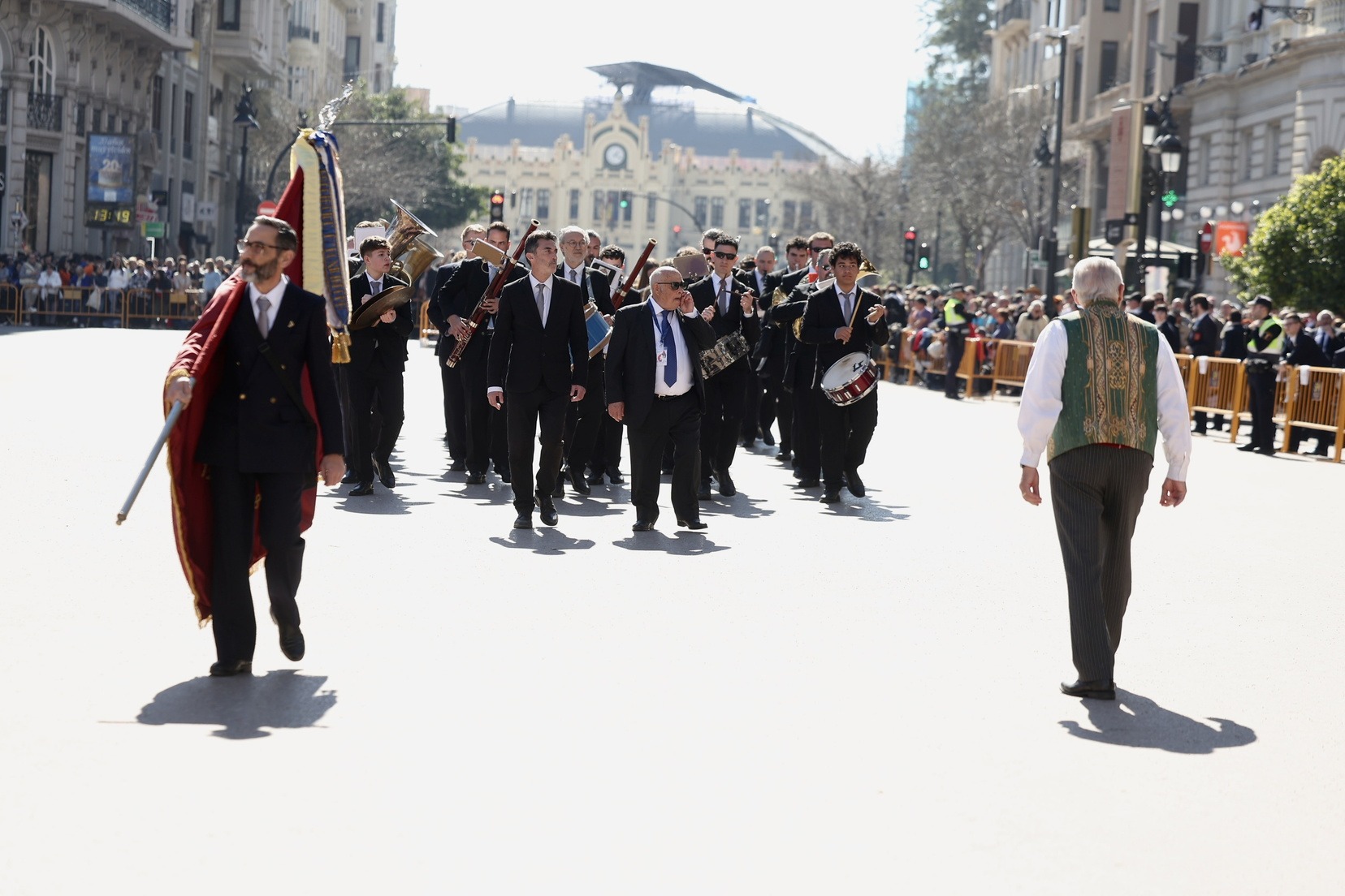 Un total de trece bandas se han dado cita en la Plaza Tetuán para iniciar el recorrido que ha finalizado en la Plaza del Ayuntamiento donde las Falleras Mayores de Valencia, Carmen Prades y Marta Mercader, junto a las componentes de sus Corte de Honor, el presidente de Junta Central Fallera, Santiago Ballester y la vicepresidenta del área, María Fernández, han recibido a todos los músicos participantes.