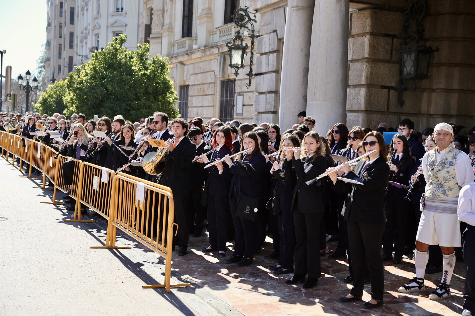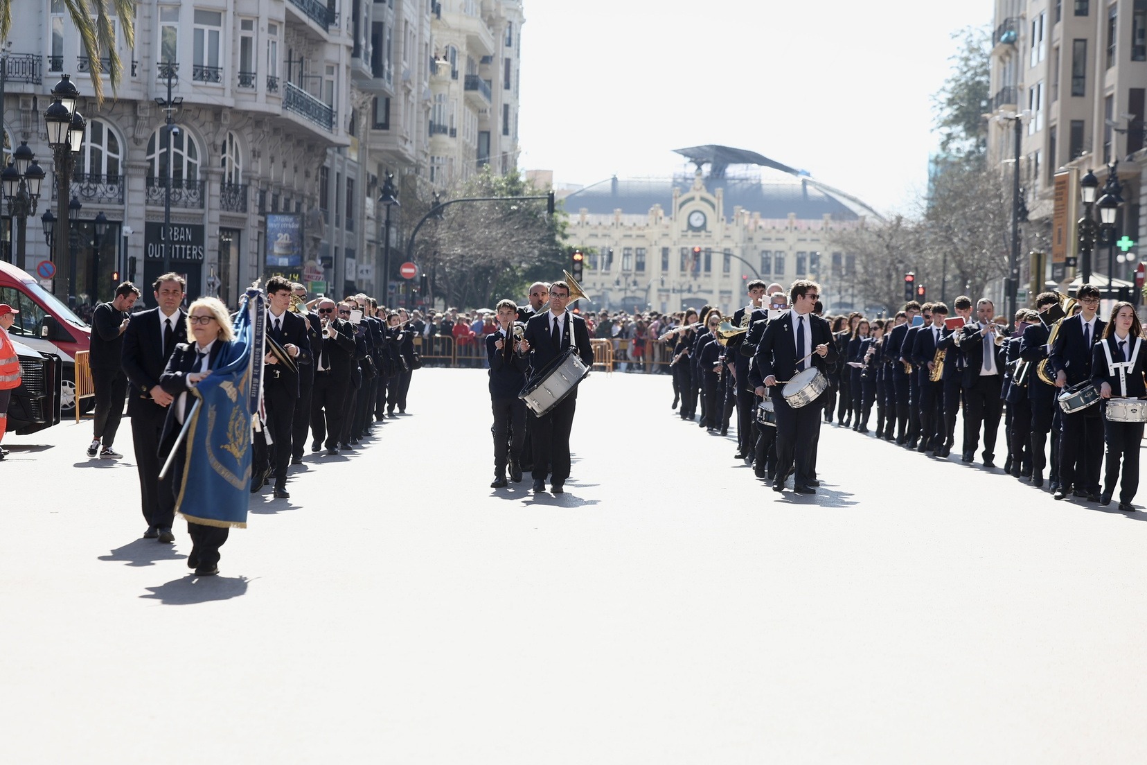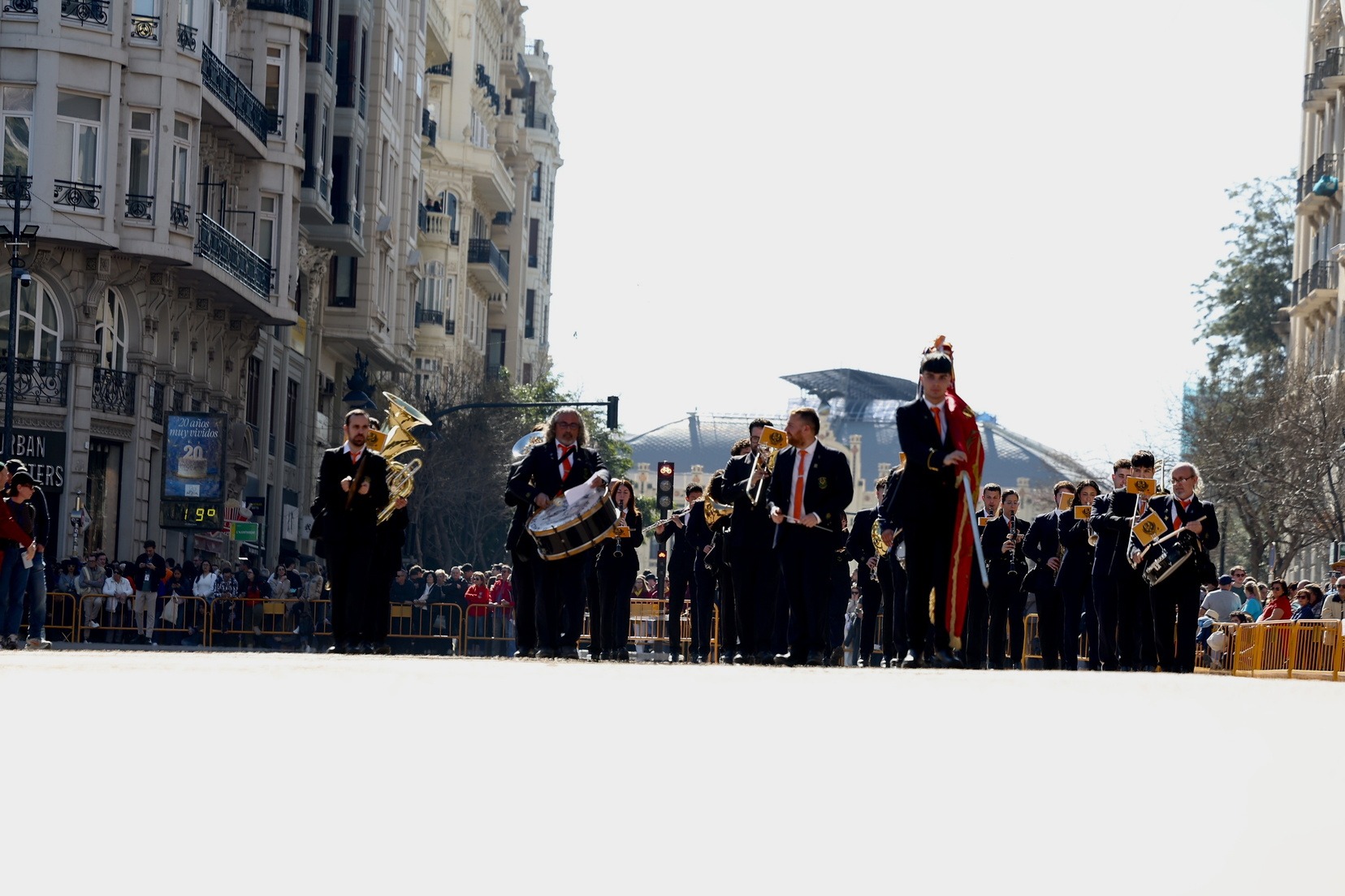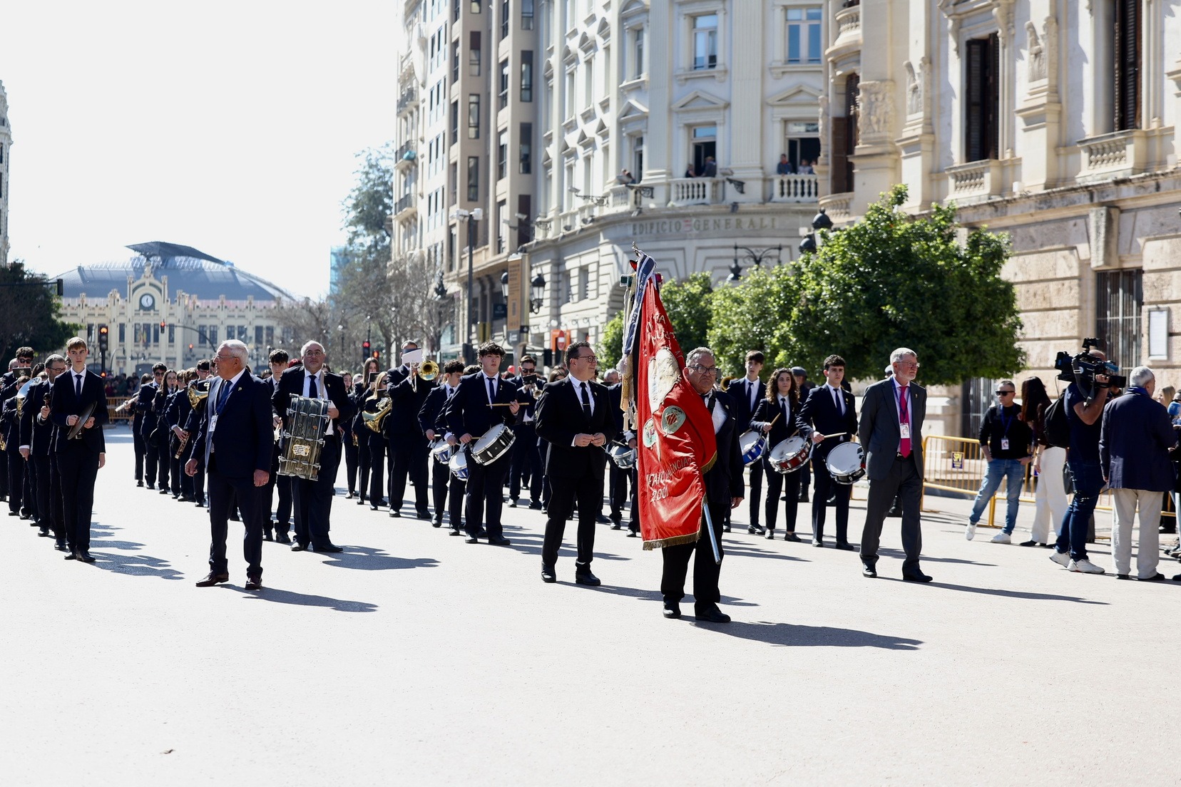 Un total de trece bandas se han dado cita en la Plaza Tetuán para iniciar el recorrido que ha finalizado en la Plaza del Ayuntamiento donde las Falleras Mayores de Valencia, Carmen Prades y Marta Mercader, junto a las componentes de sus Corte de Honor, el presidente de Junta Central Fallera, Santiago Ballester y la vicepresidenta del área, María Fernández, han recibido a todos los músicos participantes.