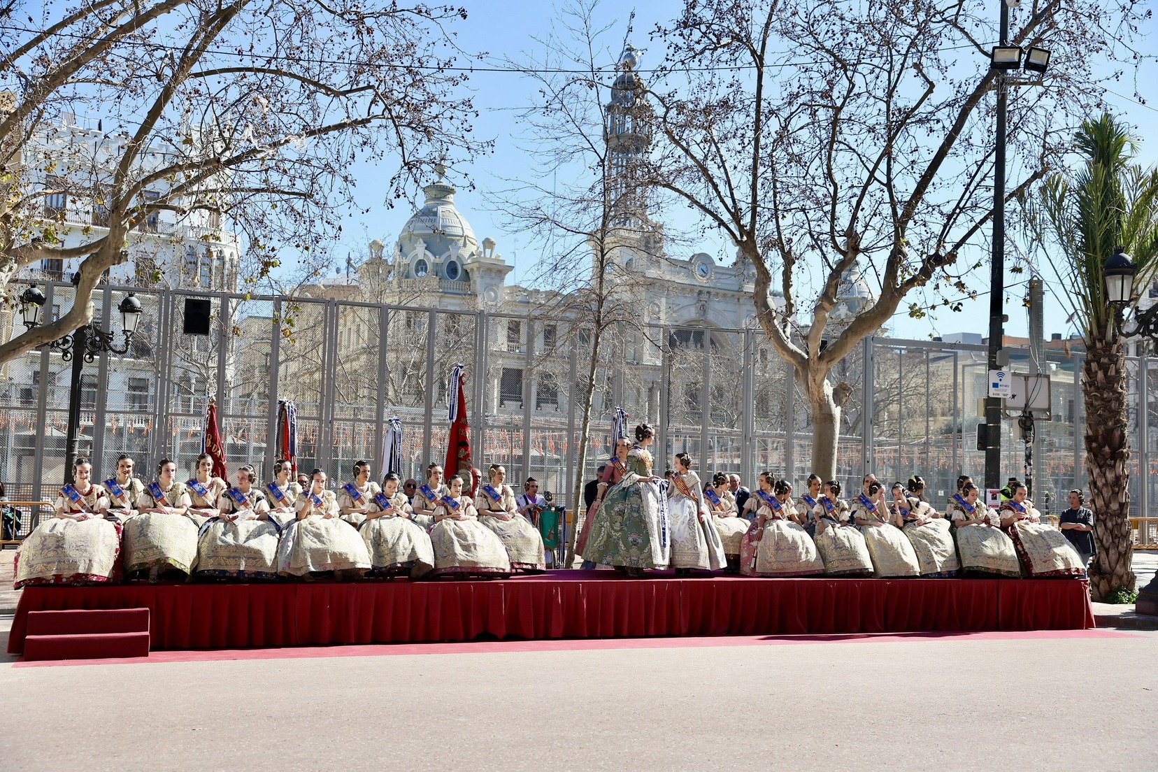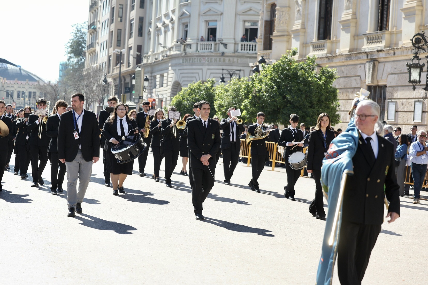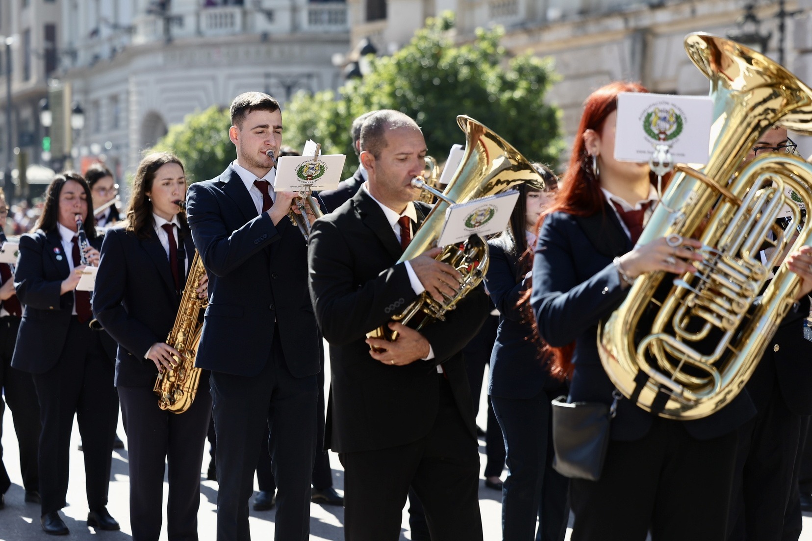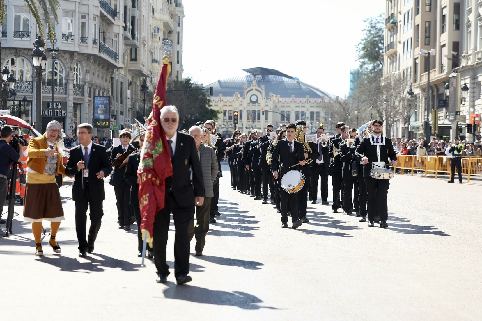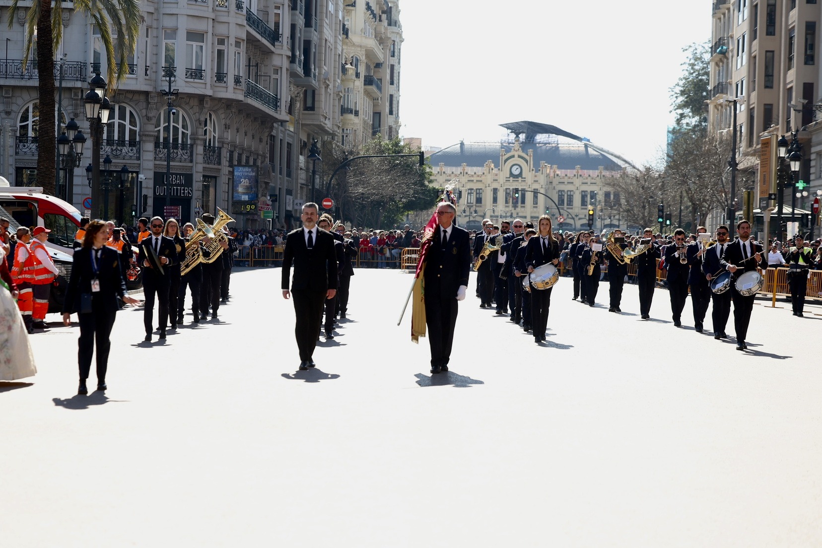 Un total de trece bandas se han dado cita en la Plaza Tetuán para iniciar el recorrido que ha finalizado en la Plaza del Ayuntamiento donde las Falleras Mayores de Valencia, Carmen Prades y Marta Mercader, junto a las componentes de sus Corte de Honor, el presidente de Junta Central Fallera, Santiago Ballester y la vicepresidenta del área, María Fernández, han recibido a todos los músicos participantes.