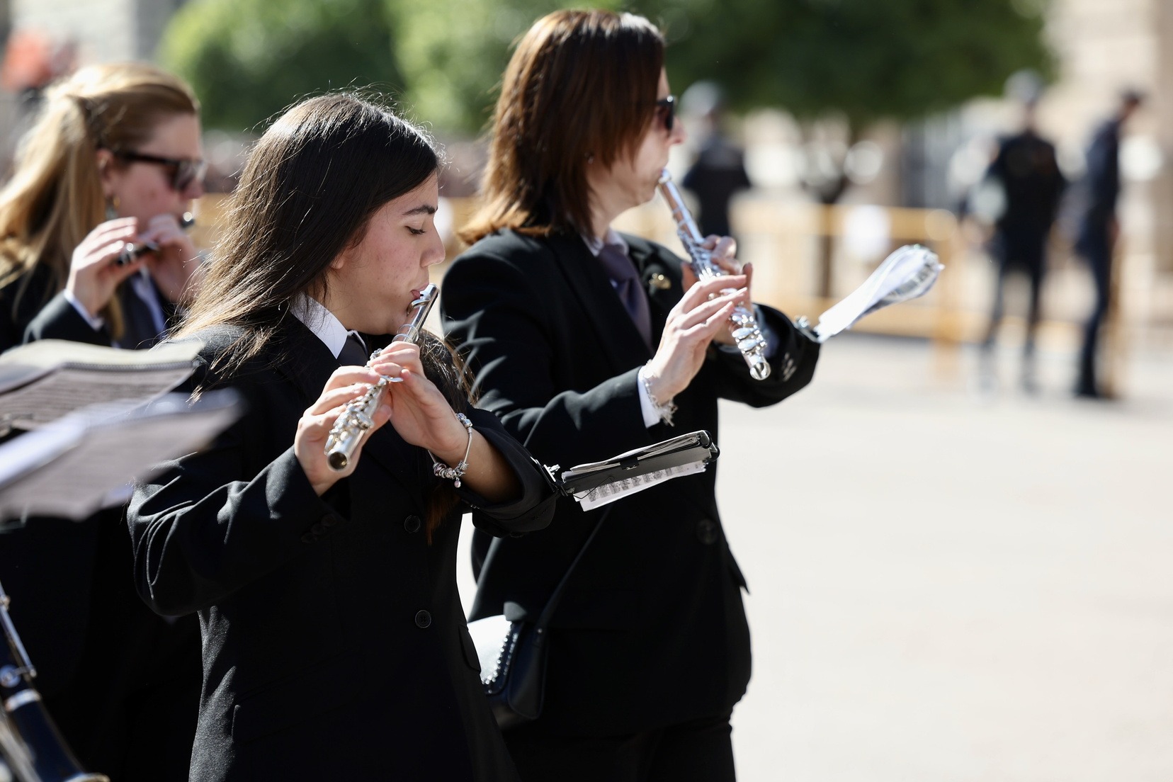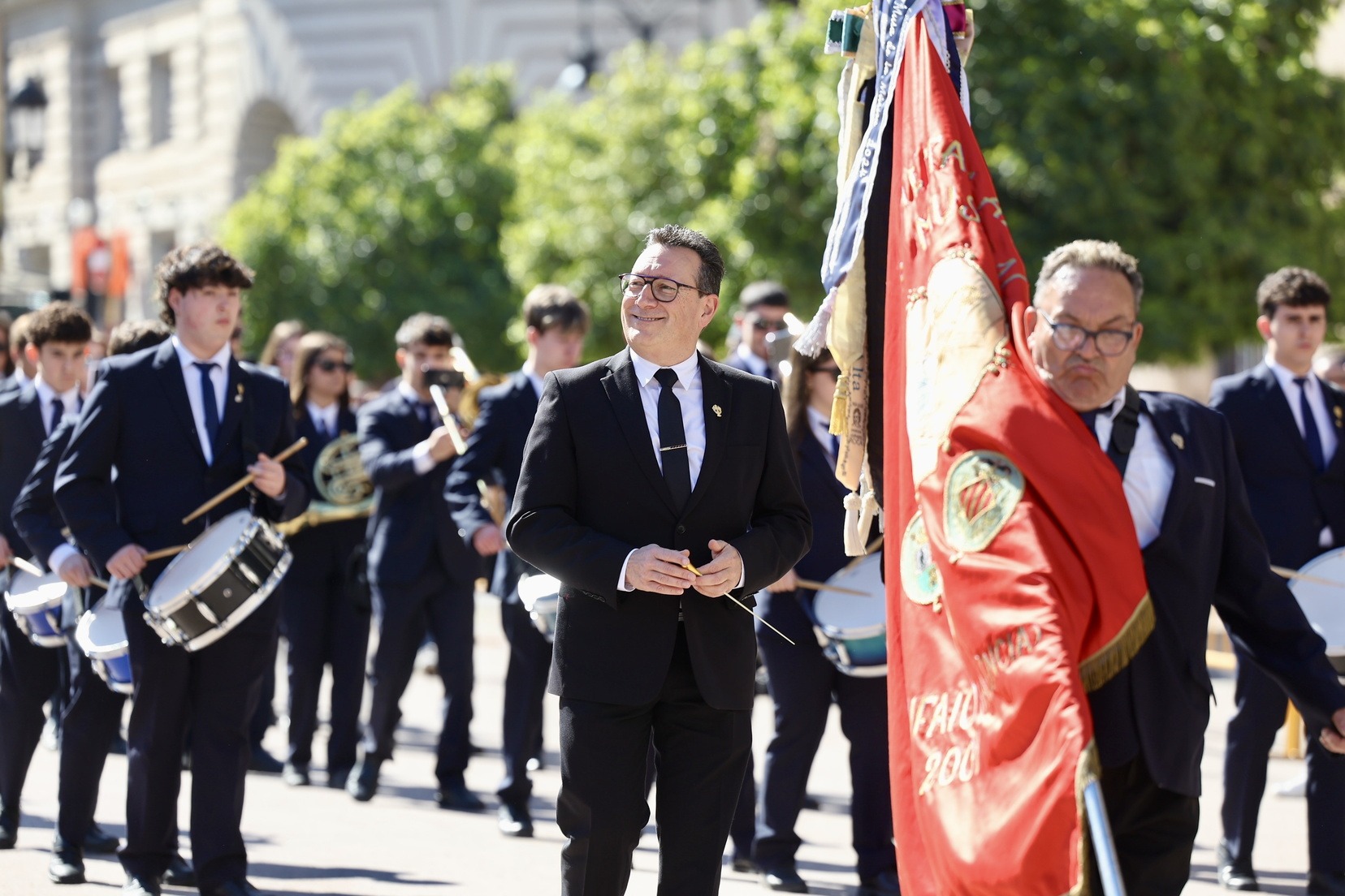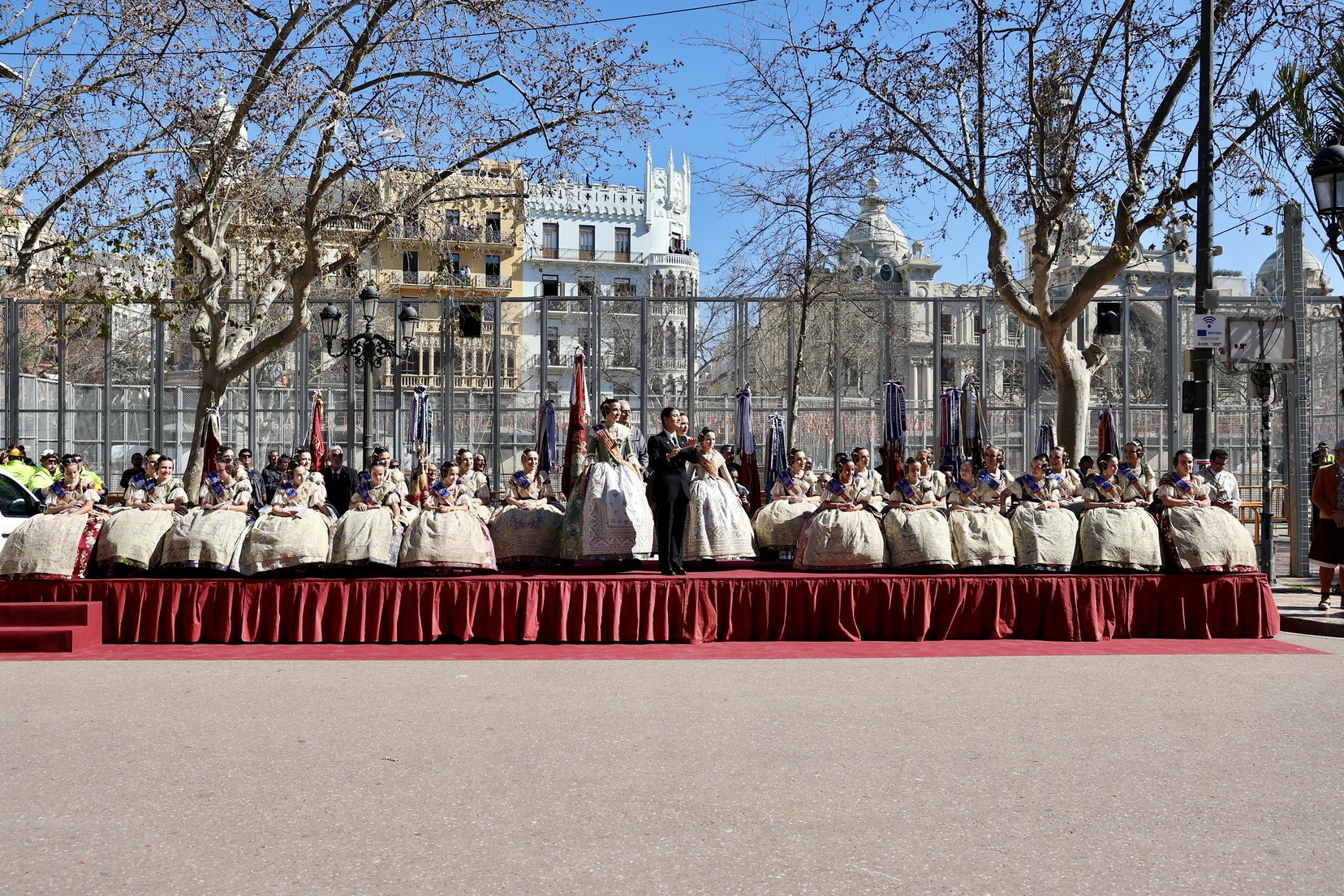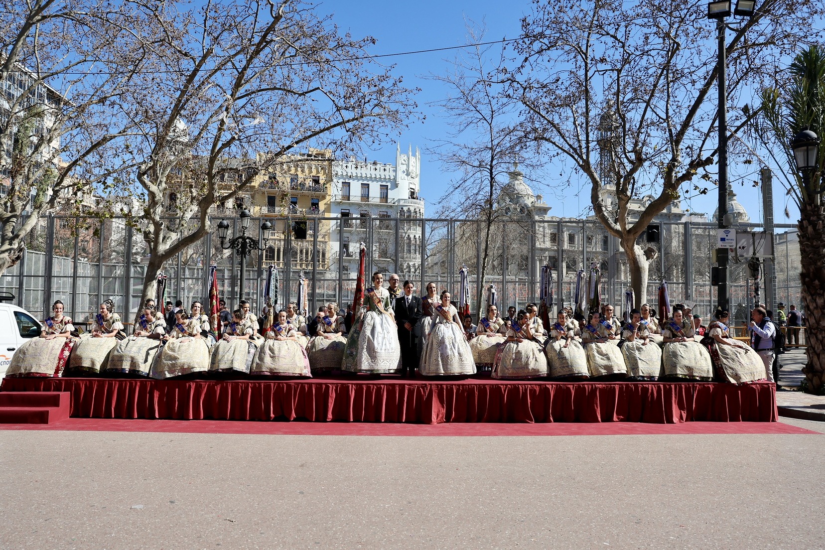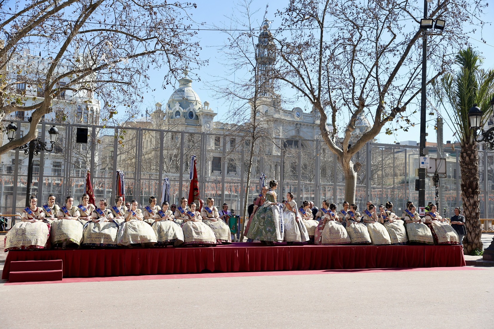 Un total de trece bandas se han dado cita en la Plaza Tetuán para iniciar el recorrido que ha finalizado en la Plaza del Ayuntamiento donde las Falleras Mayores de Valencia, Carmen Prades y Marta Mercader, junto a las componentes de sus Corte de Honor, el presidente de Junta Central Fallera, Santiago Ballester y la vicepresidenta del área, María Fernández, han recibido a todos los músicos participantes.