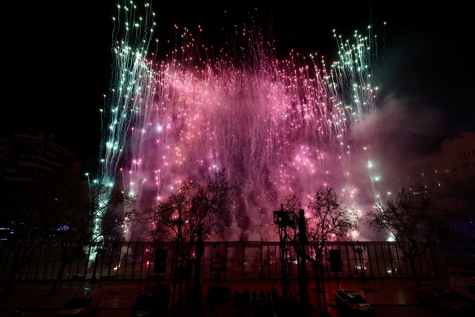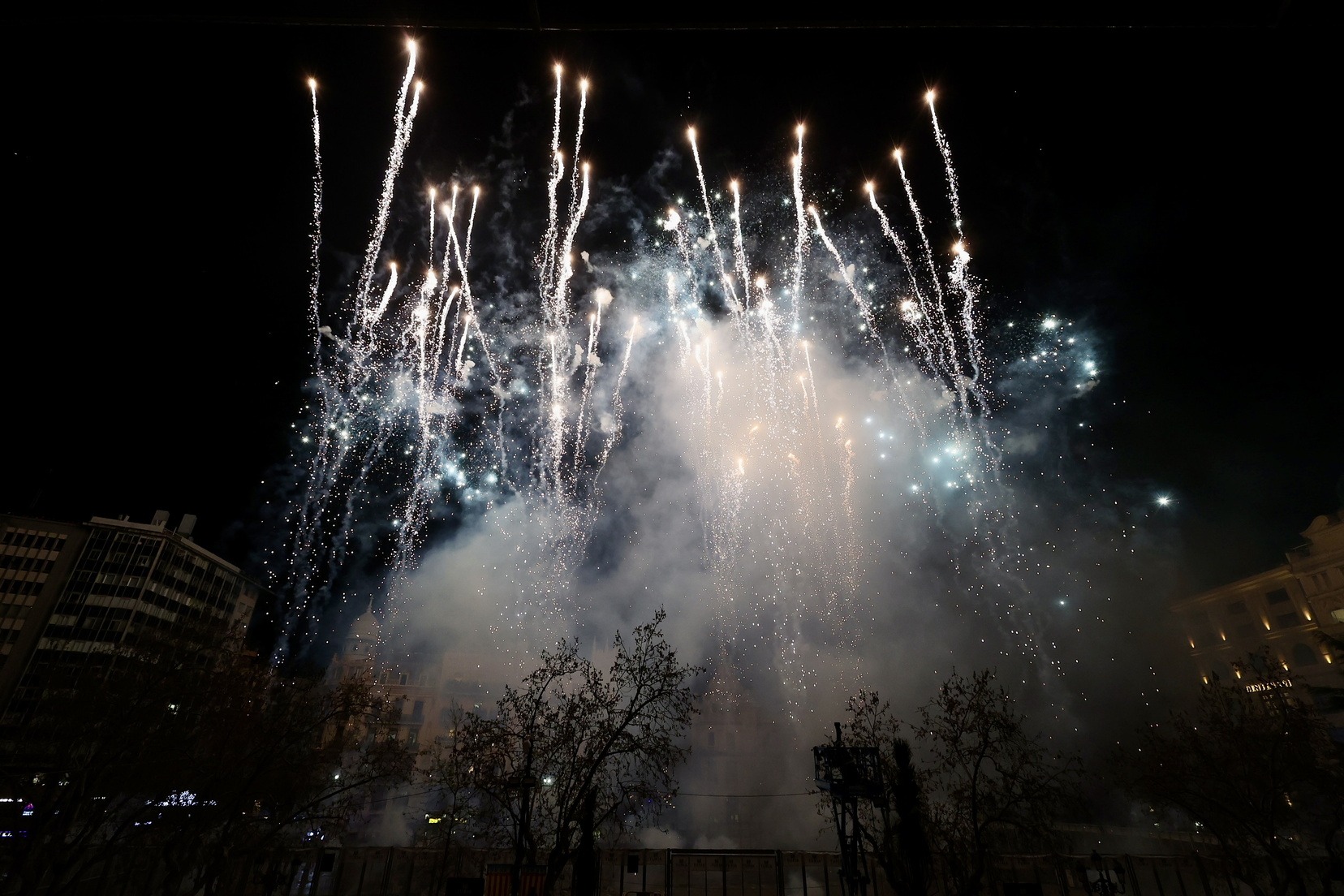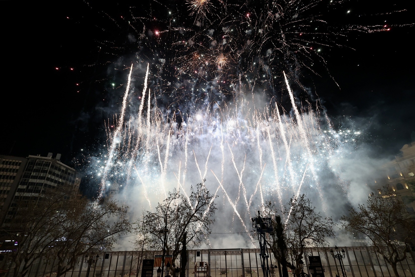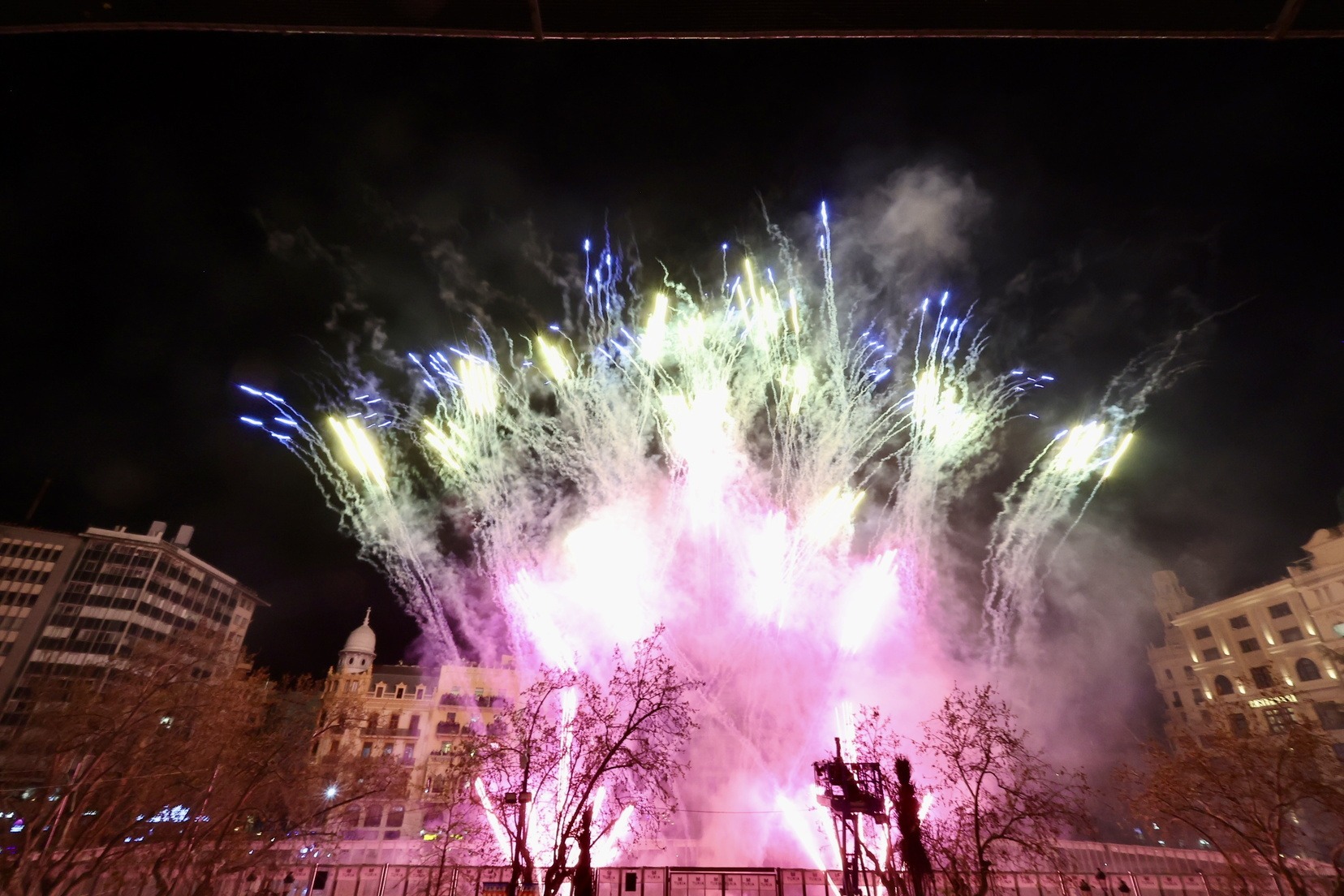 Cada una de las casi 400 comisiones que componen el censo fallero, han disparado, a la vez, un pequeño castillo de fuegos artificiales que ha llenado de luz, color y pólvora cada una de las demarcaciones de las fallas.