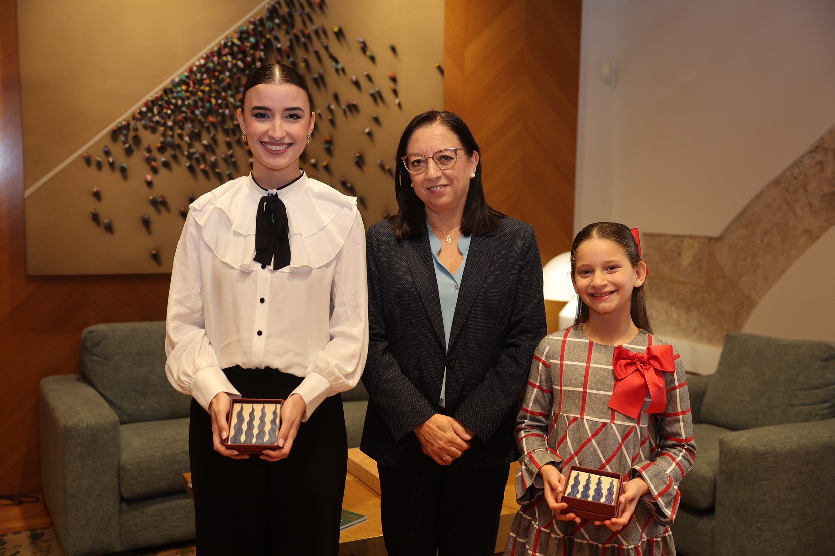 Las Falleras Mayores de Valencia, Carmen Prades Gil y Marta Mercader Roig, han visitado la sede de las Cortes Valencianas, donde han sido recibidas por su presidenta, Llanos Massó.