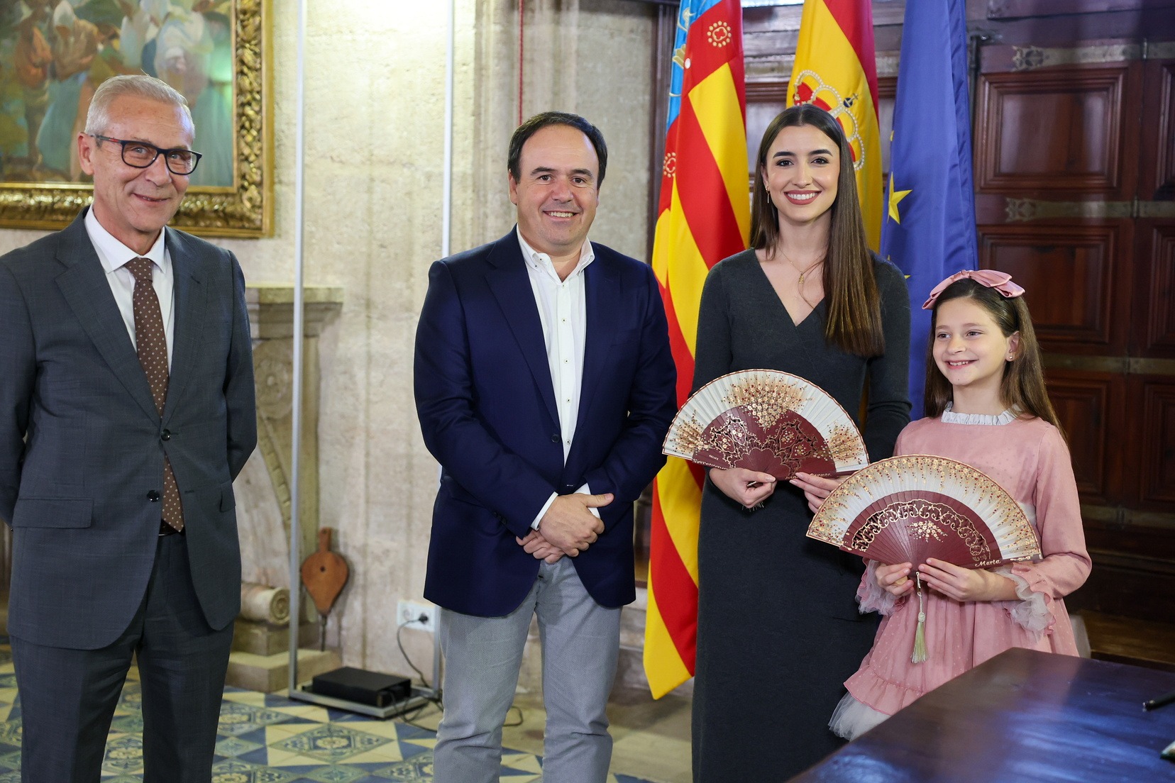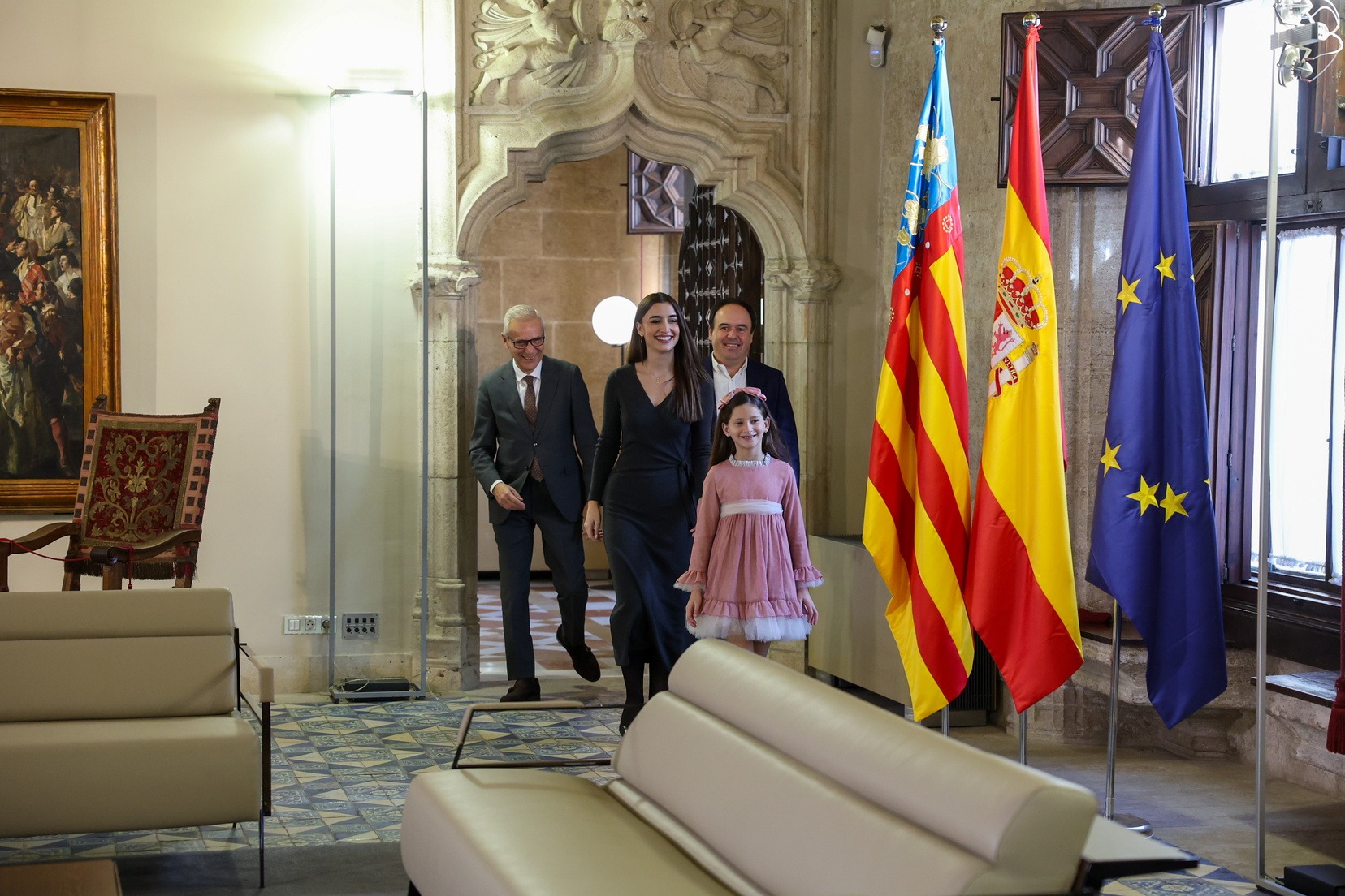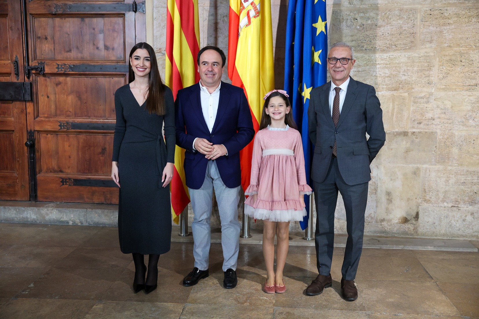 El Presidente de la Generalitat, Juan Francisco Pérez Llorca, ha recibido en el Palau de la Generalitat a las Falleras Mayores de Valencia y al presidente de JCF y concejal de Fallas, Santiago Ballester.