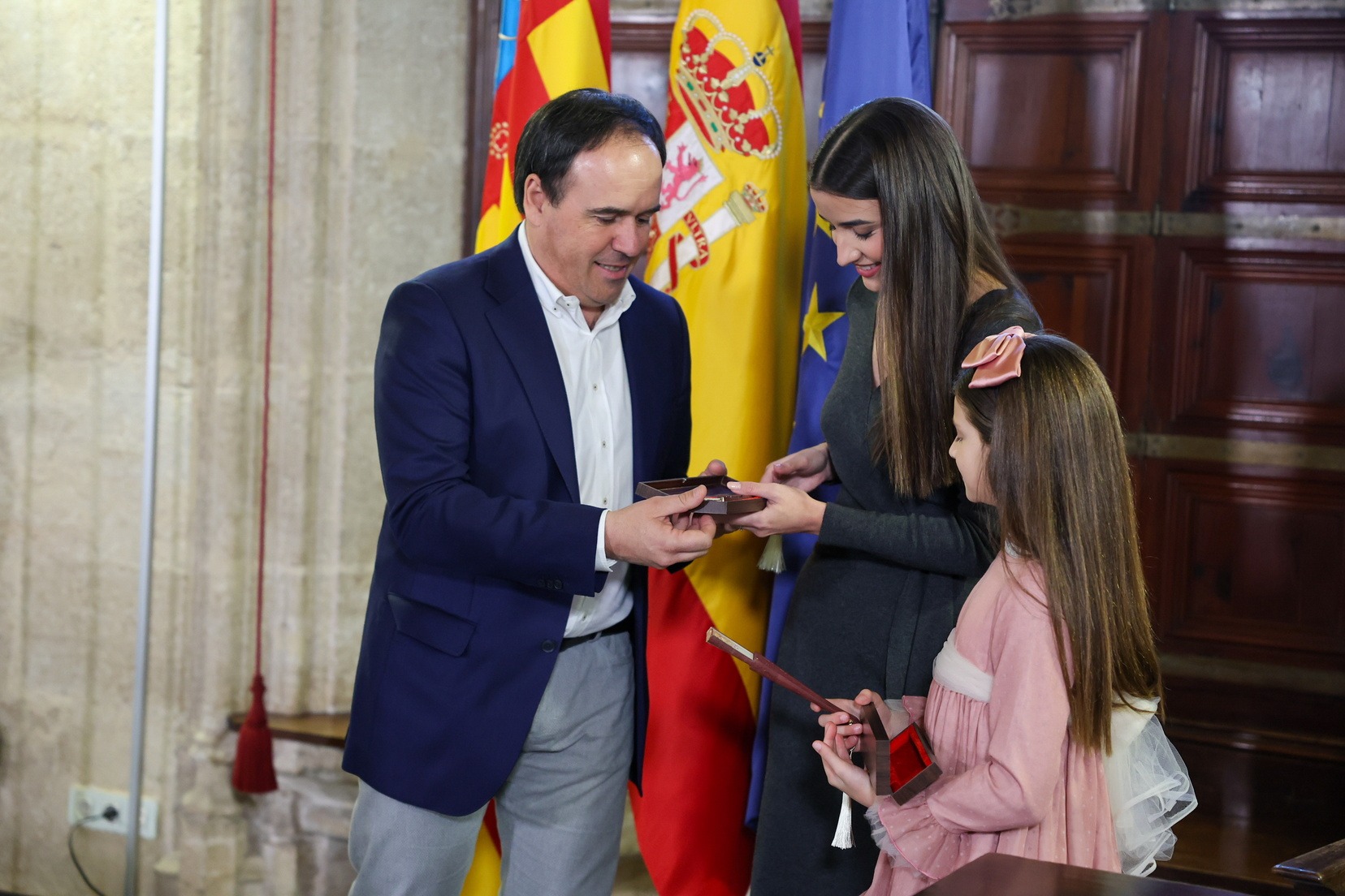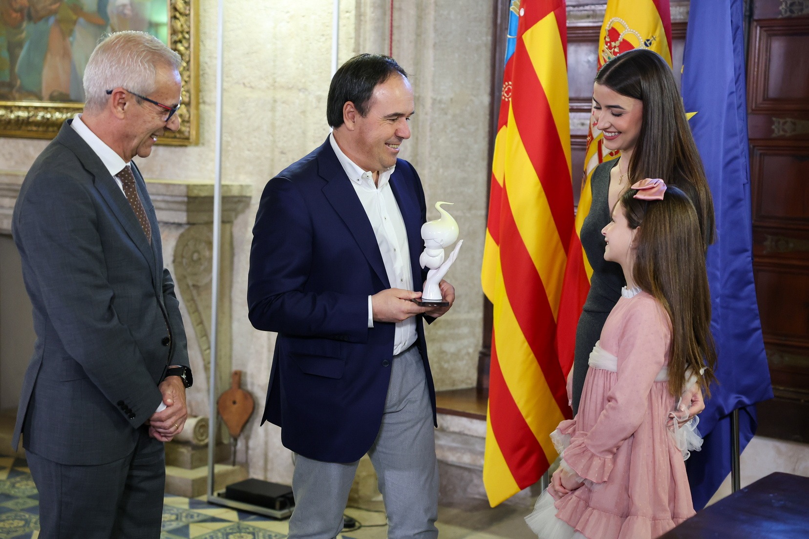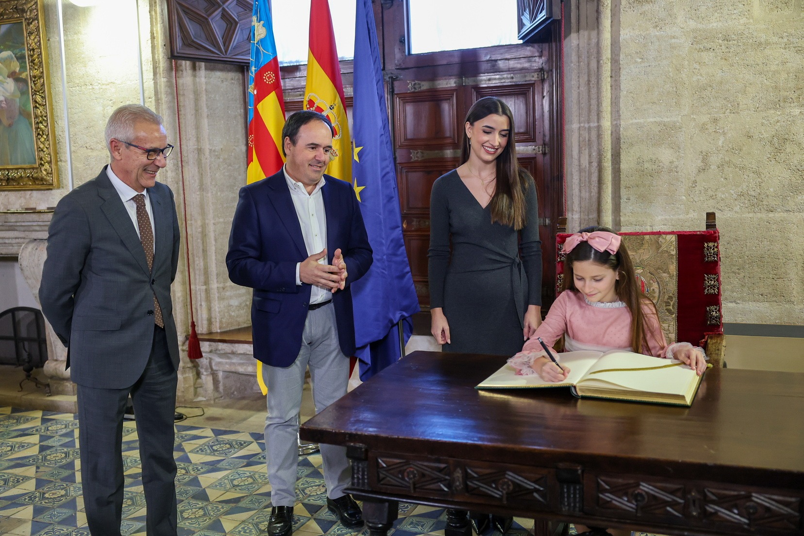 El Presidente de la Generalitat, Juan Francisco Pérez Llorca, ha recibido en el Palau de la Generalitat a las Falleras Mayores de Valencia y al presidente de JCF y concejal de Fallas, Santiago Ballester.