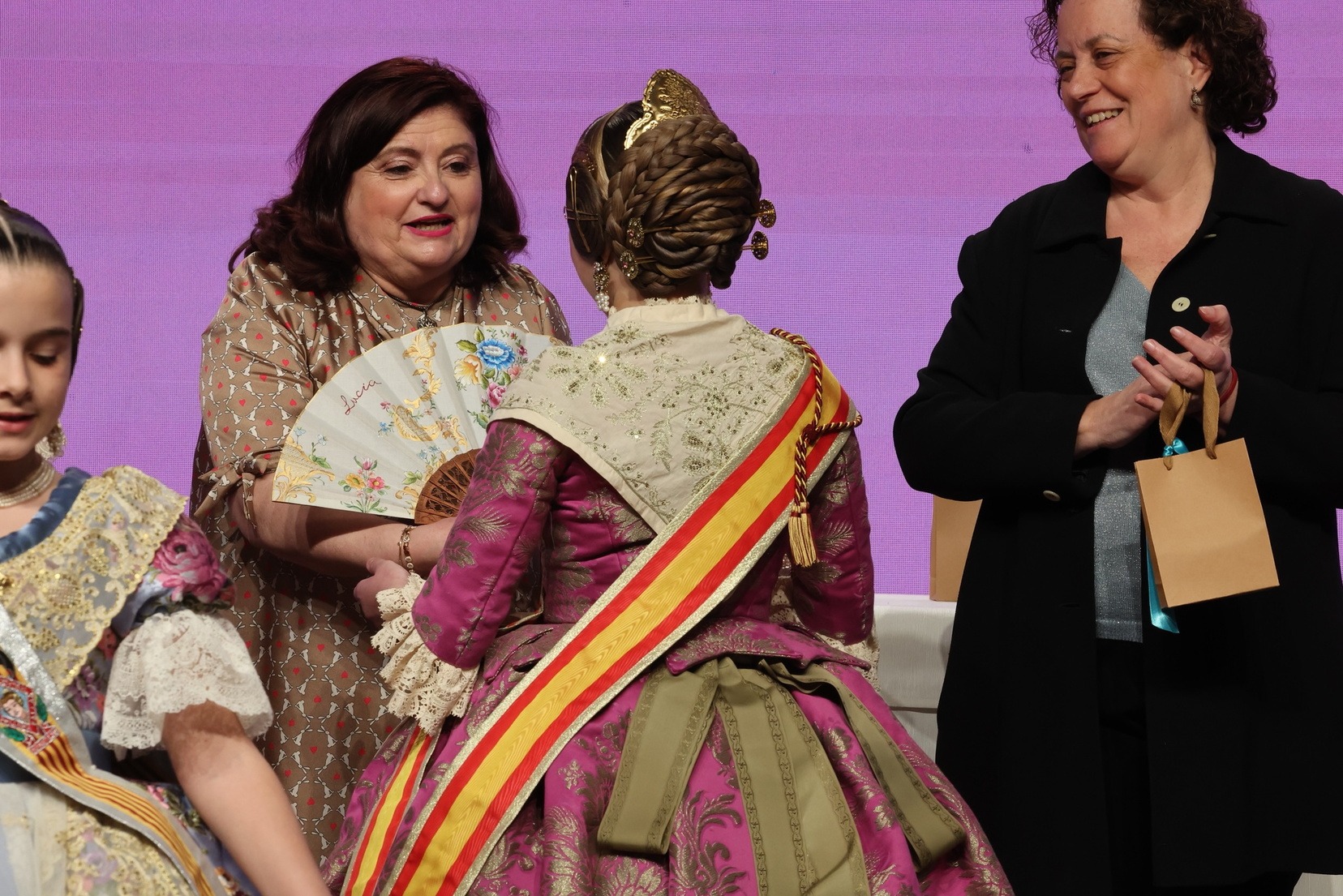 En la indumentaria oficial de las Falleras Mayores de Valencia y sus Cortes de Honor no falta ningún detalle. A la entrega de cancanes, aderezos, peinetas, telas y otros accesorios realizada en los meses anteriores, se suman ahora los abanicos y los cuelga abanicos, elaborados por la firma “Princesas con Abanico” y Rosa Tomás, respectivamente.
