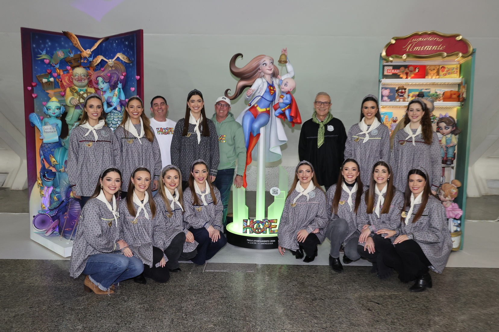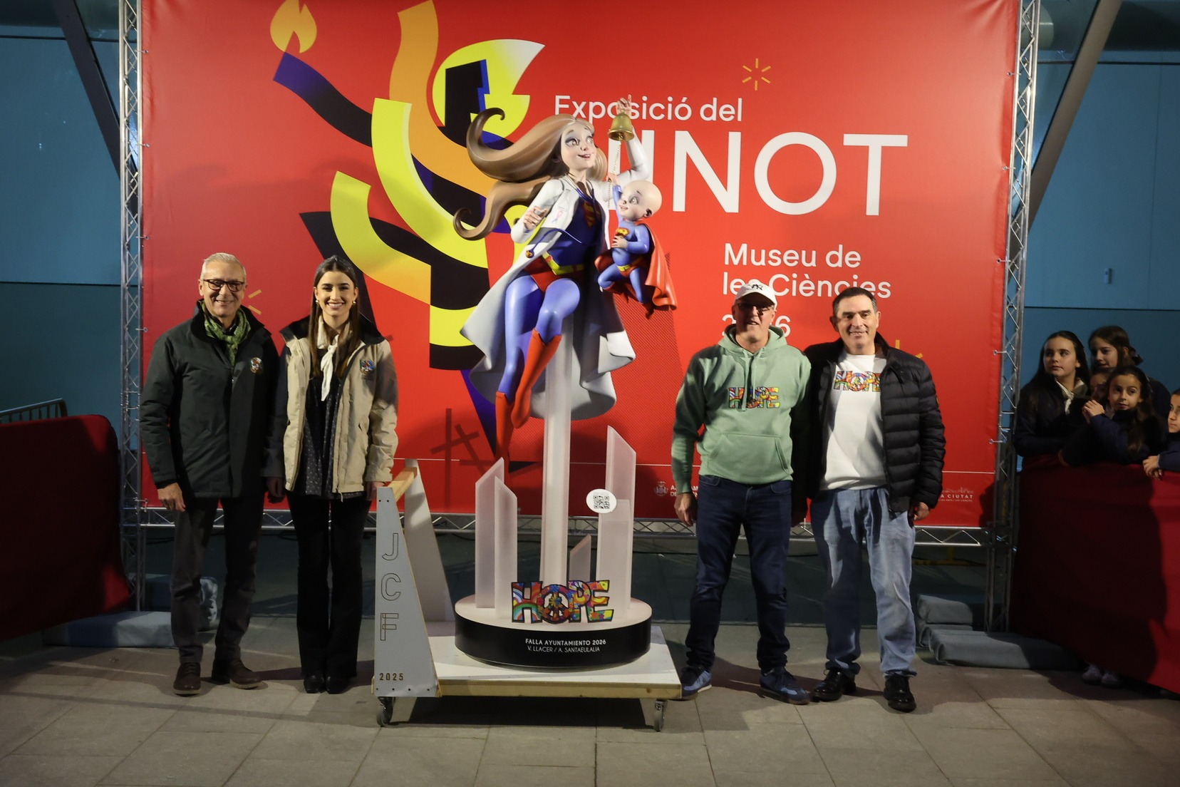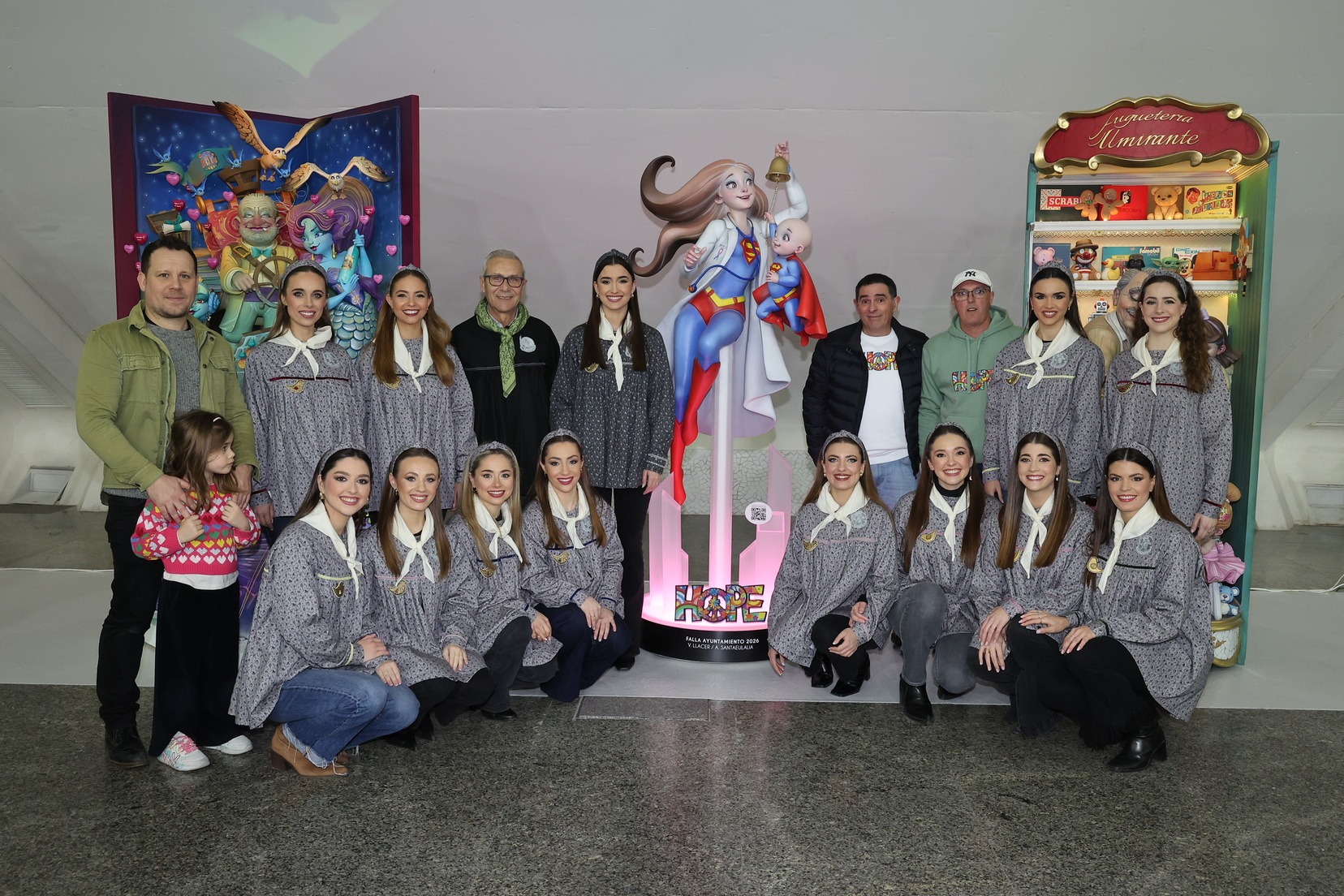 Por su parte, el ninot de la falla municipal grande —bajo el mismo lema de la falla, “Hope”— ha sido entregado por parte de los artistas Alejandro Santaeulalia y Vicente Llácer, que firman esta figura centrada en la lucha contra el cáncer infantil, representada por una profesional sanitaria con atuendo de superhéroe junto a un niño que simboliza la esperanza y la superación. Una pieza que ha cautivado a Carmen Prades y su Corte de Honor.