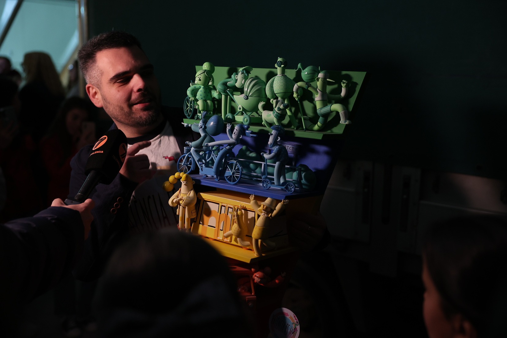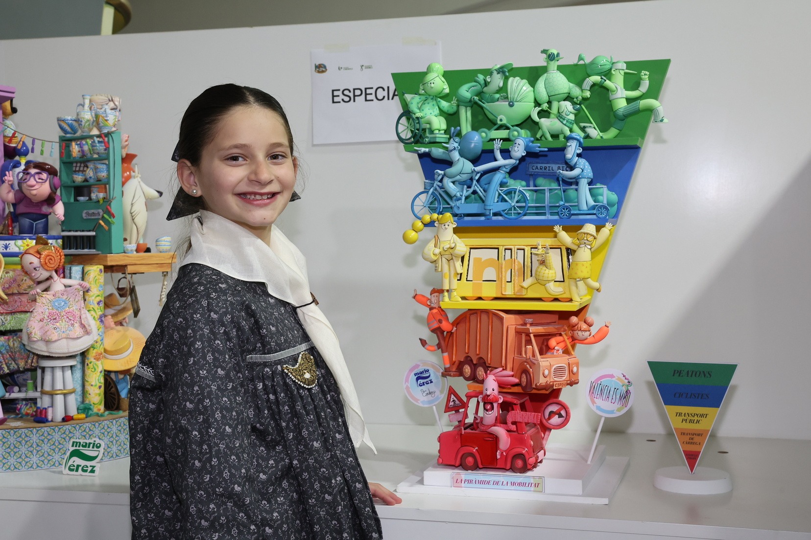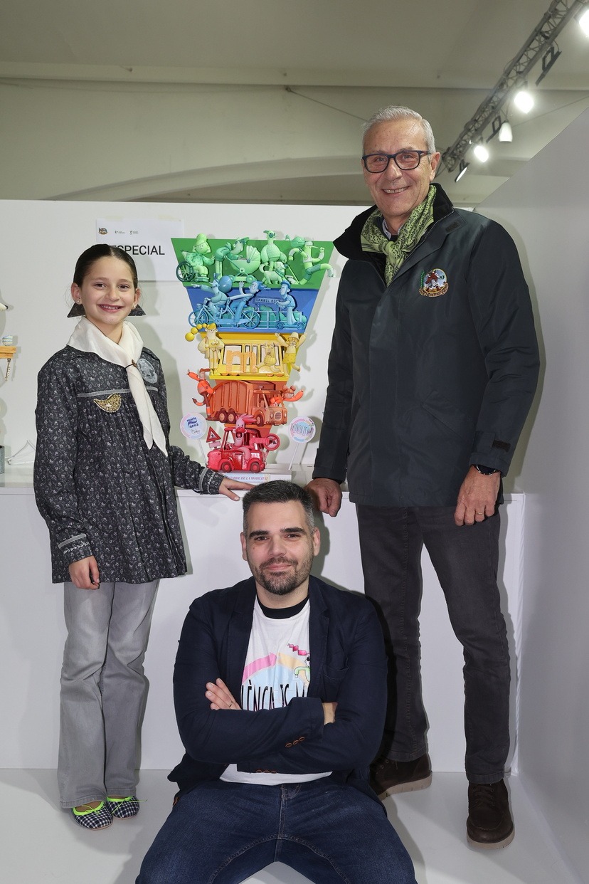 El ninot de la falla municipal infantil, con el lema “La piràmide de la mobilitat’ y que pertenece a la falla ‘València es mou”, ha llegado al recinto de manos de su artista fallero, Mario Pérez. Allí le esperaba Marta Mercader junto a su Corte de Honor para descubrir esta pieza que plantea una visión didáctica del transporte urbano y la movilidad de la ciudad.
