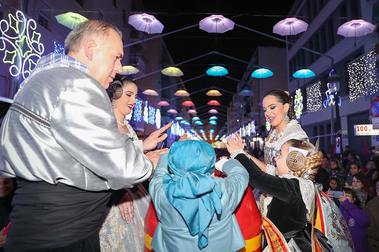 Marina, junto a la Fallera Mayor de la comisión, Elia Ramos, fueron las encargadas de iniciar el espectáculo al son del timbal. Este año la comisión ha intentado buscar el ingenio y gracia en la iluminación combinados con las nuevas tecnologías.