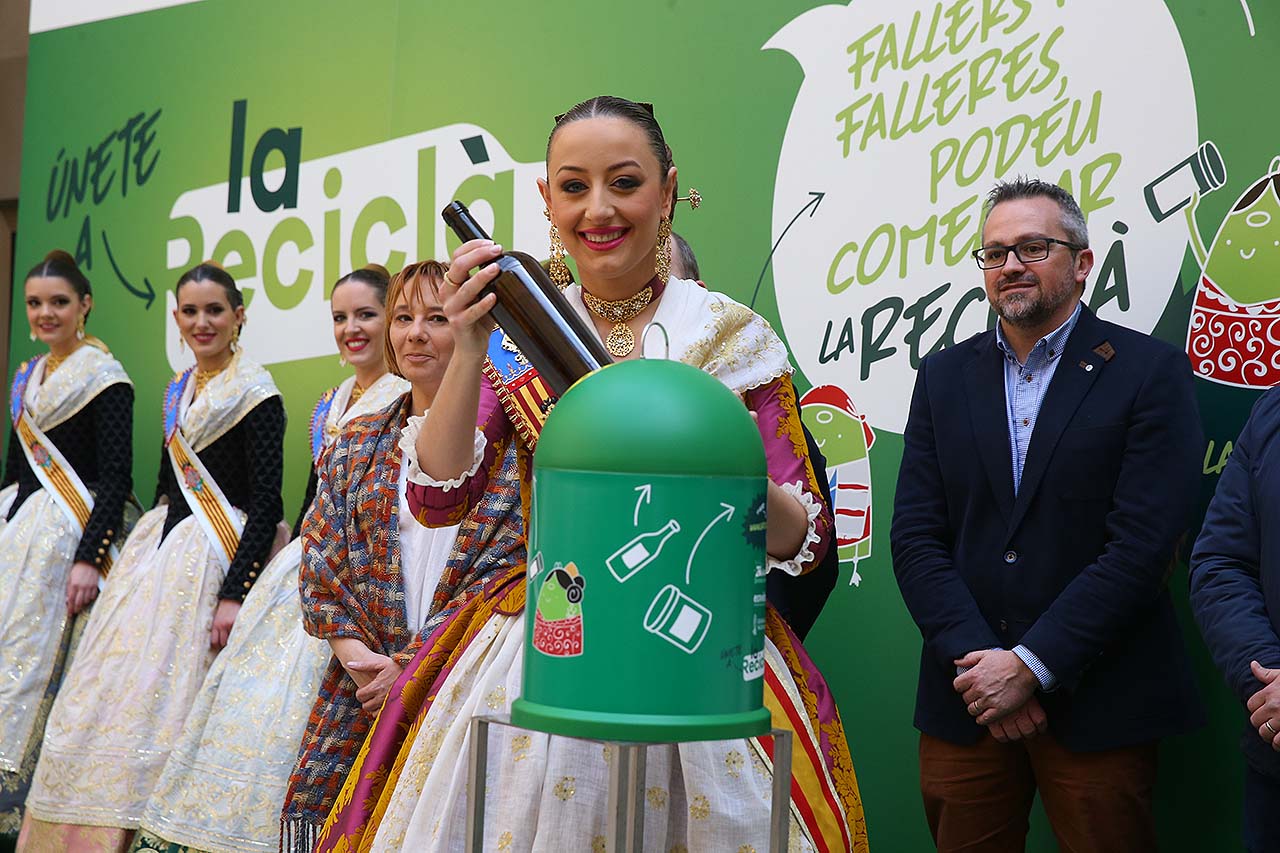 El pasado sábado 3 de marzo tuvo lugar la presentación de la campaña “La Reciclà” en el Palacio de la Exposición. Esta iniciativa ha sido puesta en marcha por Ecovicrio, entidad sin ánimo de lucro que se encarga de gestionar el reciclaje de todos los residuos de envases de vidrio en España. Con ella, se reta a las comisiones falleras a reciclar más de 100 toneladas durante la semana de Fallas. A esta presentación acudió la Fallera Mayor de València, Rocío Gil, junto a su Corte de Honor. Además, también se contó con la presencia del Director General de Cambio Climático y Calidad Ambiental de la Generalitat Valenciana, Joan Piquer; de la regidora de Medioambiente del Ayuntamiento de València, Pilar Soriano; del Concejal de Fiestas del Ayuntamiento de Mislata, Antonio Arenas, y del gerente de zona de Ecovidrio, Roberto Fuentes.