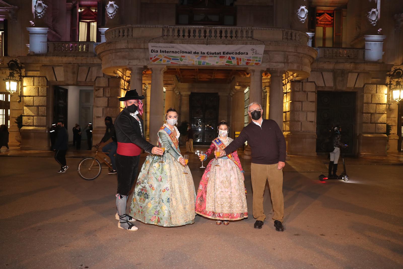 Una hora després, l’alcalde de València, Joan Ribó, les Falleres Majors de València i el president de Junta Central Fallera, Carlos Galiana, han realitzat un brindis a la plaça de l’Ajuntament, amb el qual han donat per inaugurada la celebració del IV aniversari del Patrimoni.