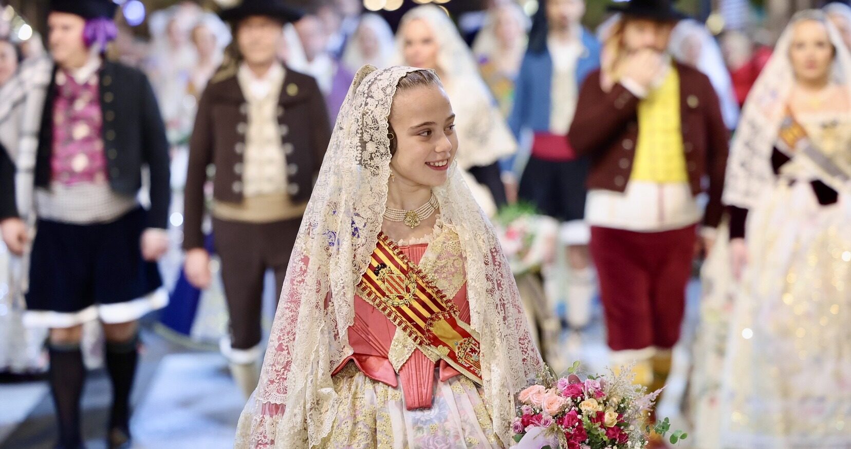 Amb la mirada posada en el cel i amb immensa emoció, la Fallera Major Infantil de València i la seua Cort d’Honor van desfilar ja de matinada pel carrer Sant Vicent per a iniciar la seua Ofrena més especial.