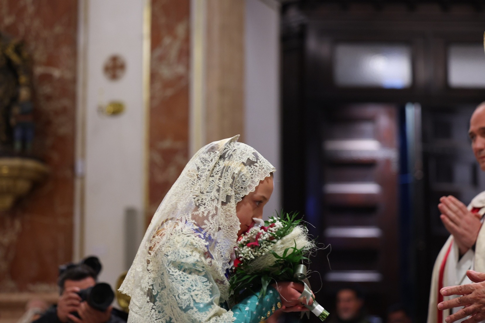 Cdentenars de persones les esperaven somrients per a aplaudir-les i les tretze xiquetes més afortunades d’este 2025 van poder portar-li flors i fer les seues peticions a la Mare de Déu dels Desemparats, que les esperava en la Plaça amb el mantell prou avançat en haver rebut milers de rams durant la jornada del 17 de març.