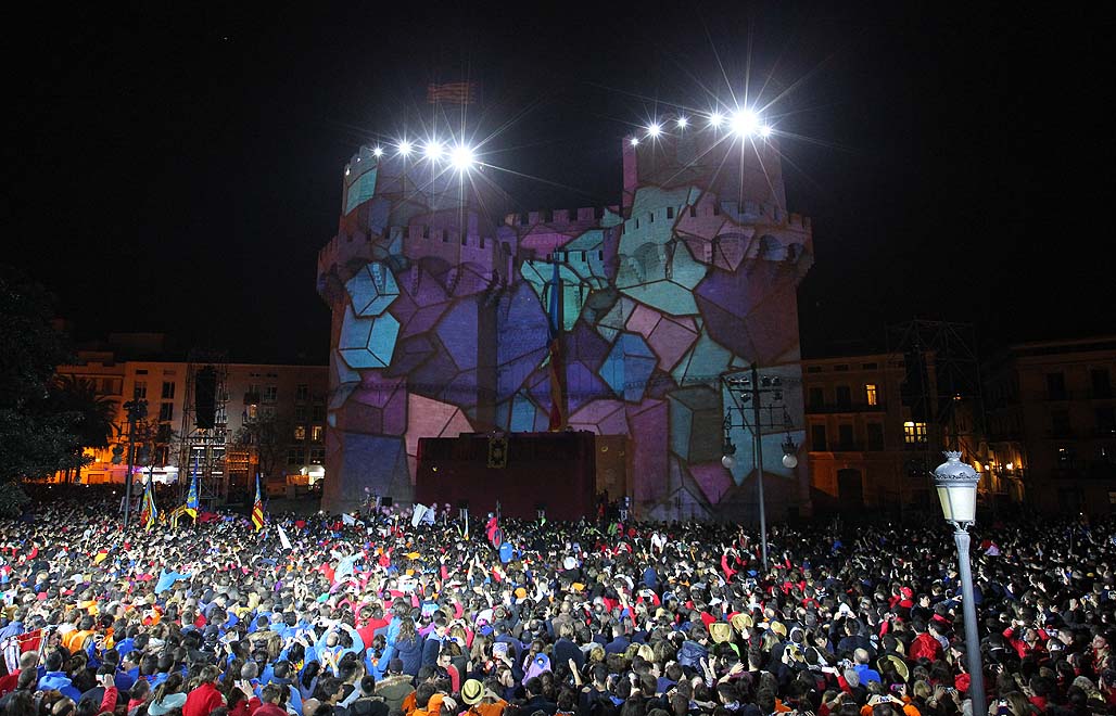 Enguany l’espectacle, dirigit per Manuel Coronat, s’ha dividit en tres parts amb un lema comú: la recuperació de l’origen de la festa de les Falles. El passat, present i futur s’han reflectit en cadascuna de les projeccions i paraules que els valencians han pogut gaudir des de l’altra part de les Torres. De l’ estoreta velleta, a la gran festa del Foc, combinant l’expressió del material i l’immaterial que s’uneixen, més que mai, per a donar força i sentit a la candidatura de les Falles com a Patrimoni Immaterial de la Humanitat de la UNESCO.