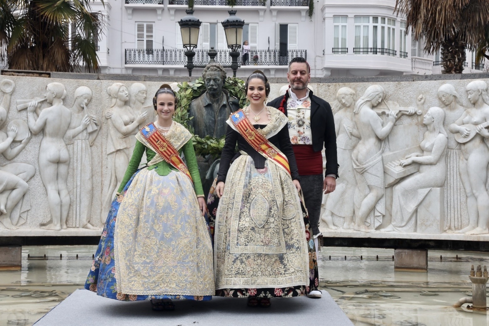 En primer lloc, en l’encreuament dels carrers Sagunt i Maximilià Thous, Carmen i Nerea, acompanyades pel president de Junta Central Fallera, Carlos Galiana, van depositar una corona de llorer com a homenatge al poeta que va crear la lletra de l’Himne Regional. Aquest homenatge compta tots els anys amb la col·laboració de la Falla Fra Pedro Vives – Bilbao – Maximilà Thous.