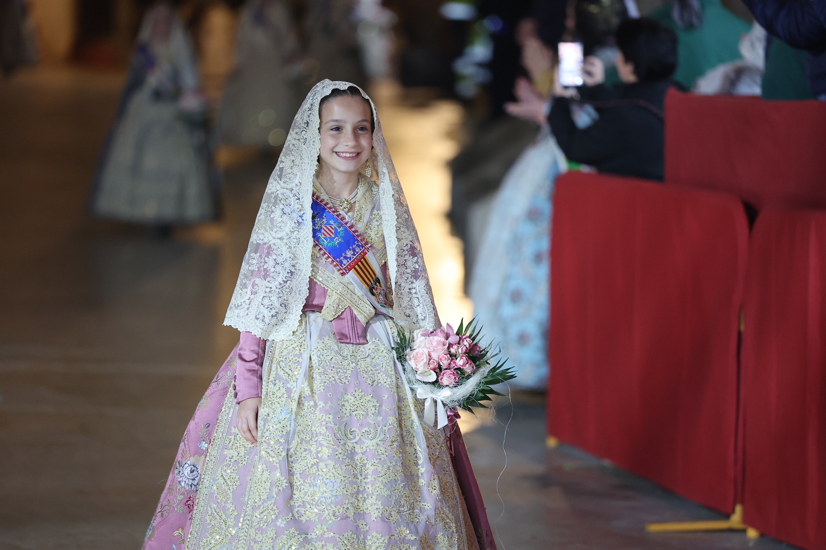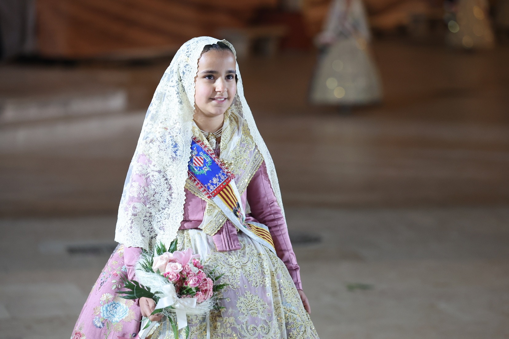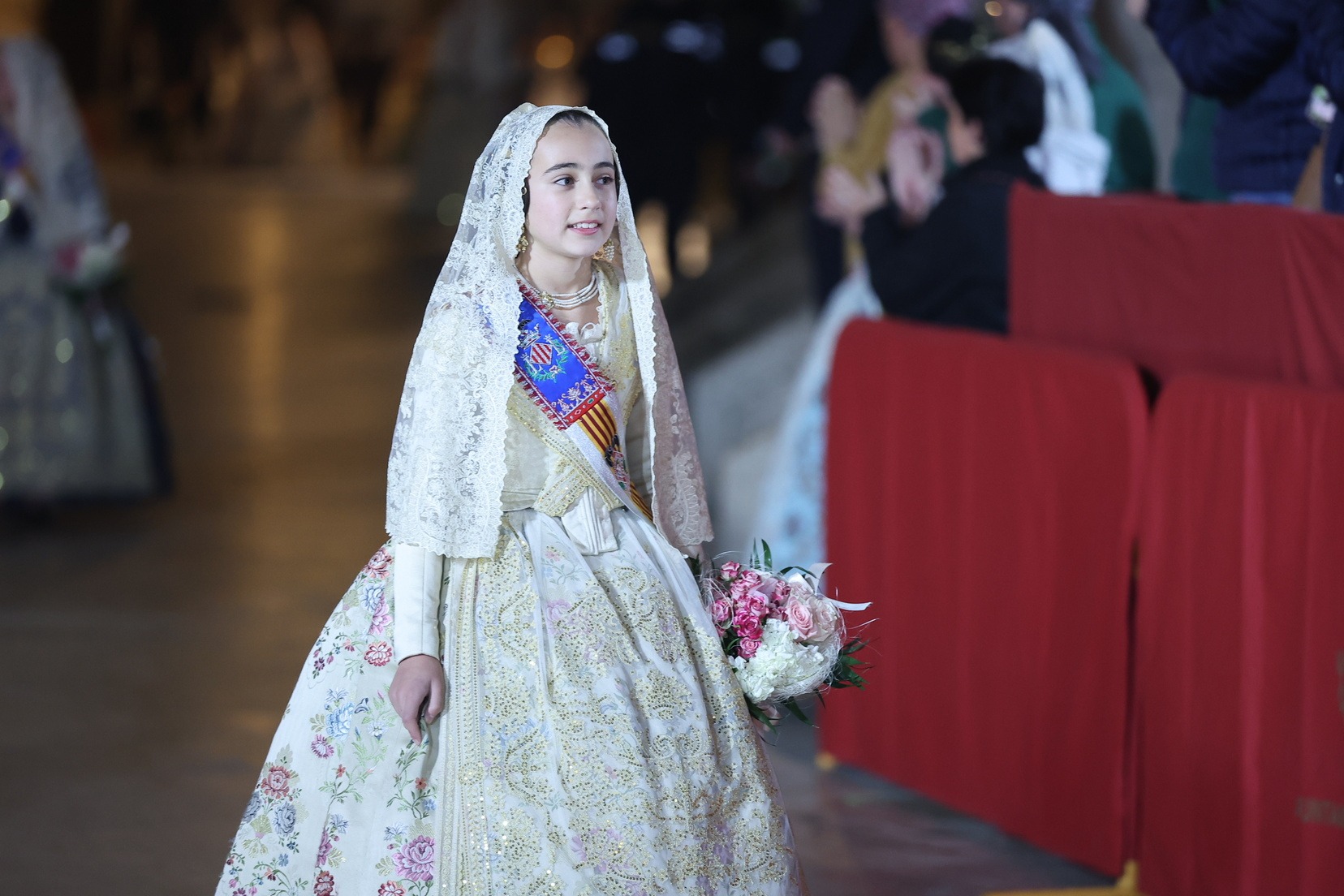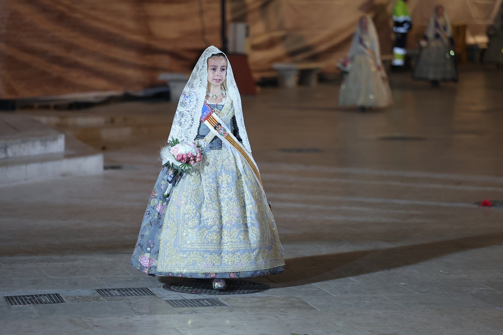 Desenes de persones les esperaven somrients per a aplaudir-les i les tretze xiquetes més afortunades d’este 2026 han pogut portar-li flors i fer les seues peticions a la Mare de Déu, que les esperava en la Plaça amb el mantell  prou avançat en haver rebut milers de rams durant la jornada del 17 de març.