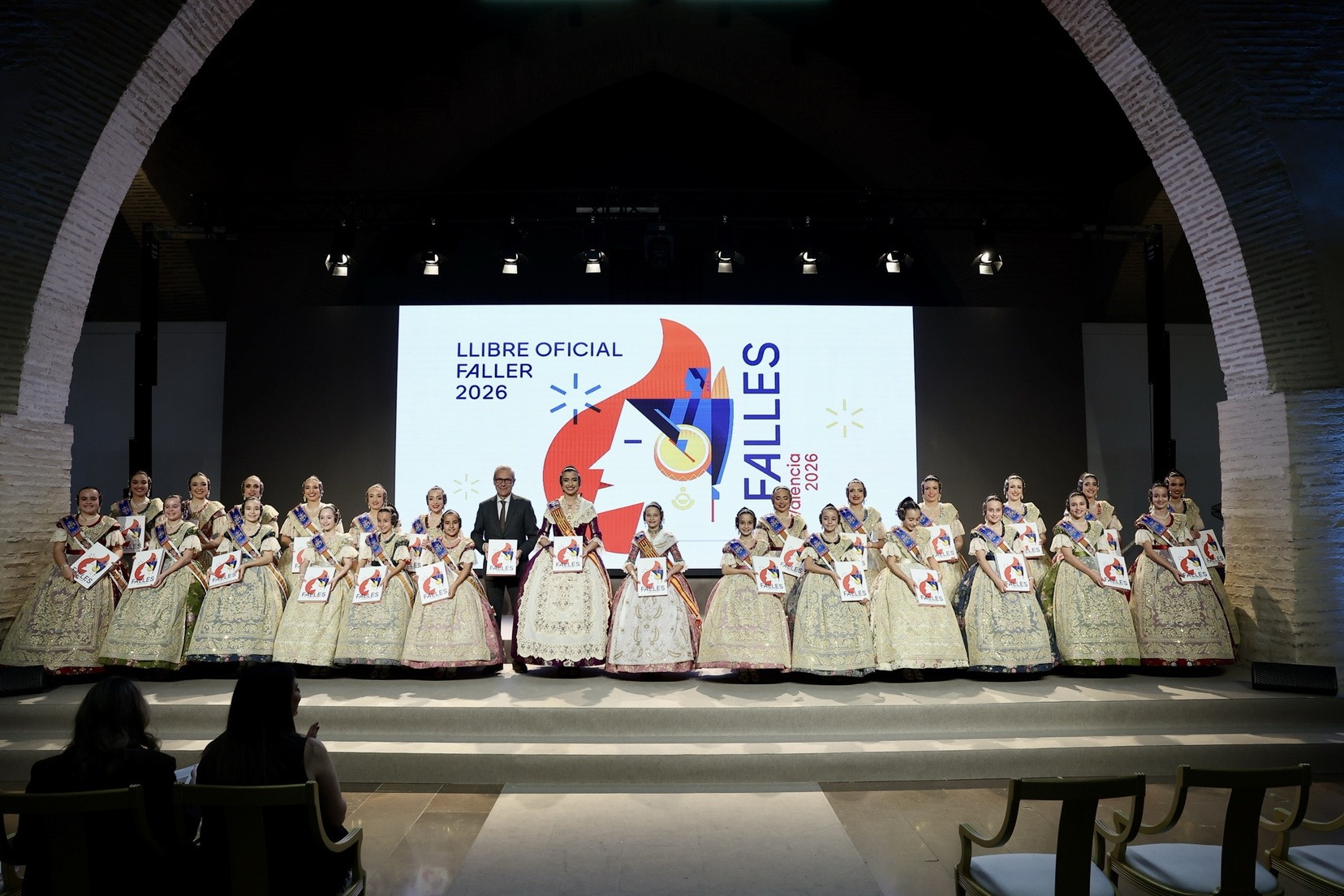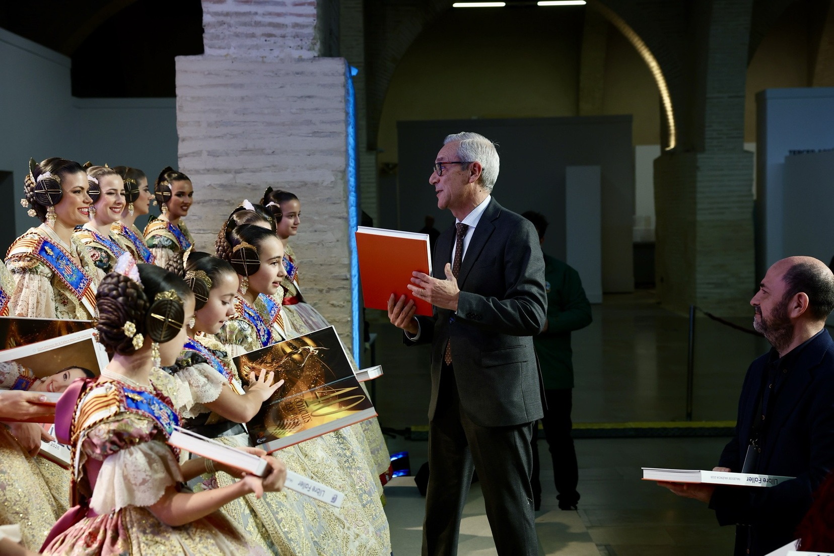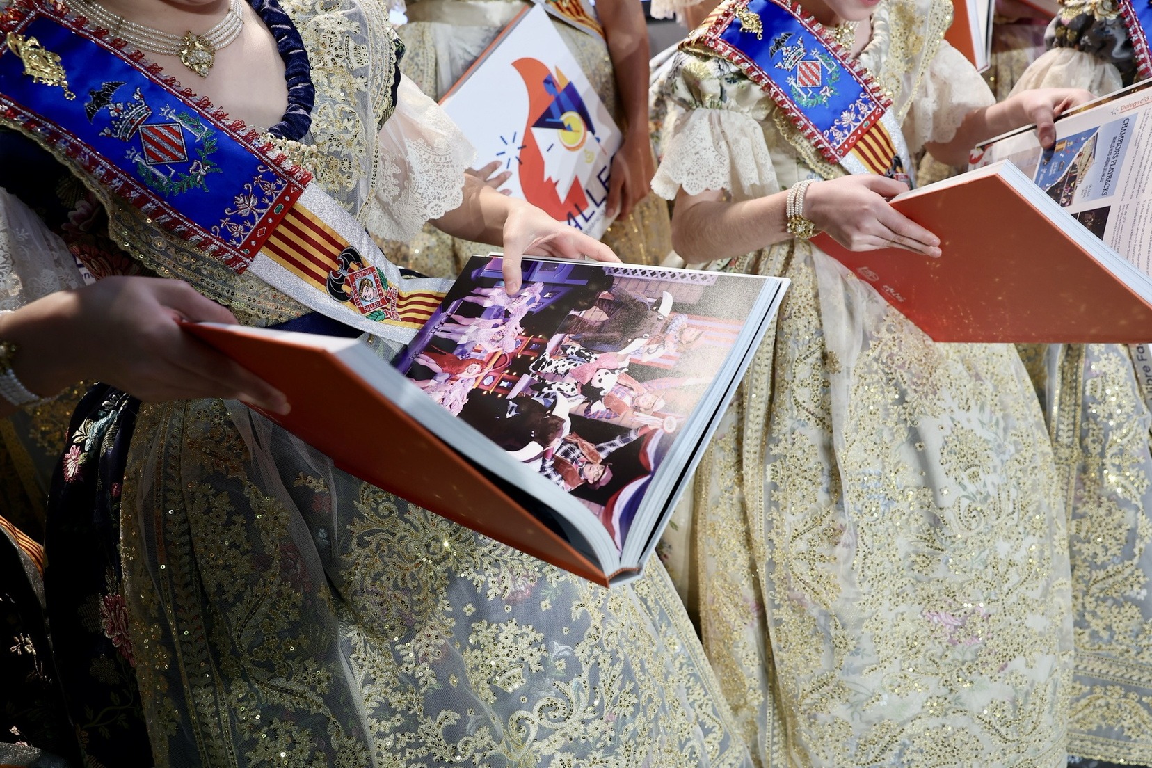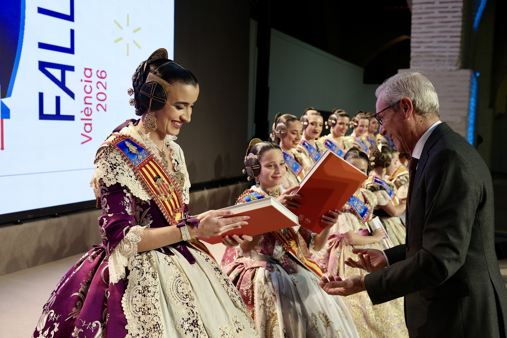 La Fallera Major de València, Carmen Prades, i la Fallera Major Infantil de València, Marta Mercader, junt amb les seues Corts d’Honor, han rebut un exemplar de mans del regidor de Falles i president de la Junta Central Fallera, Santi Ballester, un gest que ha simbolitzat la importància del llibre com a memòria de les Falles més especials de les seues vides.