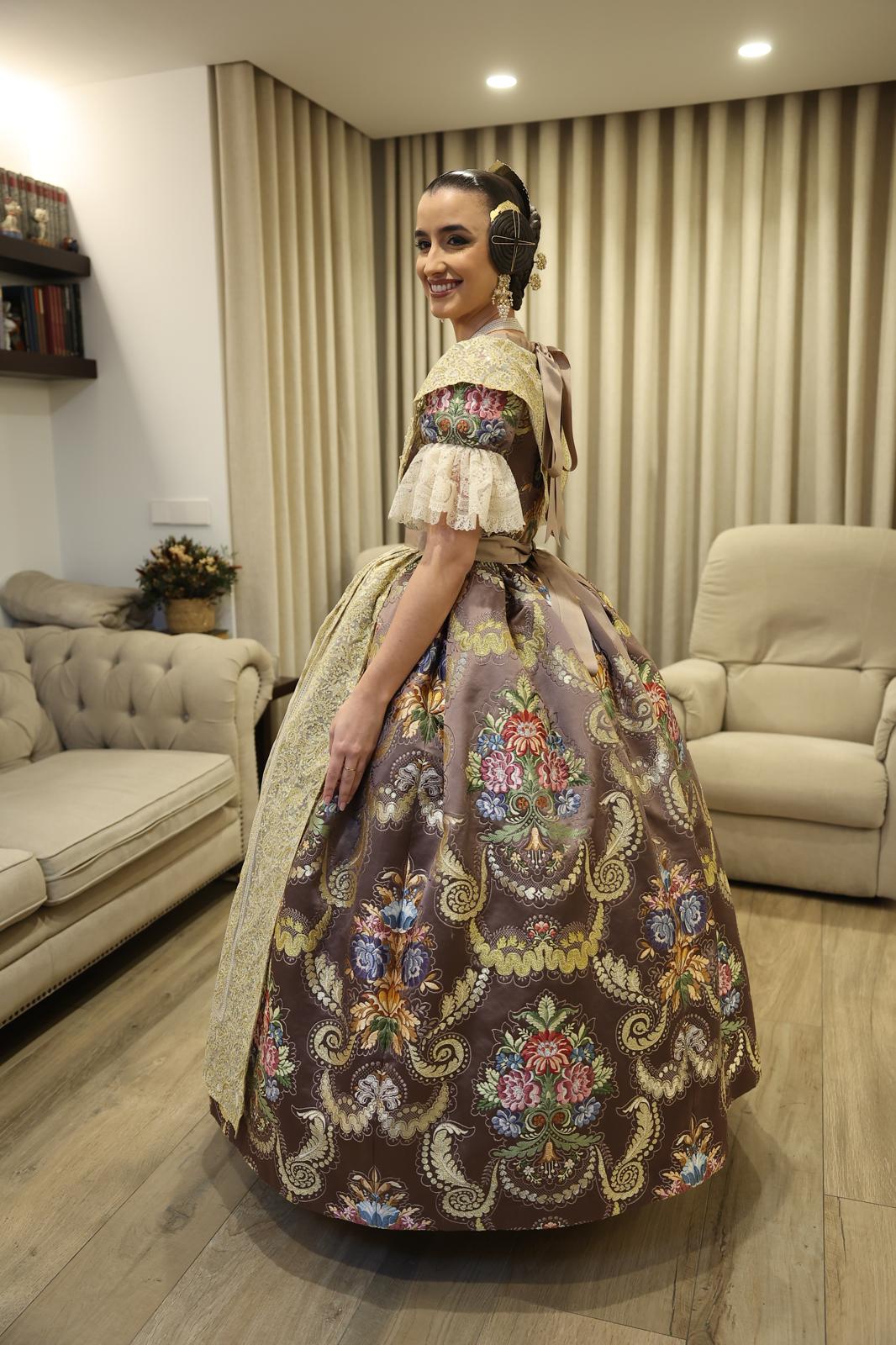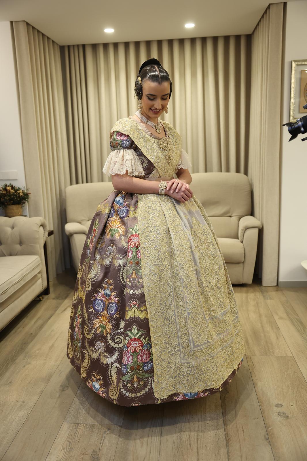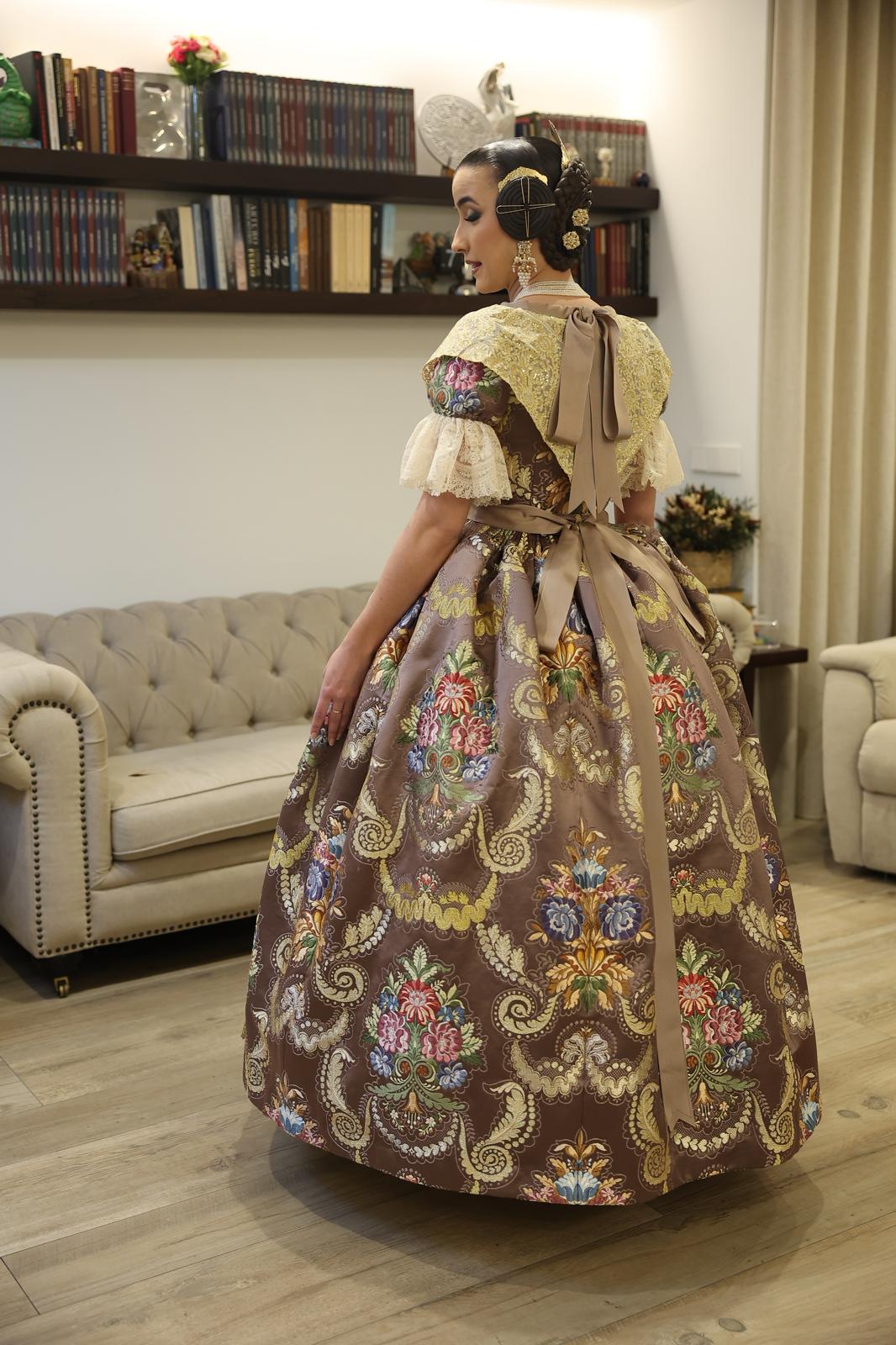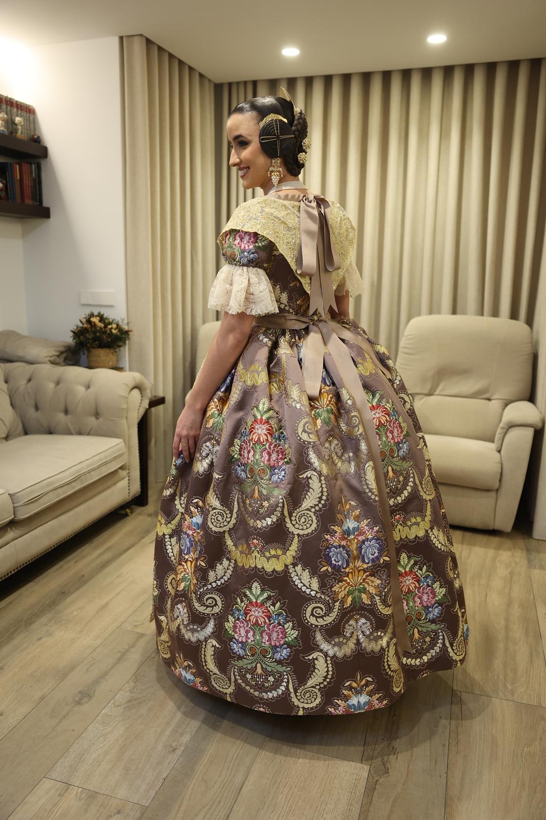 Cap a les 19:30 hores de la vesprada, Carmen, radiant i molt emocionada, ha eixit de casa entre els aplaudiments de tots els congregats en eixe punt i, per fi, hem pogut conéixer el secret més ben guardat, el color del seu espolí: ‘Terreta’, teixit per Vives i Marí i confeccionat també per ‘Montaña Caballero’. Un nom triat com a homenatge a València i a totes les persones que en formen part.