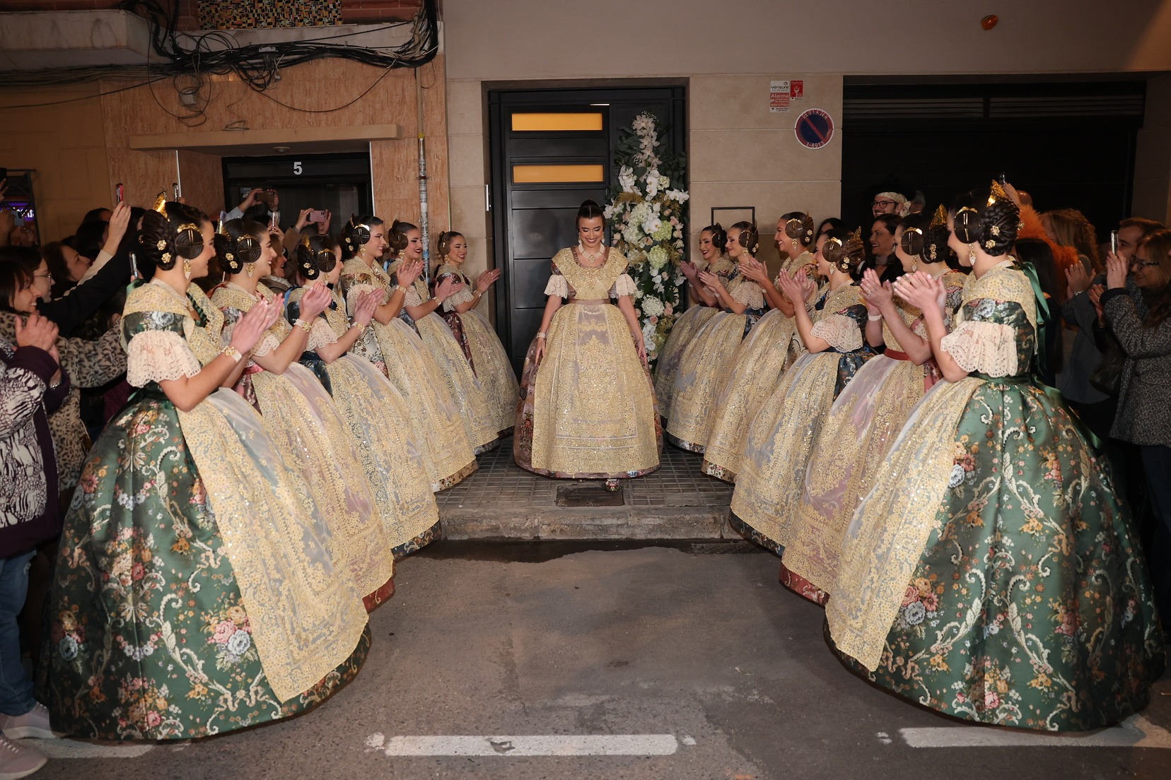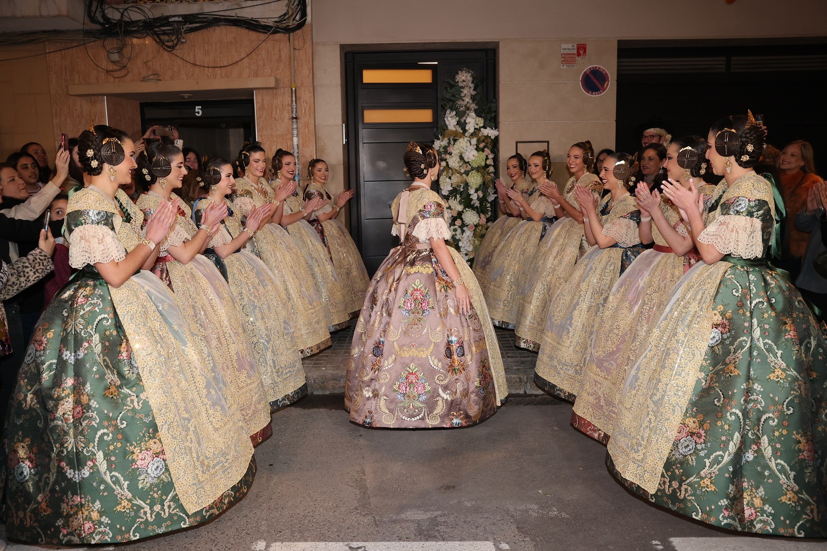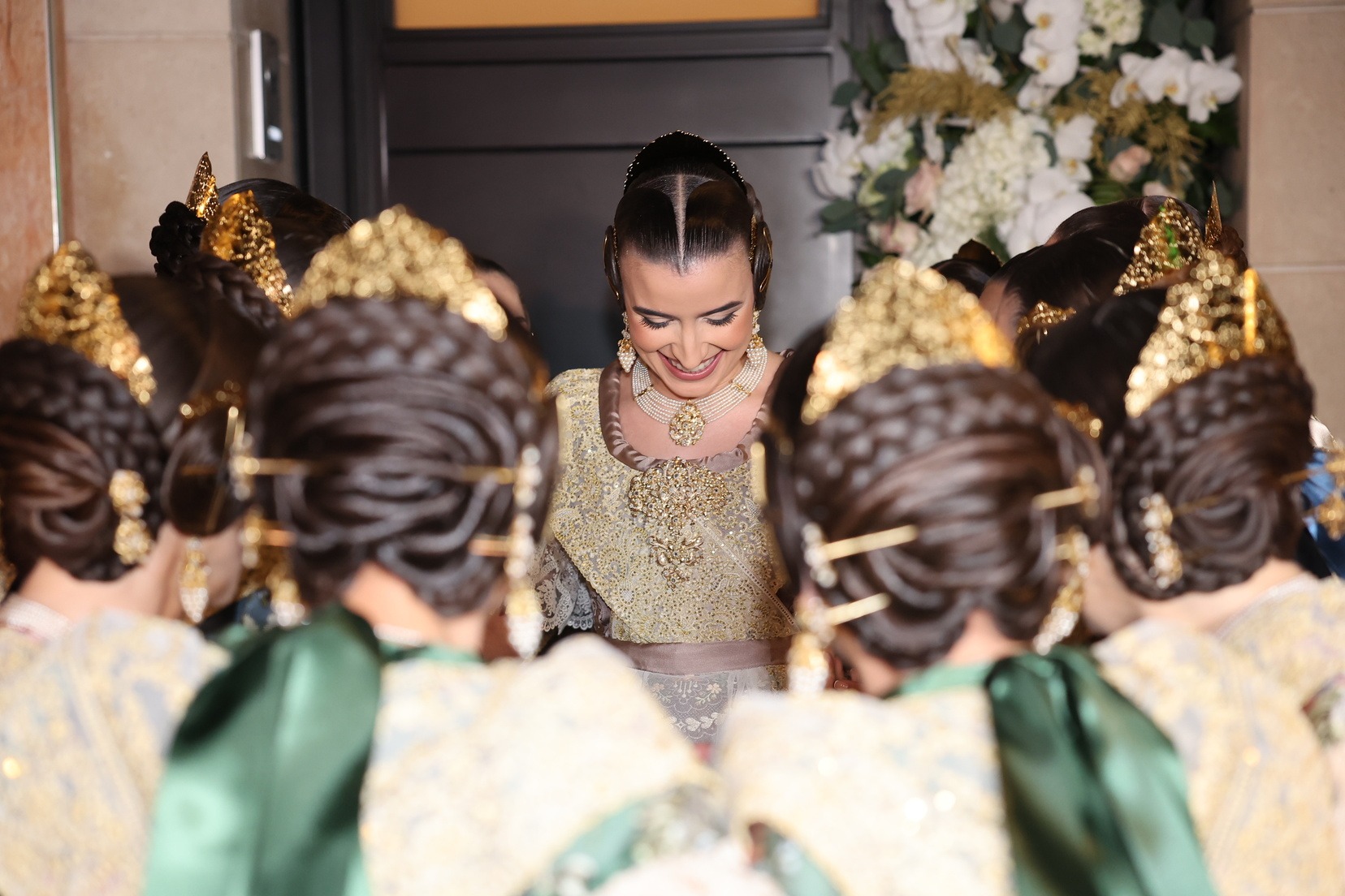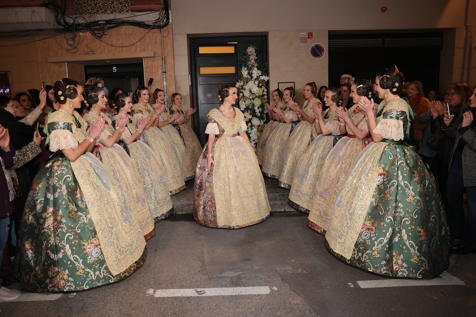 Les 12 components de la Cort d’Honor s’han dirigit, vestides amb els seus primers vestits oficials confeccionats per ‘Montaña Caballero’ amb les sedes de ‘Sedería Tradicional Valenciana’, a la casa de la nostra Fallera Major de València, Carmen Prades, per a conéixer de primera mà el color triat per al seu espolí i, com no, per a abrigallar i expressar la seua estima a la Fallera Major de València en esta nit tan especial per a elles i per al món faller.