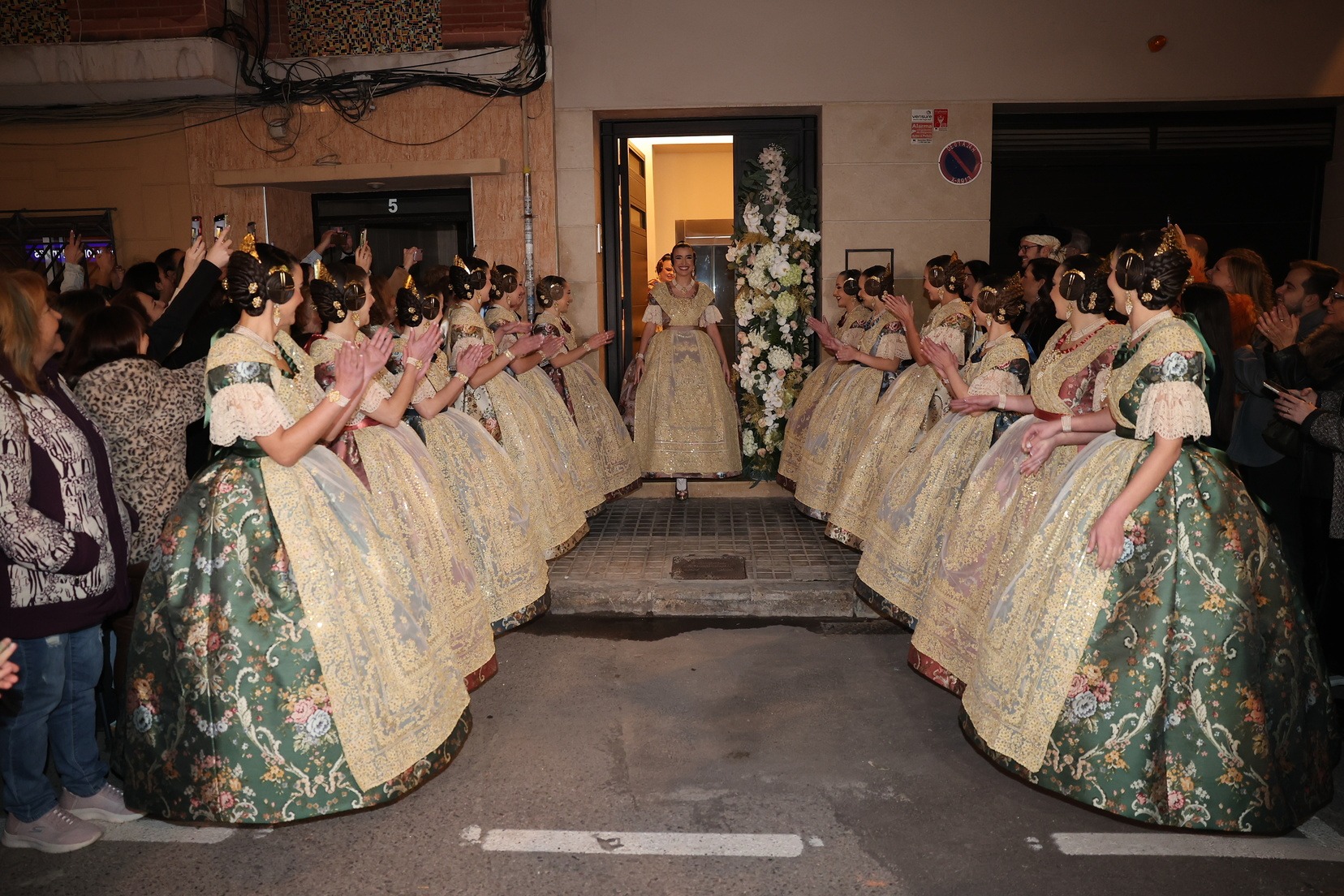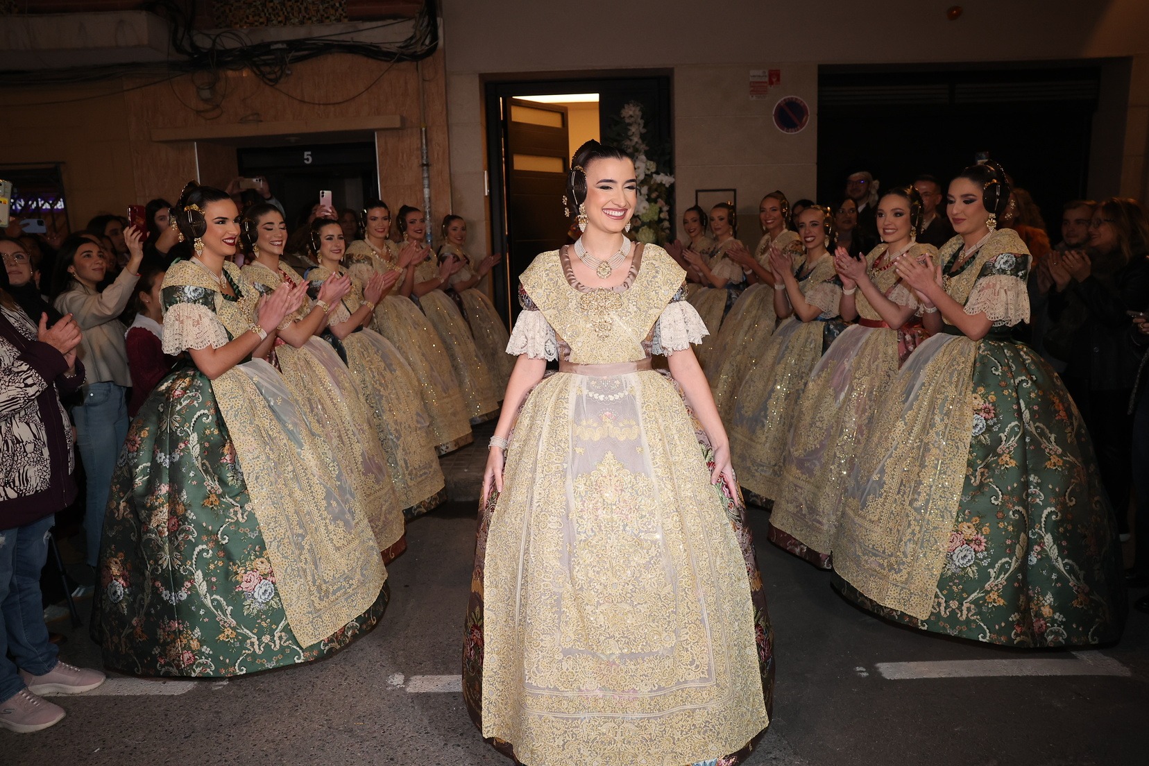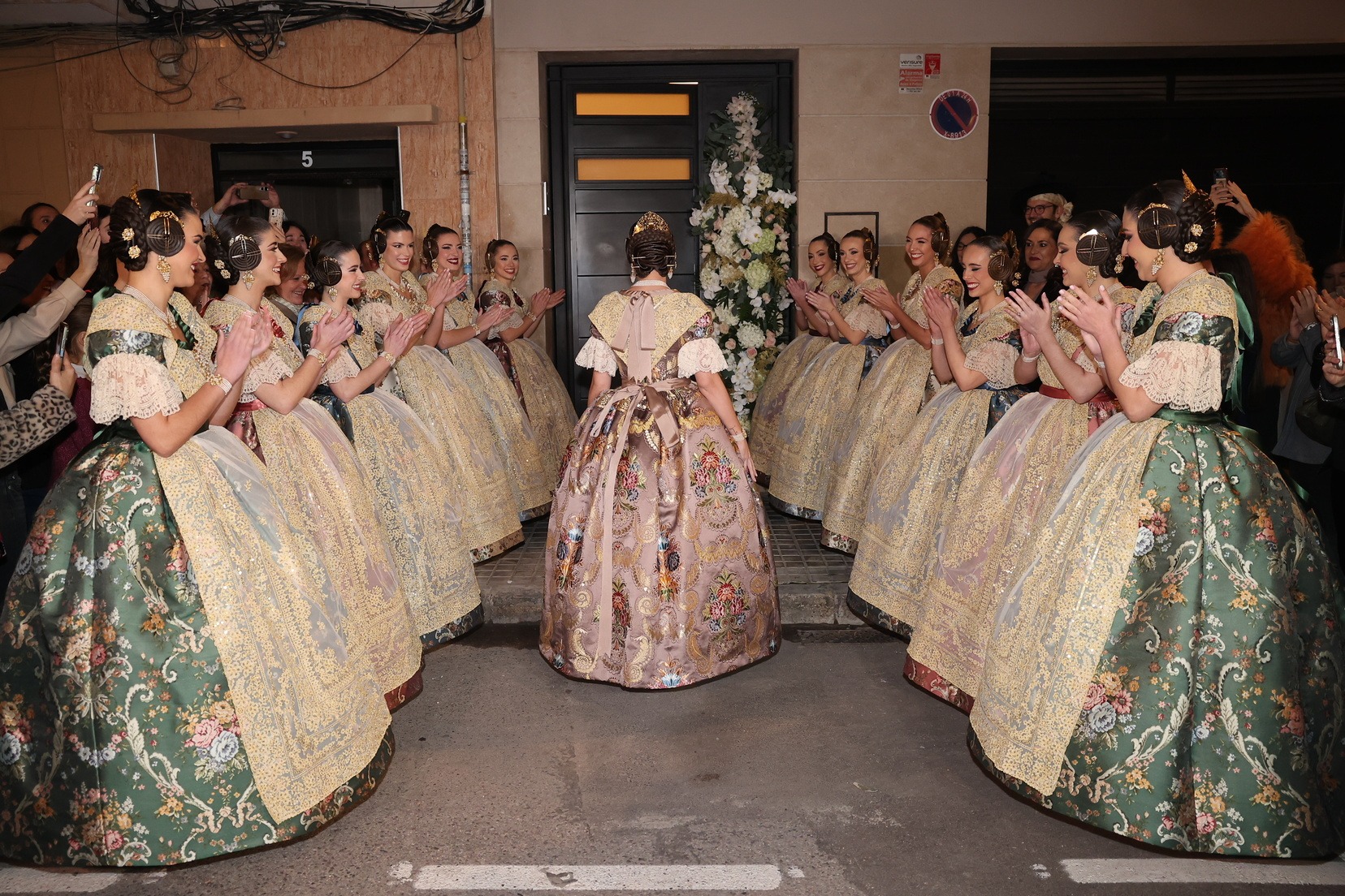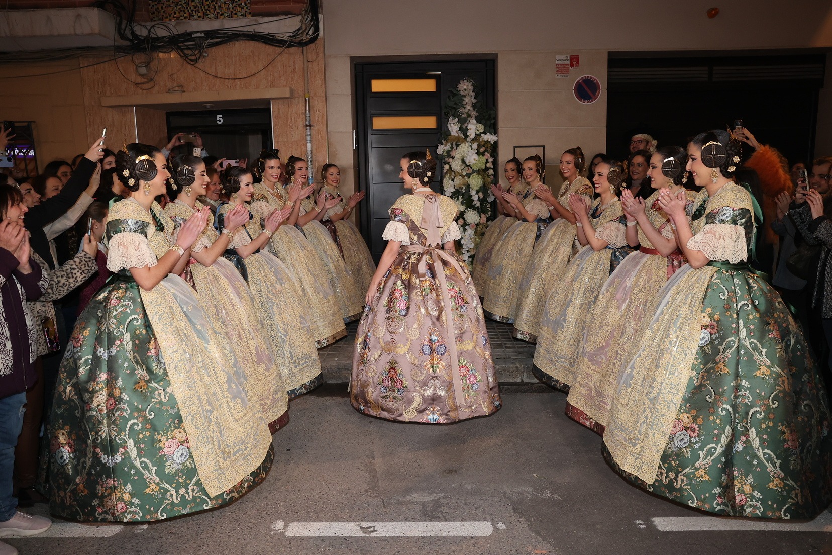 Les 12 components de la Cort d’Honor s’han dirigit, vestides amb els seus primers vestits oficials confeccionats per ‘Montaña Caballero’ amb les sedes de ‘Sedería Tradicional Valenciana’, a la casa de la nostra Fallera Major de València, Carmen Prades, per a conéixer de primera mà el color triat per al seu espolí i, com no, per a abrigallar i expressar la seua estima a la Fallera Major de València en esta nit tan especial per a elles i per al món faller.
